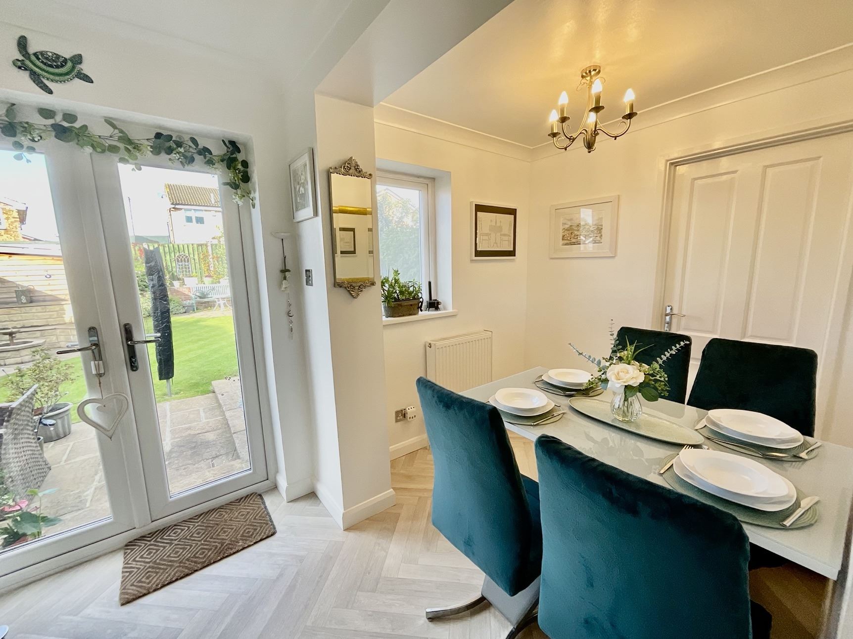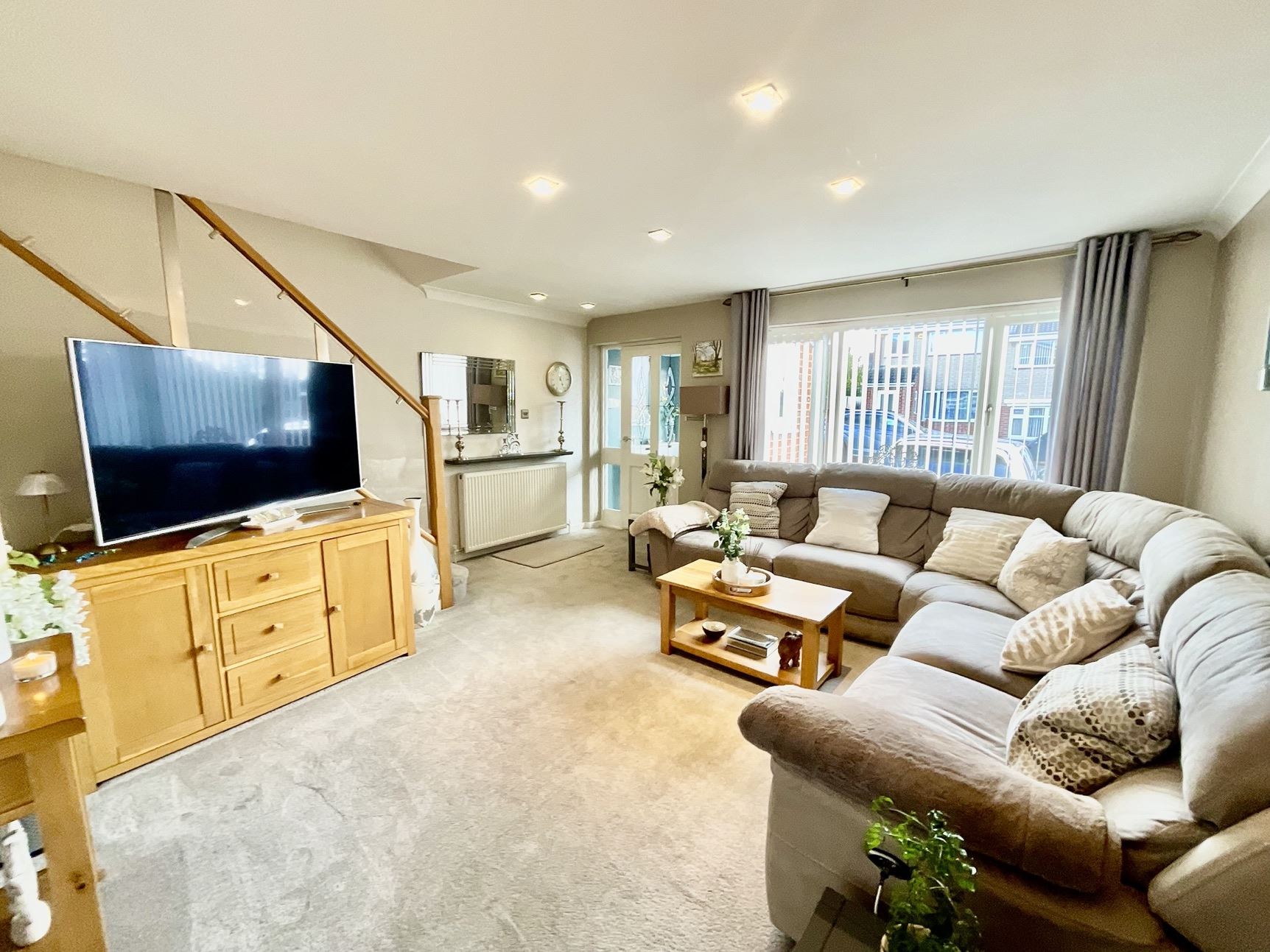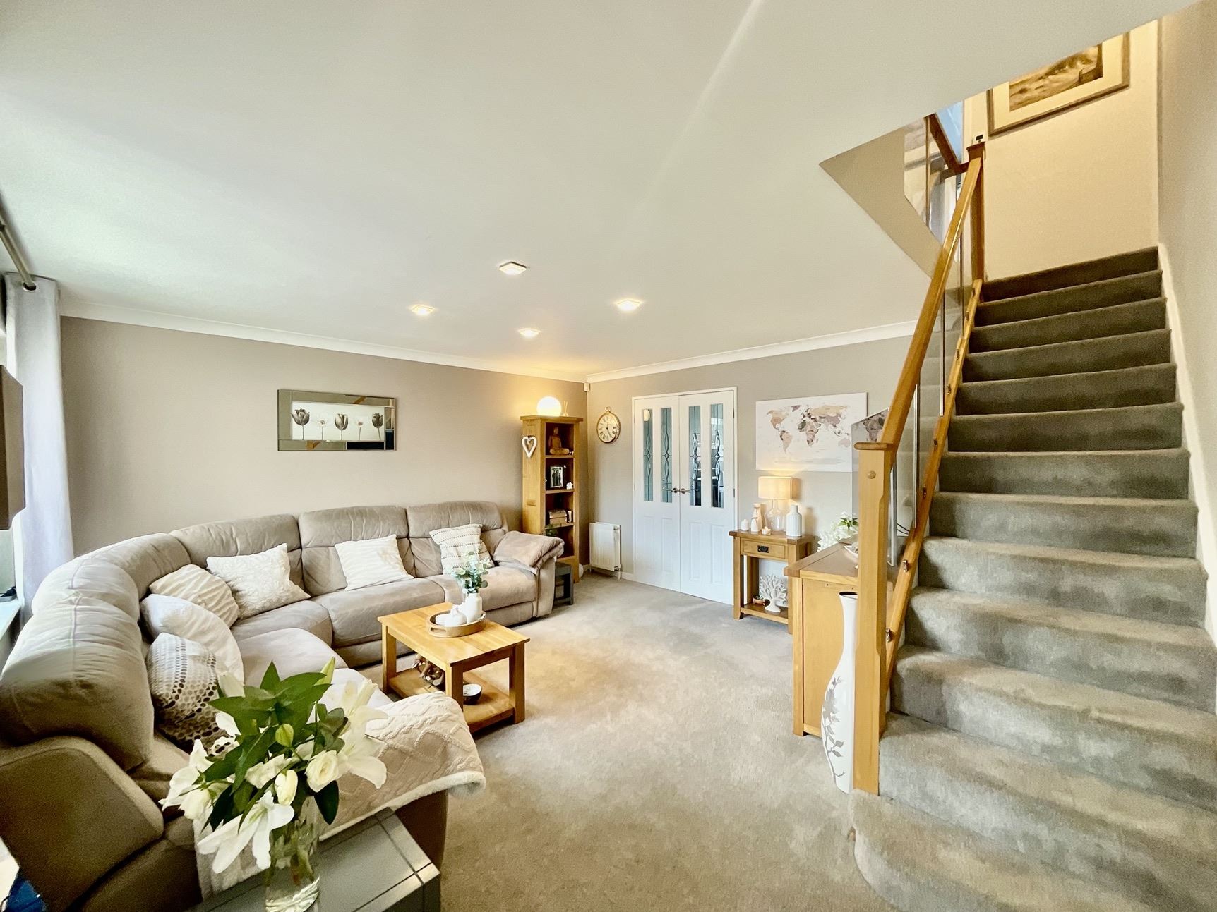 Beautiful lounge with a front facing window, internal French doors open into the kitchen/diner.