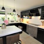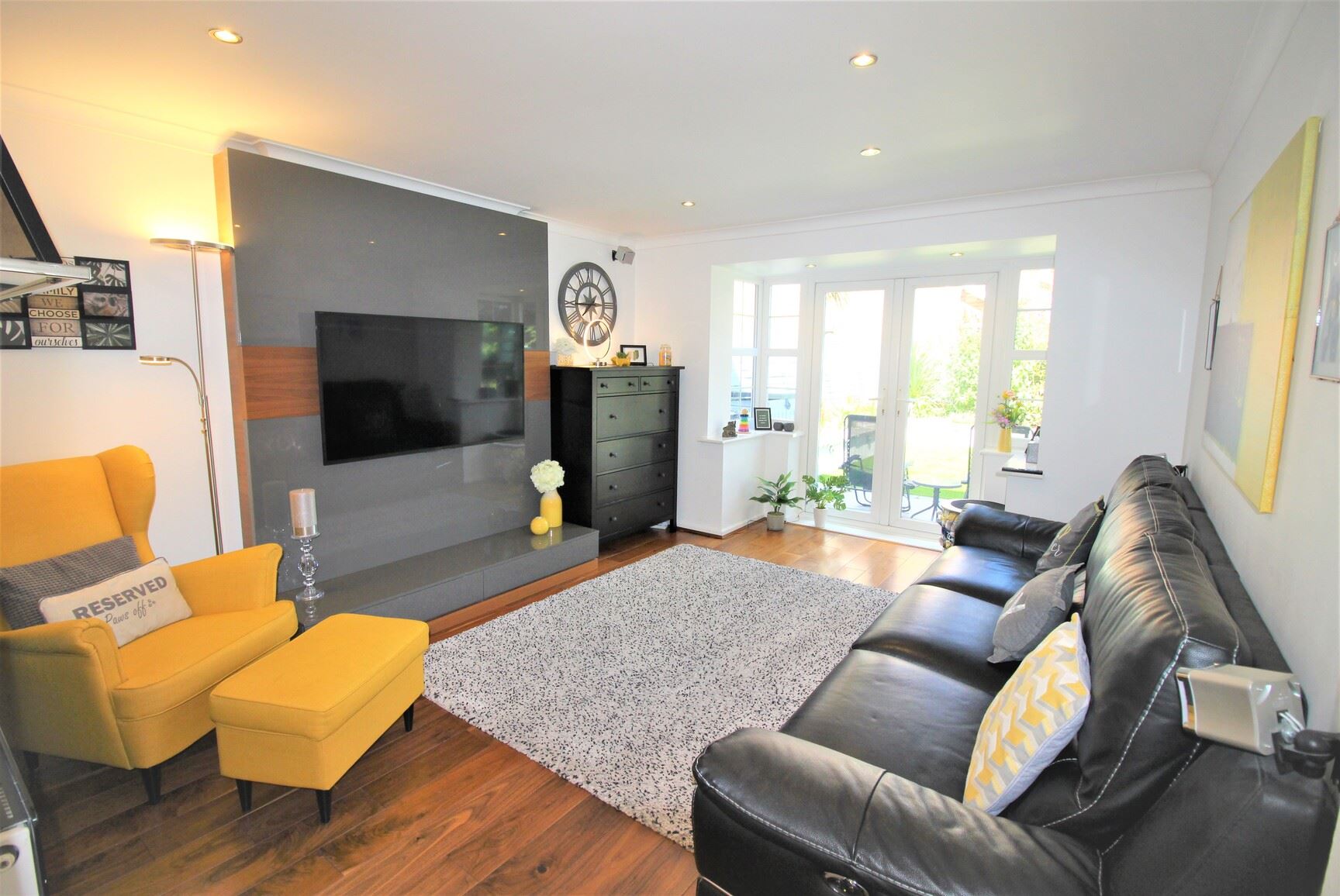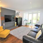 The welcoming hallway leads to a stylish lounge featuring a charming walk-in bay window and French doors that open onto the rear garden, creating a bright and airy space. The modern kitchen is fitted with a range of sleek wall and base cabinets, complemented by contrasting work surfaces that extend into a convenient breakfast bar with seating. A separate dining room offers versatility and can also be used as a home office or playroom. A downstairs WC completes the ground floor.