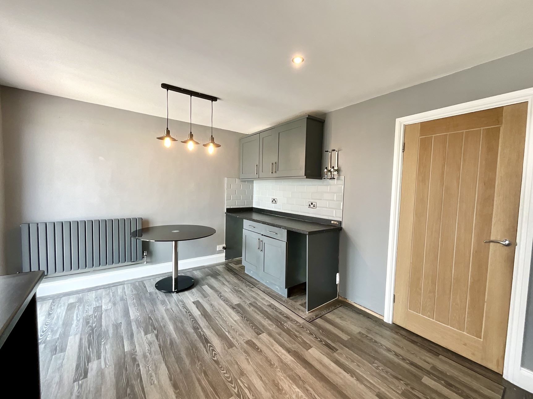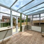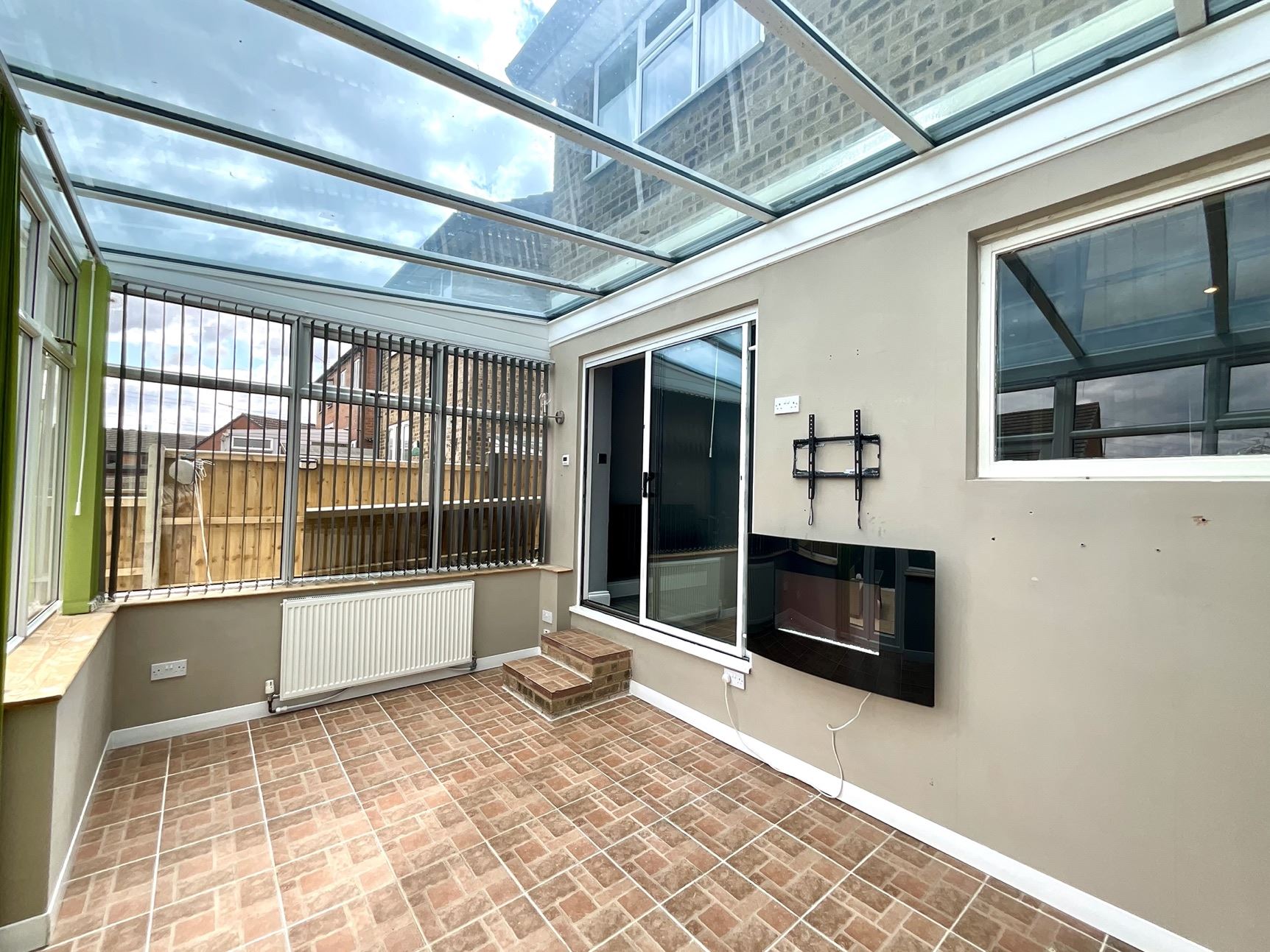 The kitchen is fitted with a range of wall and base cabinets complemented by contrasting work surfaces. Sliding French doors lead seamlessly into the conservatory, which serves as a versatile second reception room with a glass roof, central heating radiator, and French doors opening onto the rear garden—ideal for relaxing or entertaining.