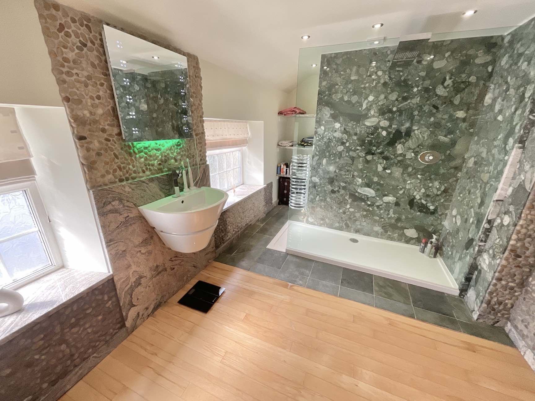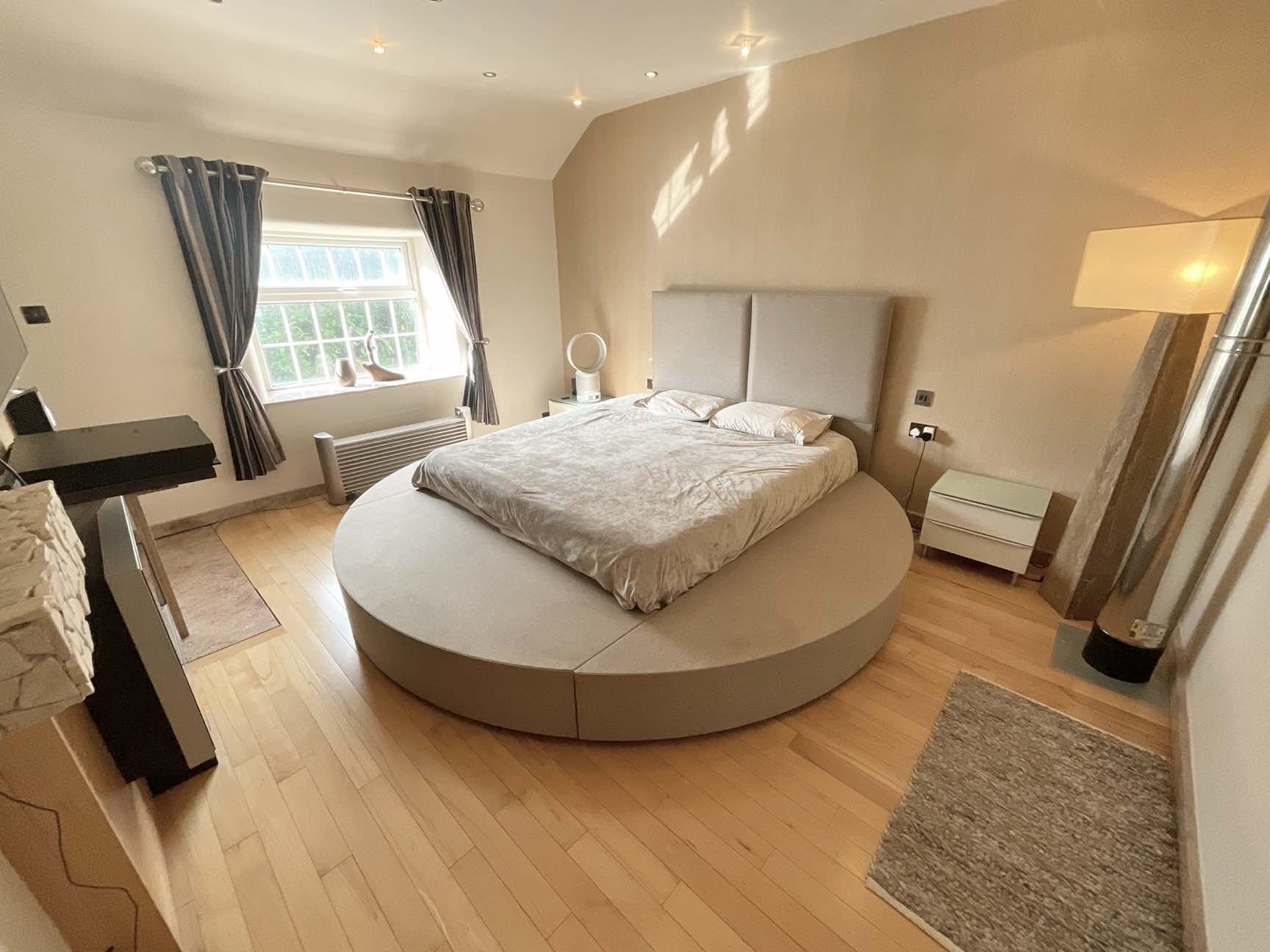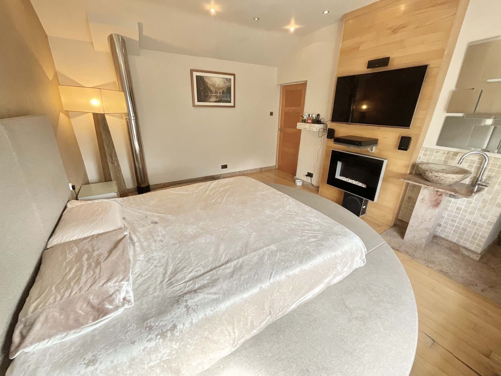 An imposing double staircases rises to the master bedroom with en suite shower room, three further good sized bedrooms and an exquisite family bathroom with separate shower enclosure.
