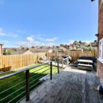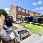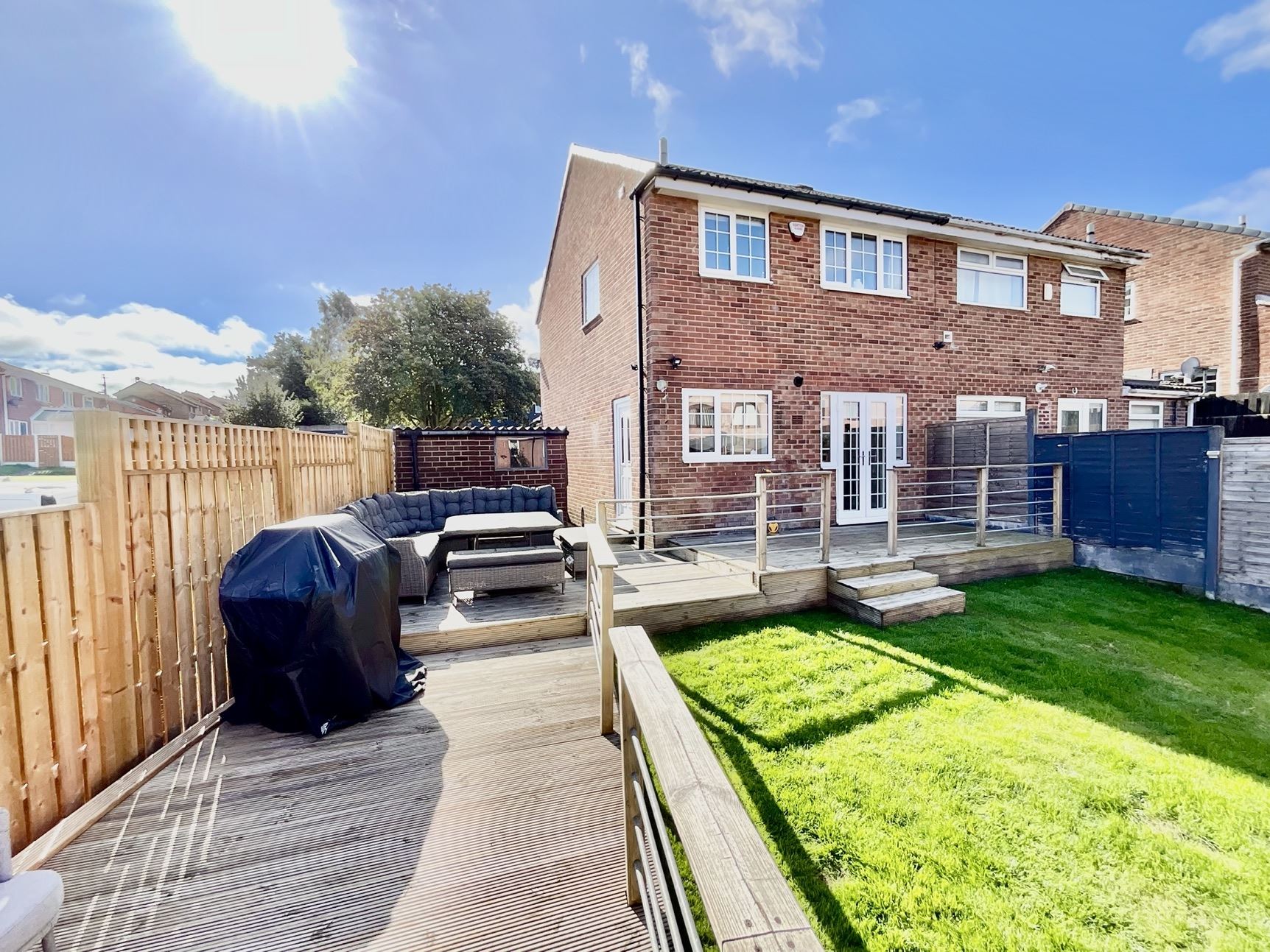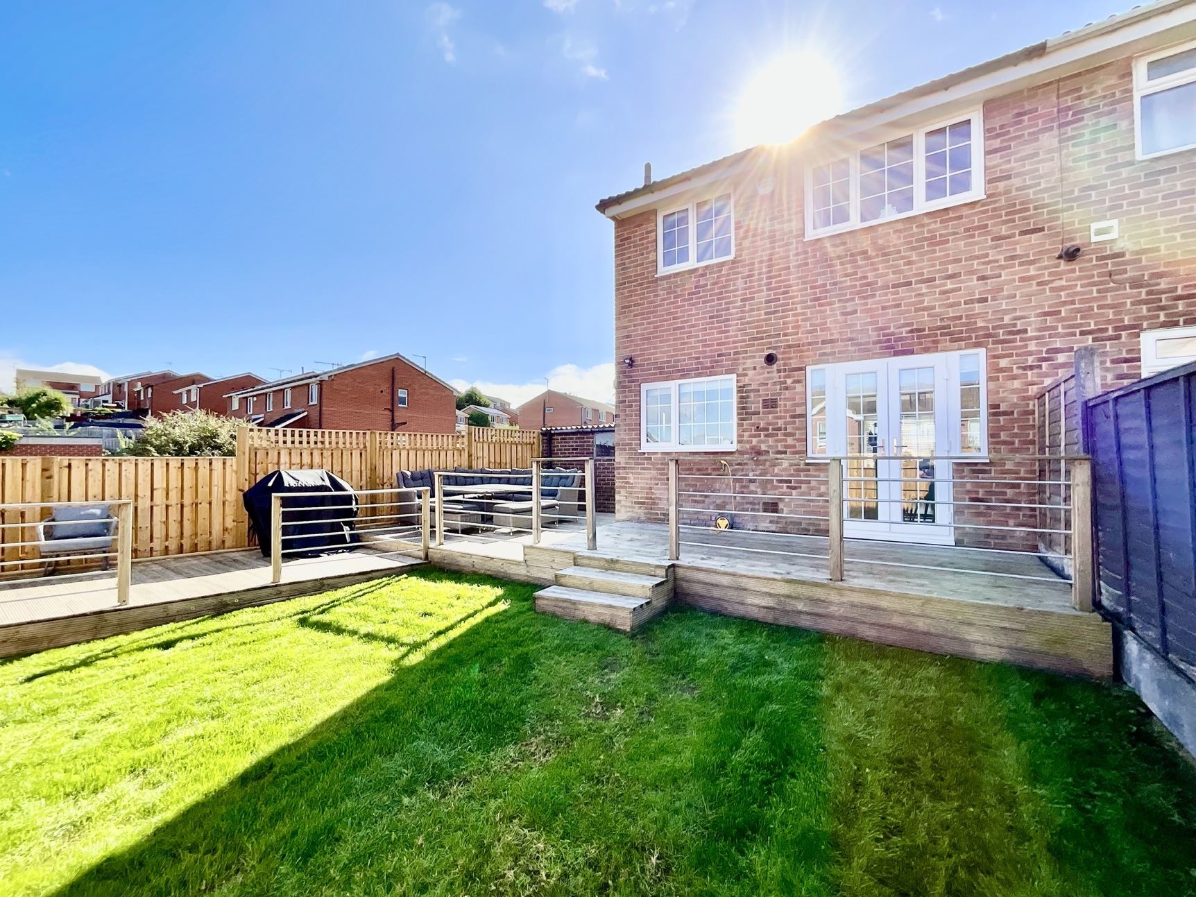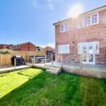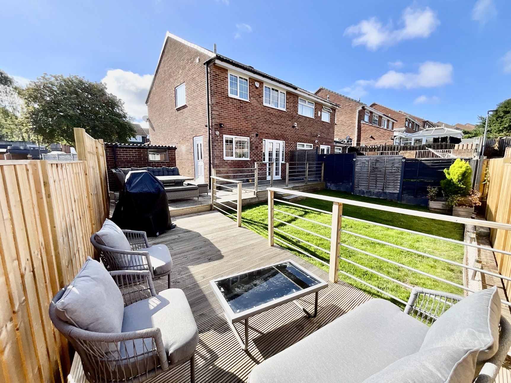 Enclosed low-maintenance rear garden with a raised decking area, perfect for entertaining