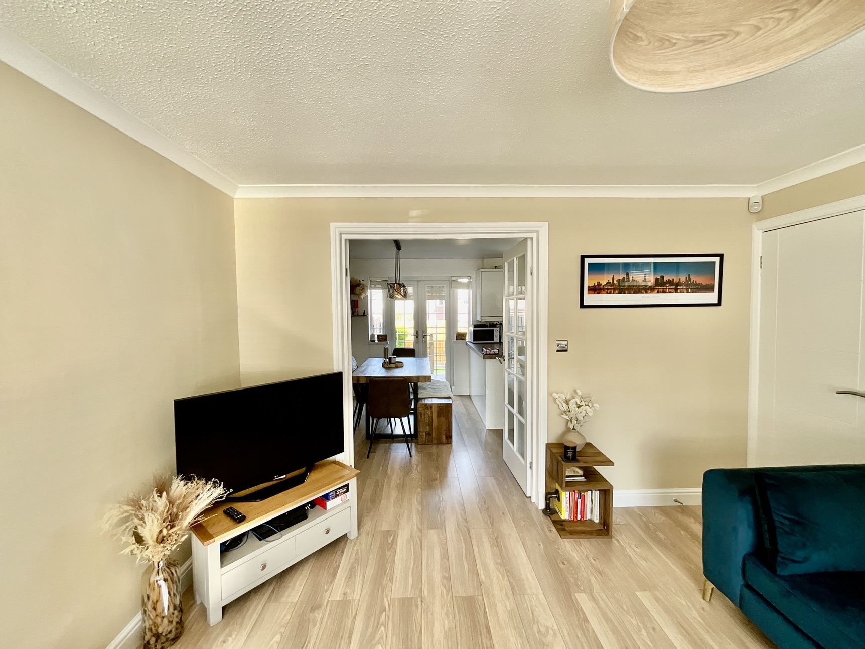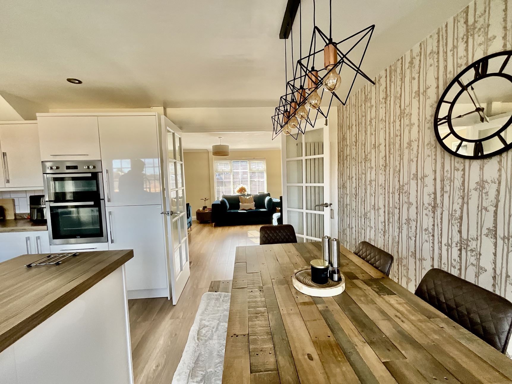 Open plan dining area with patio doors opening onto the garden