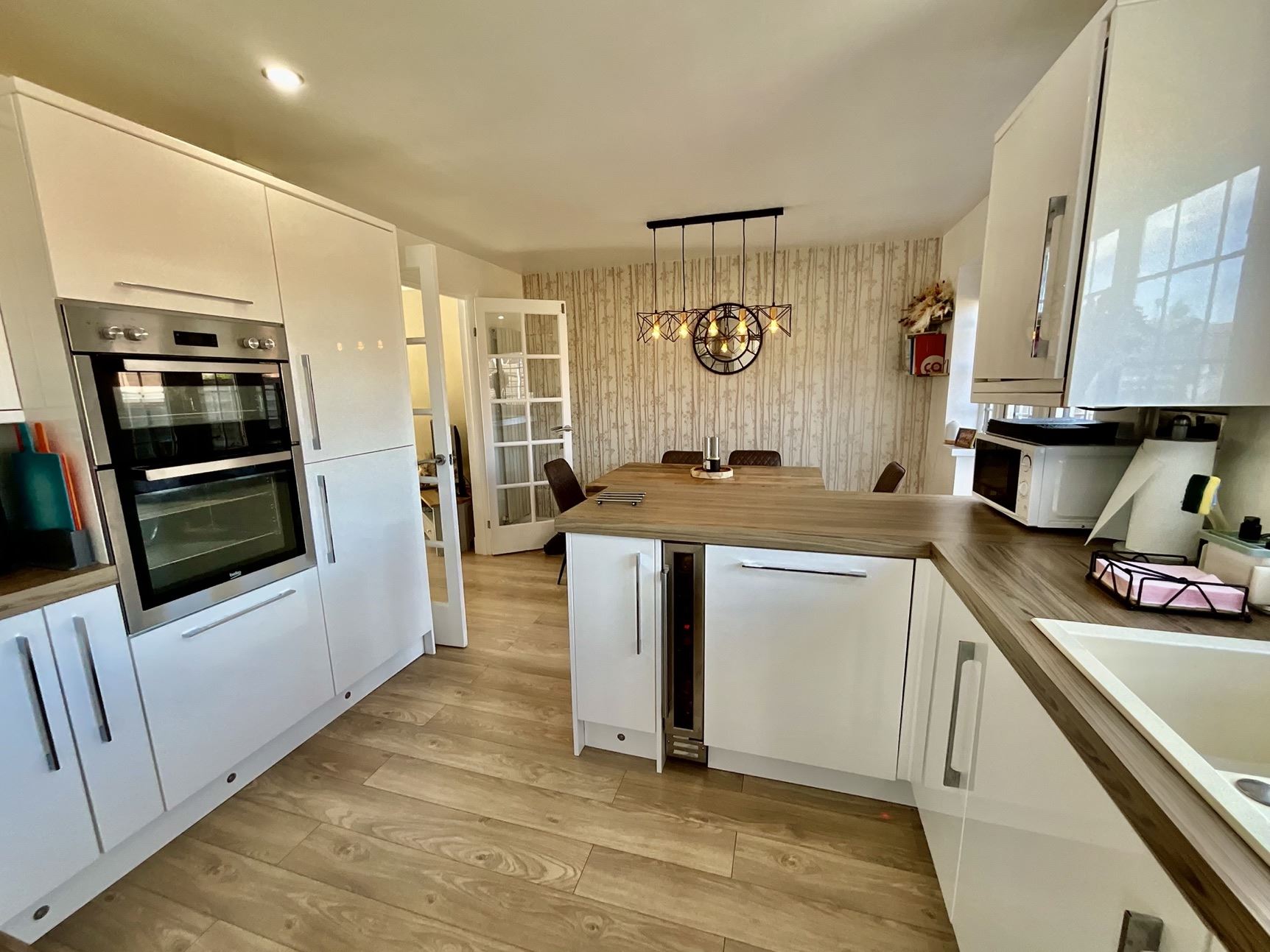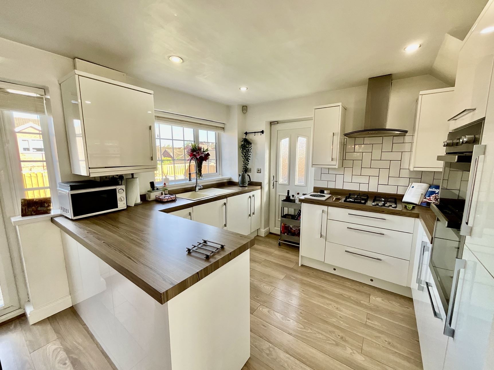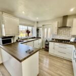 Stylish fitted kitchen with a range of matching wall and base units, ample work surfaces, and integrated appliances