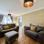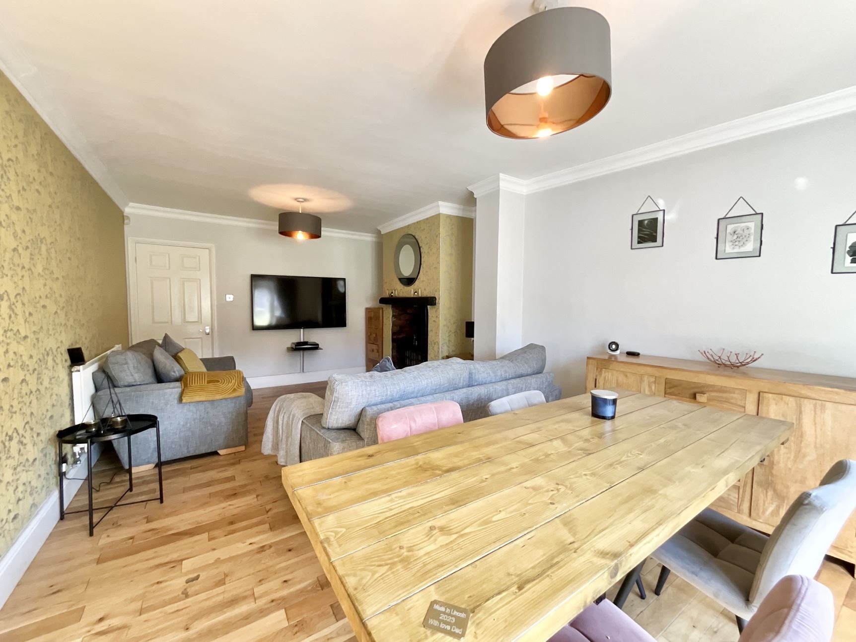 Step through the front porch into a welcoming hallway, leading to a lovely front lounge featuring a bay window that fills the room with natural light. To the rear, the heart of the home is a stunning open-plan living and dining space, complete with a log-burning stove set into a charming feature fireplace and French doors opening onto the rear garden—ideal for relaxing or entertaining.