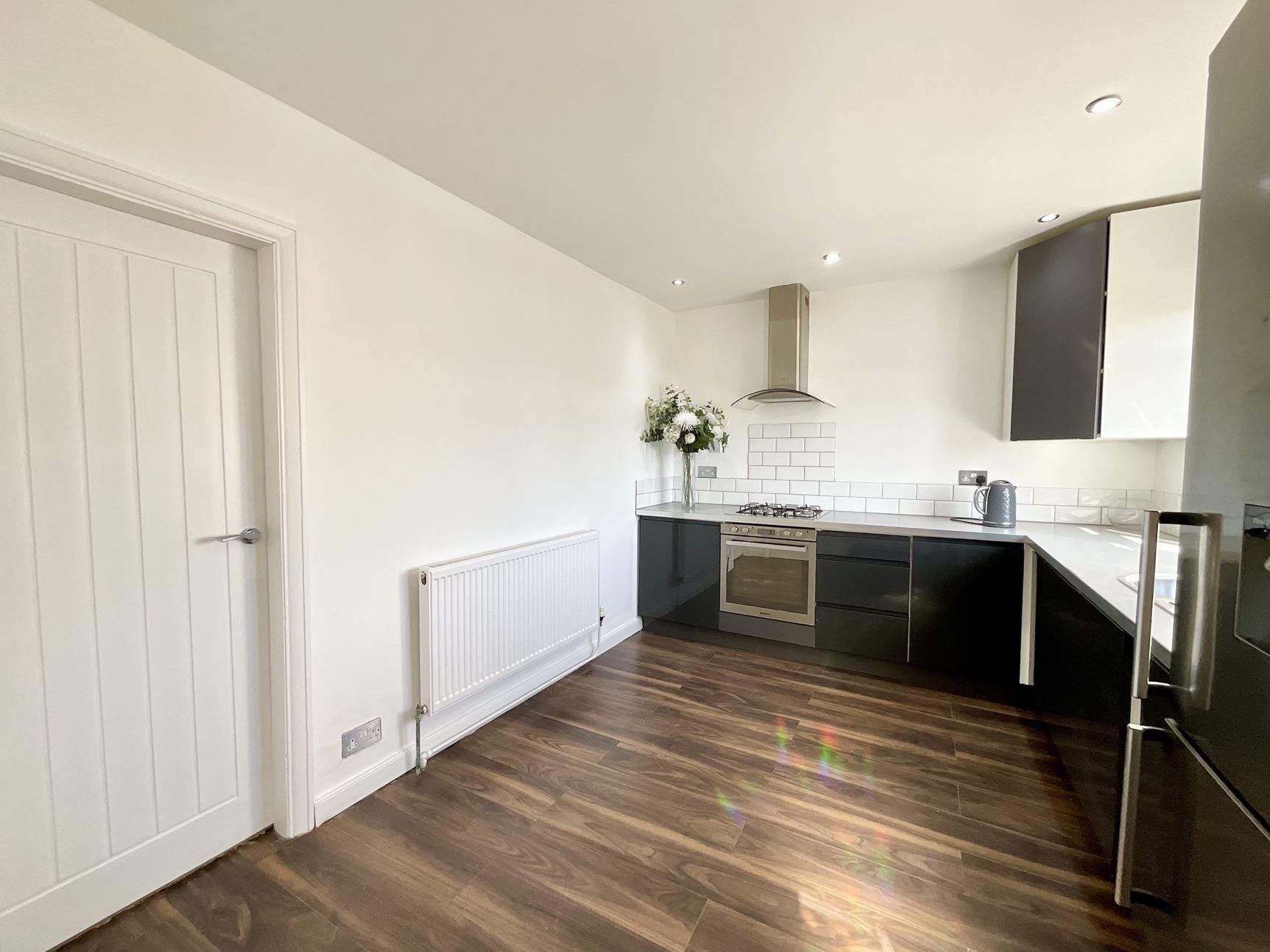 The modern kitchen/diner is fitted with a range of wall and base units, complemented by contrasting work surfaces and an inbuilt oven and hob. There is also a useful storage cupboard and a rear door opening out to the garden, making this an ideal space for everyday dining and entertaining.