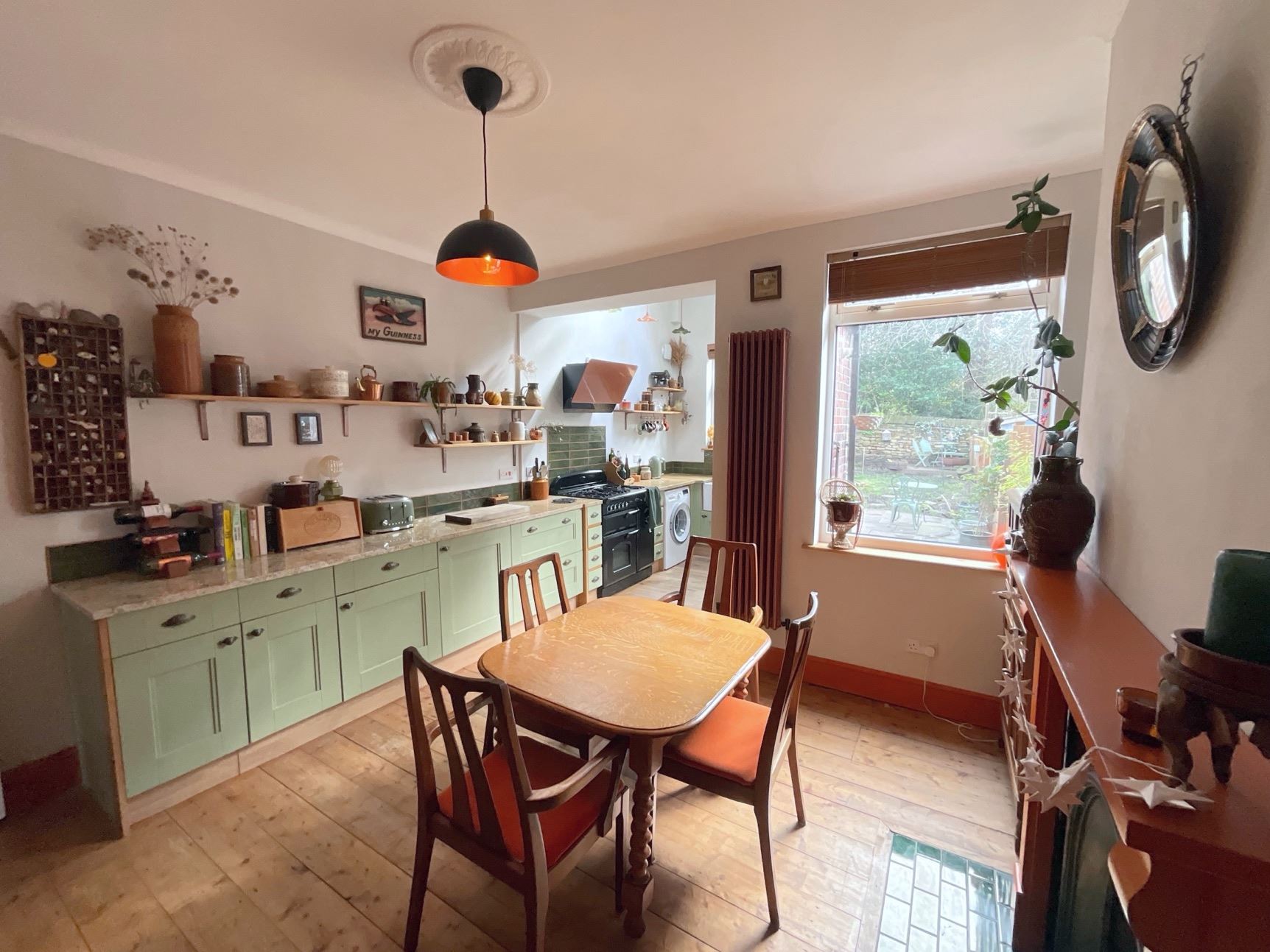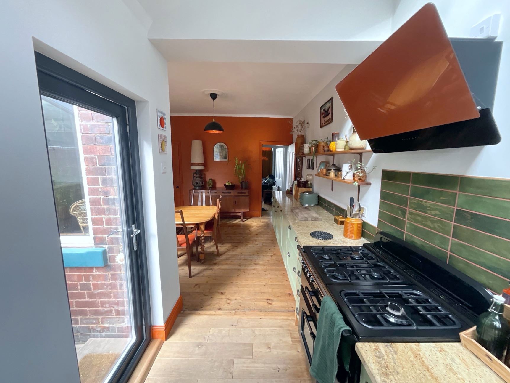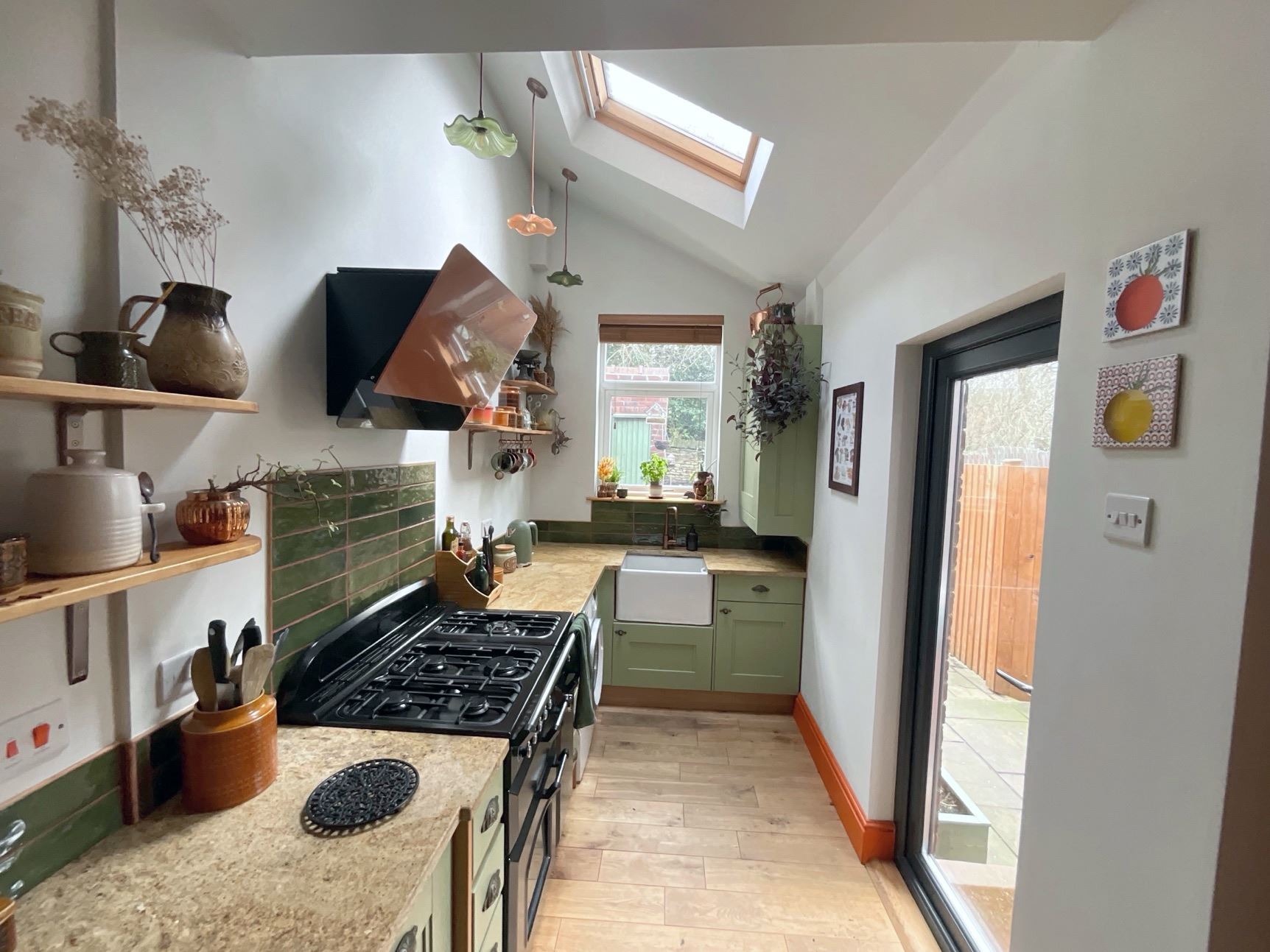 To the rear, the off-shot kitchen is well-equipped with a range of wall and base units and complementary work surfaces, incorporating a four-ring hob with extractor hood above and an integrated oven beneath. A skylight overhead floods the kitchen with natural light, creating a bright and airy feel to the space. There is plumbing for a washing machine, and a side door opens directly onto the rear garden, seamlessly connecting indoor and outdoor living.