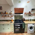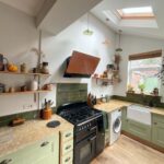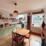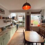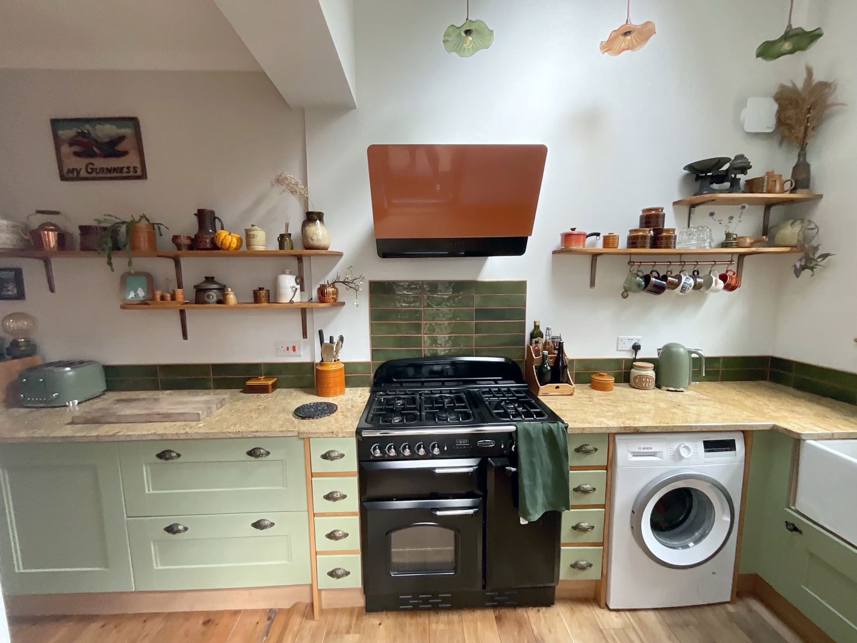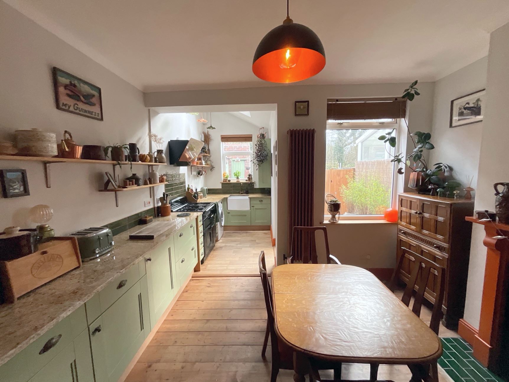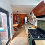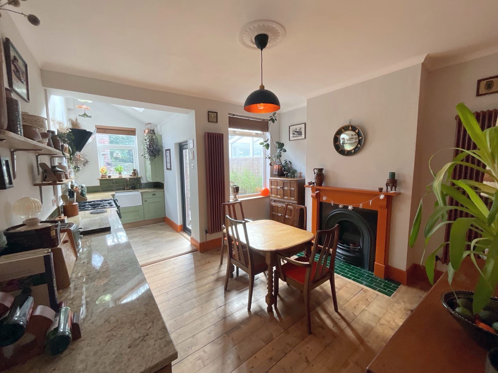 To the rear, the off-shot kitchen is well-equipped with a range of wall and base units and complementary work surfaces, incorporating a four-ring hob with extractor hood above and an integrated oven beneath. A skylight overhead floods the kitchen with natural light, creating a bright and airy feel to the space. There is plumbing for a washing machine, and a side door opens directly onto the rear garden, seamlessly connecting indoor and outdoor living.