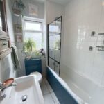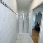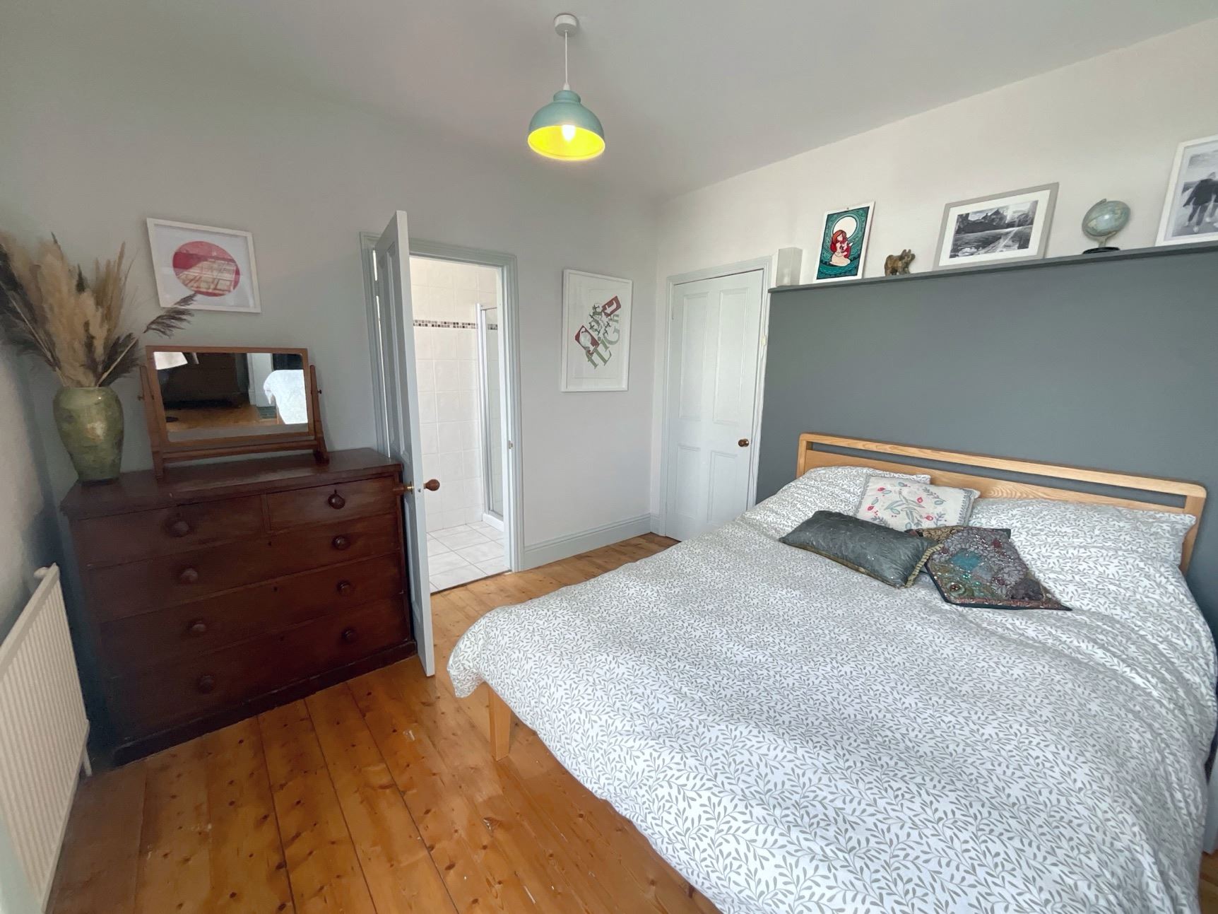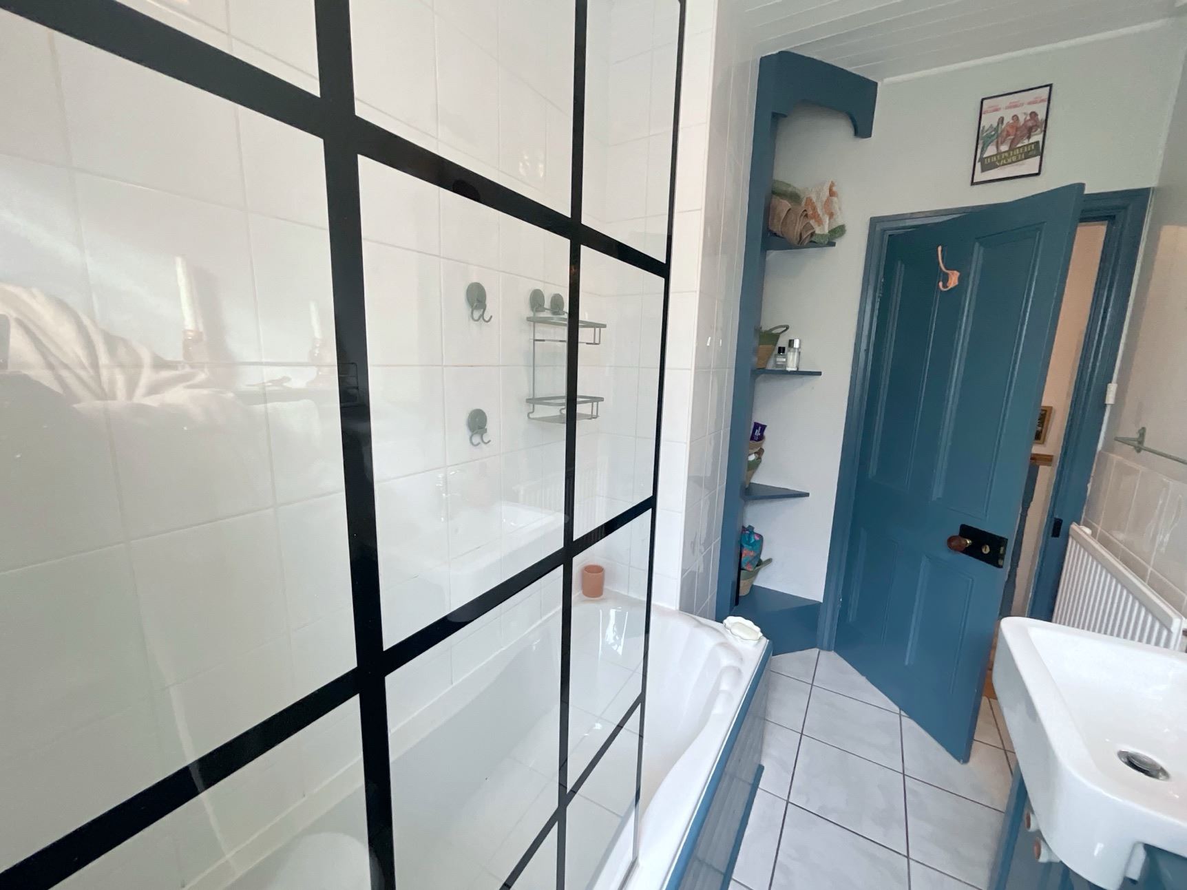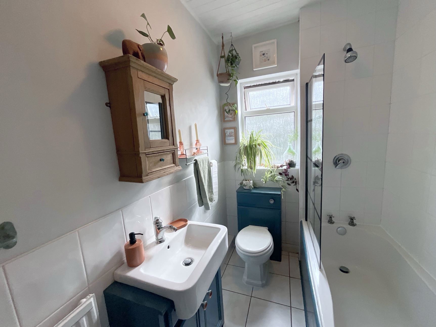 On the first floor, the landing gives access to two well-proportioned bedrooms, including a generous principal bedroom with built-in storage and its own en-suite shower room complete with enclosed shower cubicle and wash hand basin. The family bathroom is fitted with a modern white suite comprising a bath with shower over and glass screen, wash hand basin, and low flush WC.
