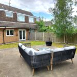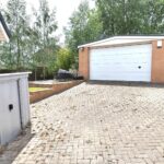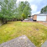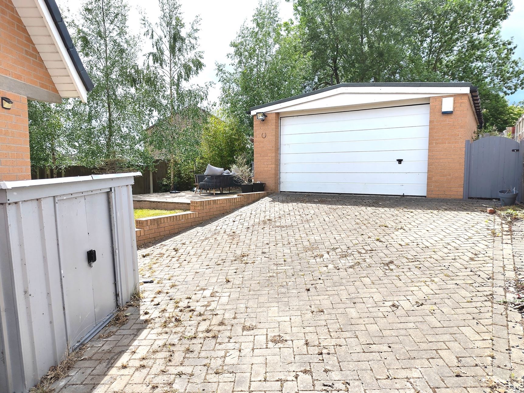 To the front of the property is a neatly maintained lawned garden, and an adjacent block-paved driveway providing off-road parking for three vehicles. Secure double metal gates open to reveal a substantial detached double garage. The generously sized rear garden is predominantly laid to lawn and features a patio area—perfect for alfresco dining and entertaining.