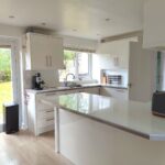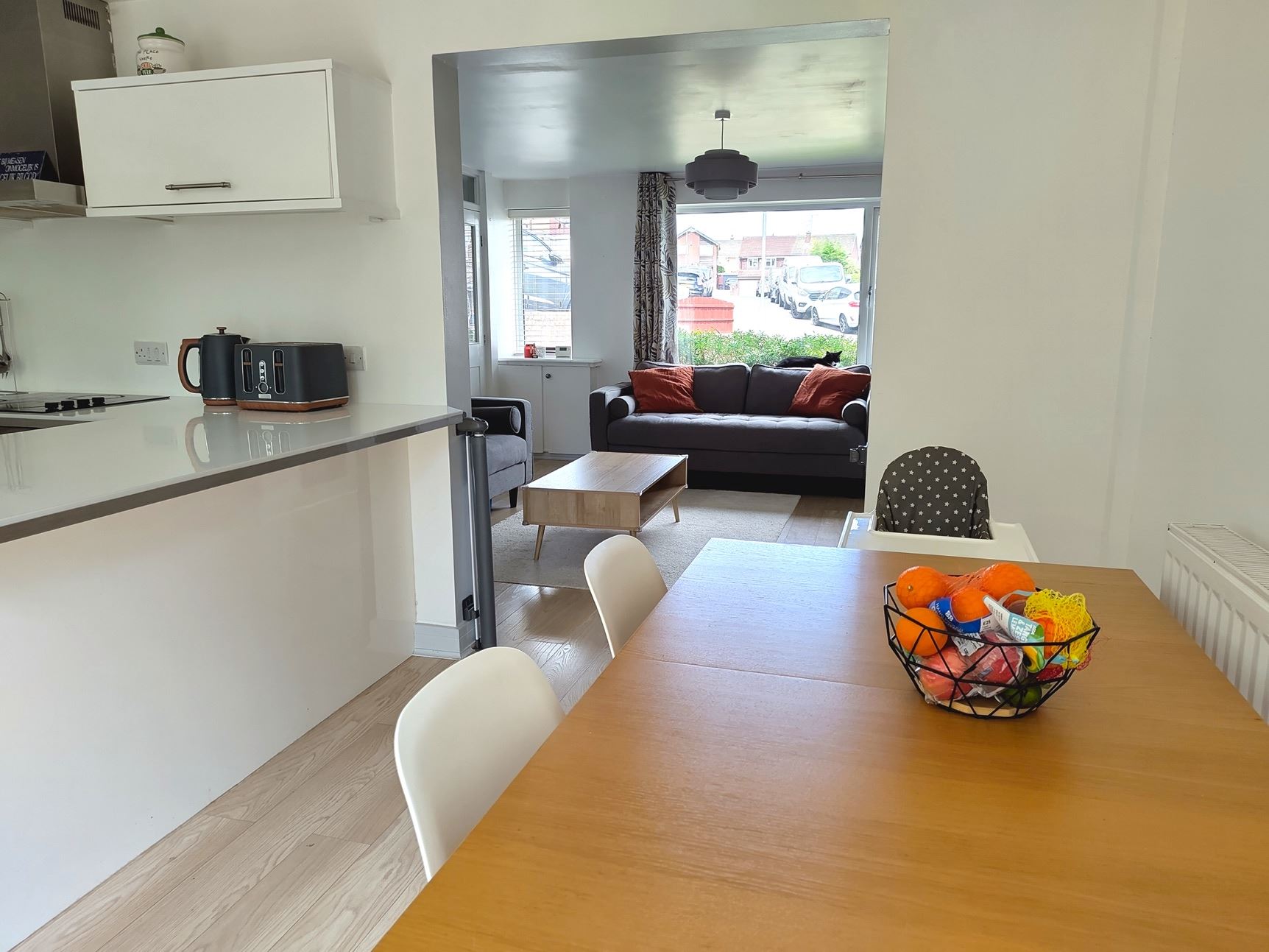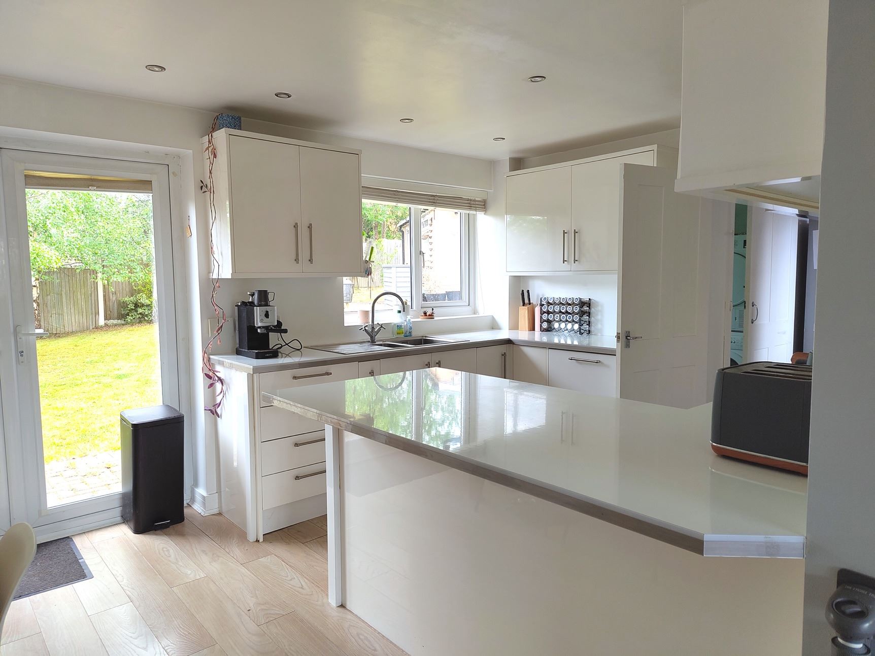 The welcoming entrance hallway features stairs rising to the first floor and French doors opening into the elegant lounge with front-facing window and a charming feature fireplace. The heart of the home is the superb kitchen/diner, fitted with a sleek range of white high gloss wall, drawer, and base units, complemented by stylish work surfaces. Integrated appliances include a four-ring hob with extractor above and an inbuilt oven. French uPVC double doors provide access to the rear garden, ideal for indoor-outdoor living.