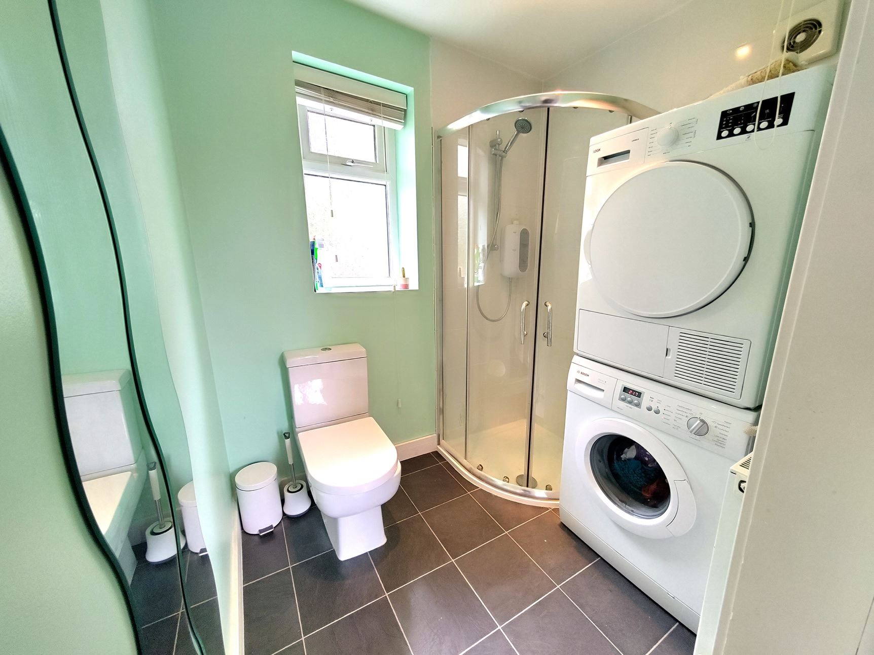 A separate utility room continues the high gloss finish and offers plumbing for a washing machine and space for a tumble dryer. Convenient sliding doors lead into the contemporary downstairs shower room, which comprises an enclosed shower cubicle and WC.