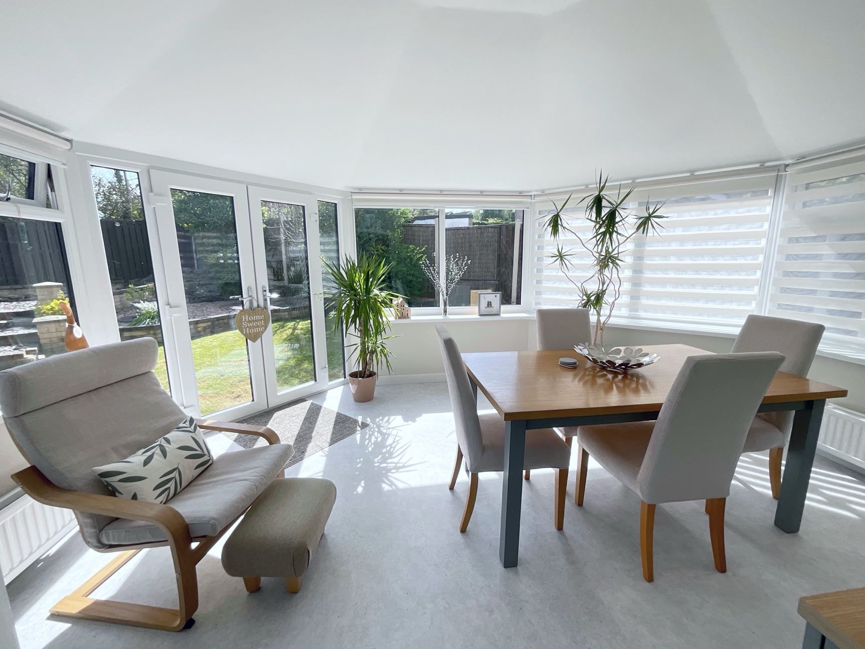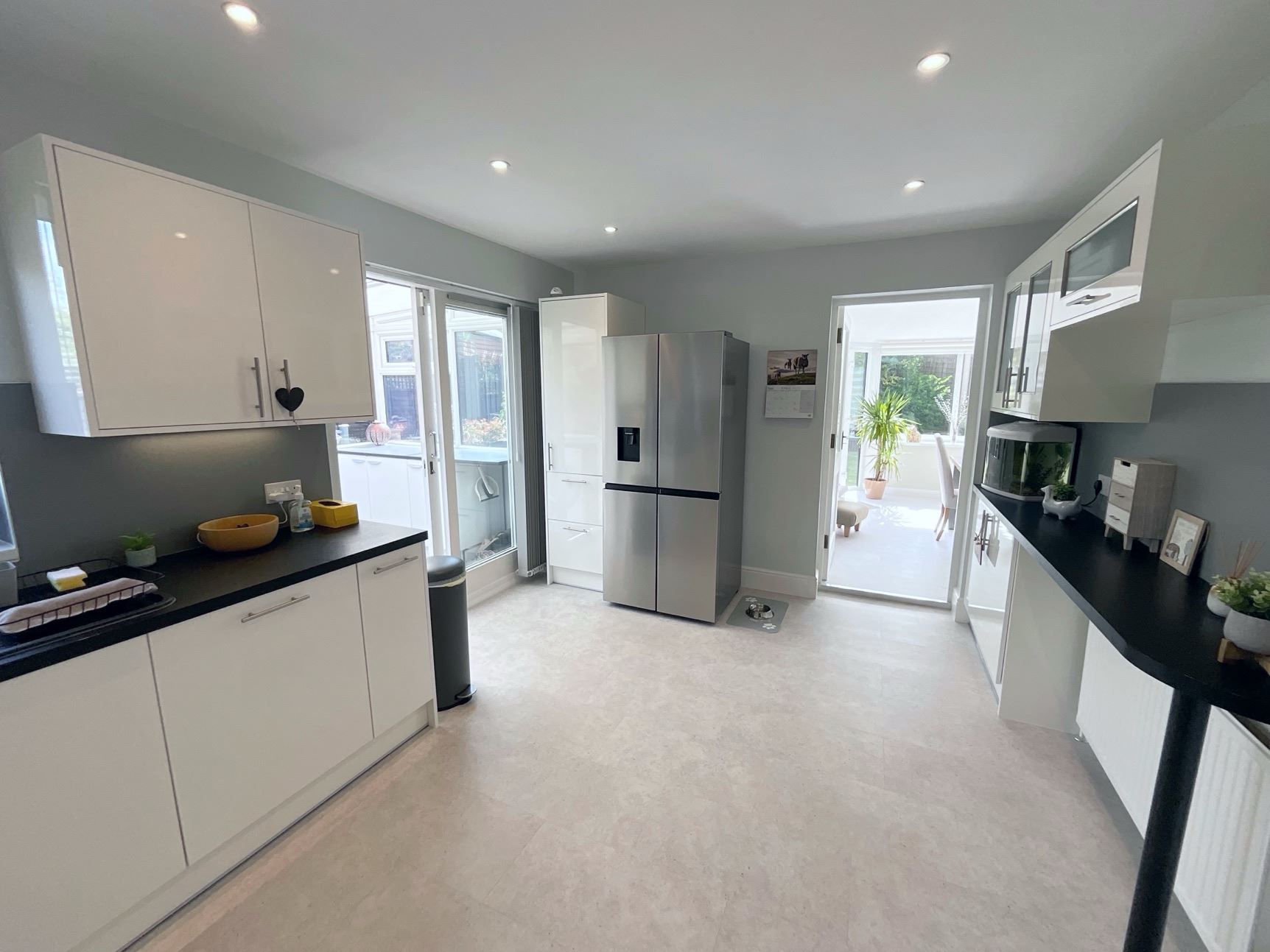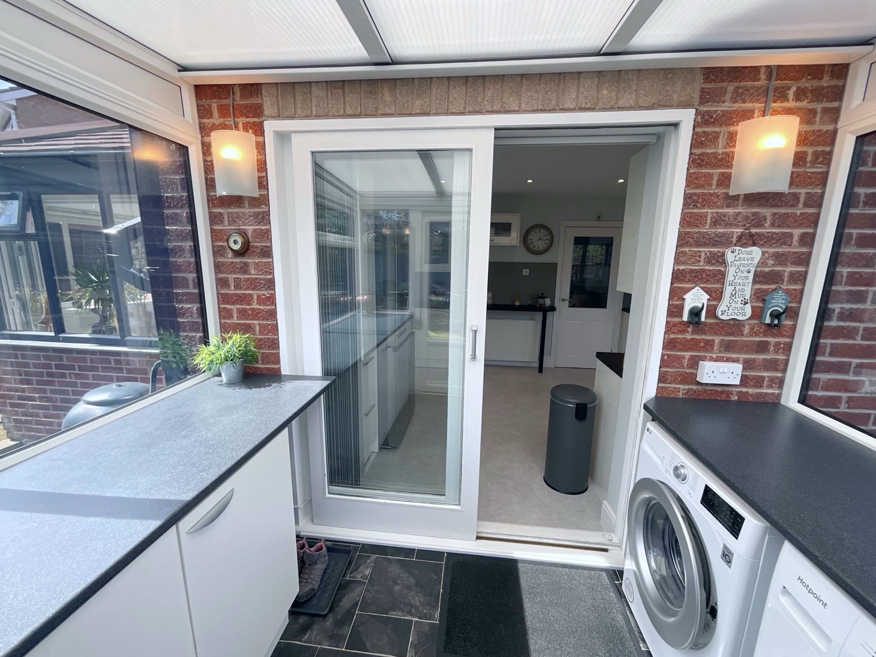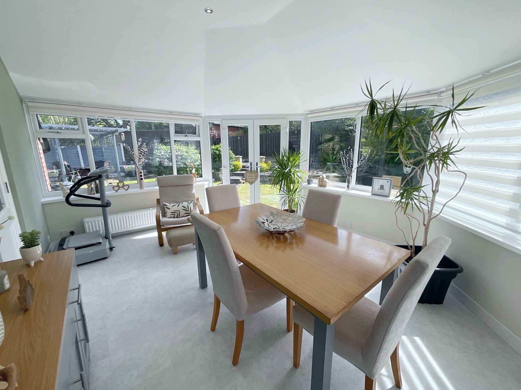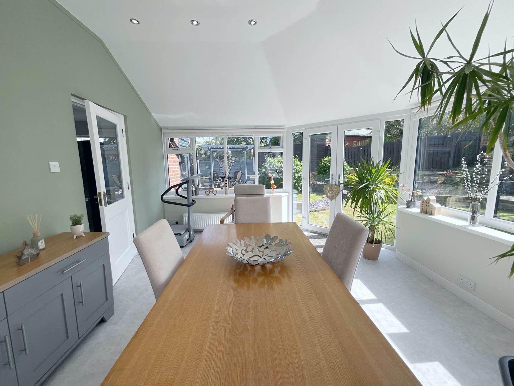The heart of the home is the stunning breakfast kitchen, fully fitted with modern units, gas cooker point, integrated extractor fan and dishwasher. The stylish breakfast bar makes morning coffees or casual meals a breeze. From here, flow seamlessly into the spacious conservatory — now upgraded with a solid insulated roof and inset spotlights — creating a cosy, light-filled space to enjoy all year round. French doors lead straight into the garden, perfect for summer gatherings or peaceful evenings.