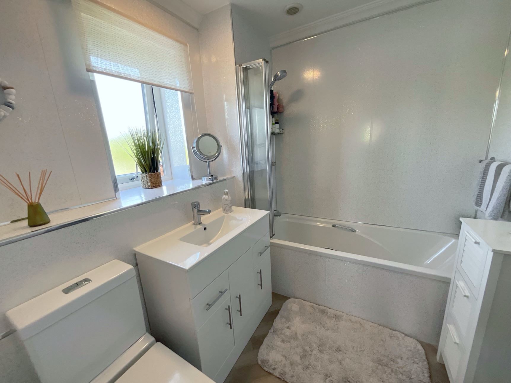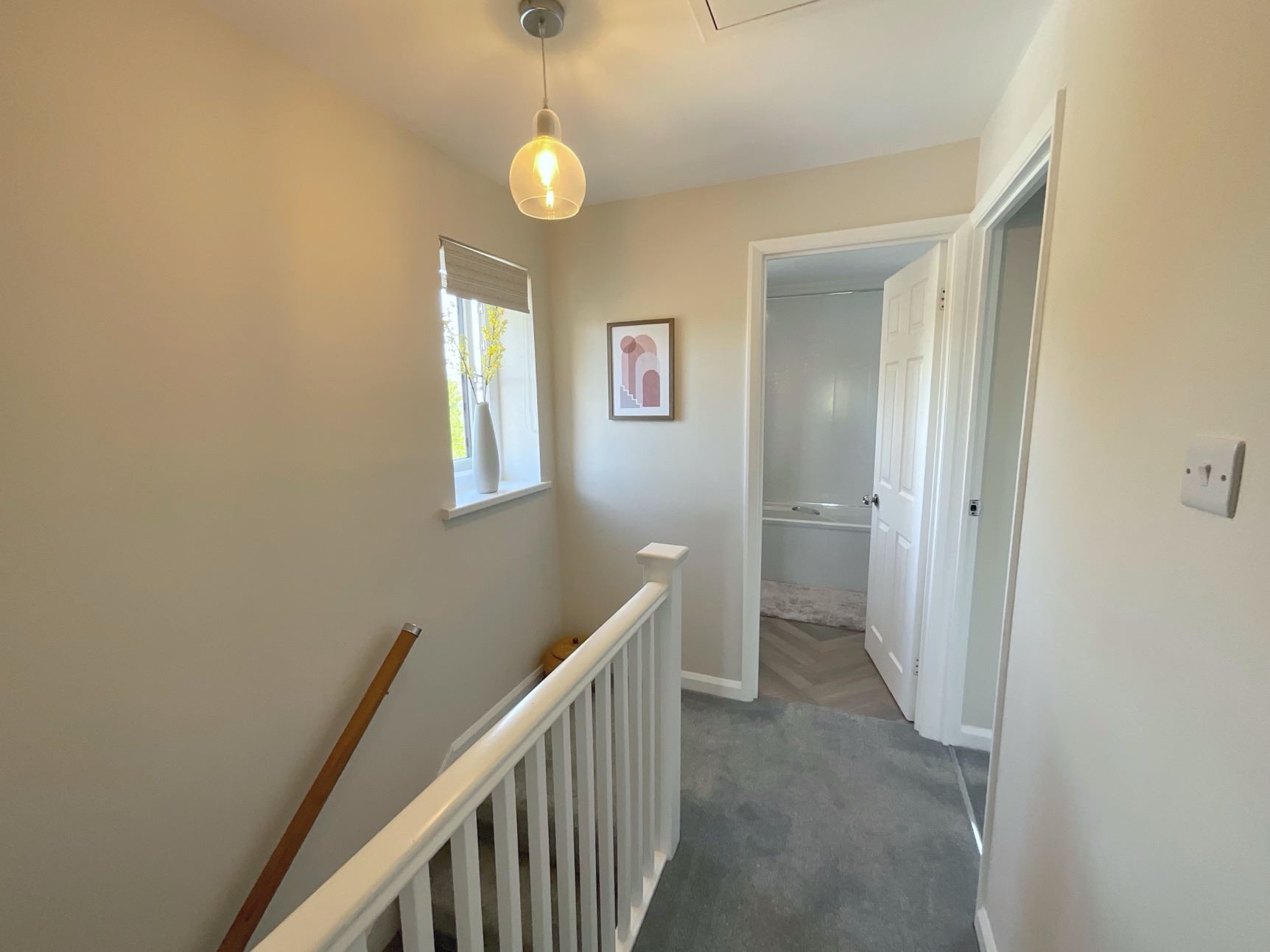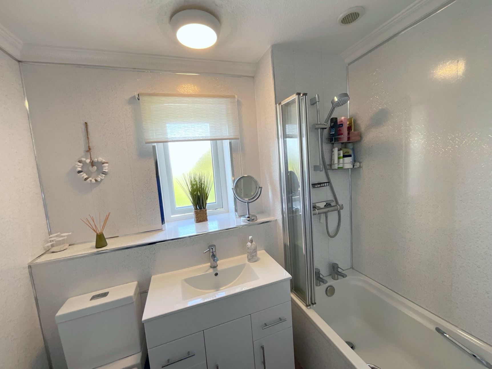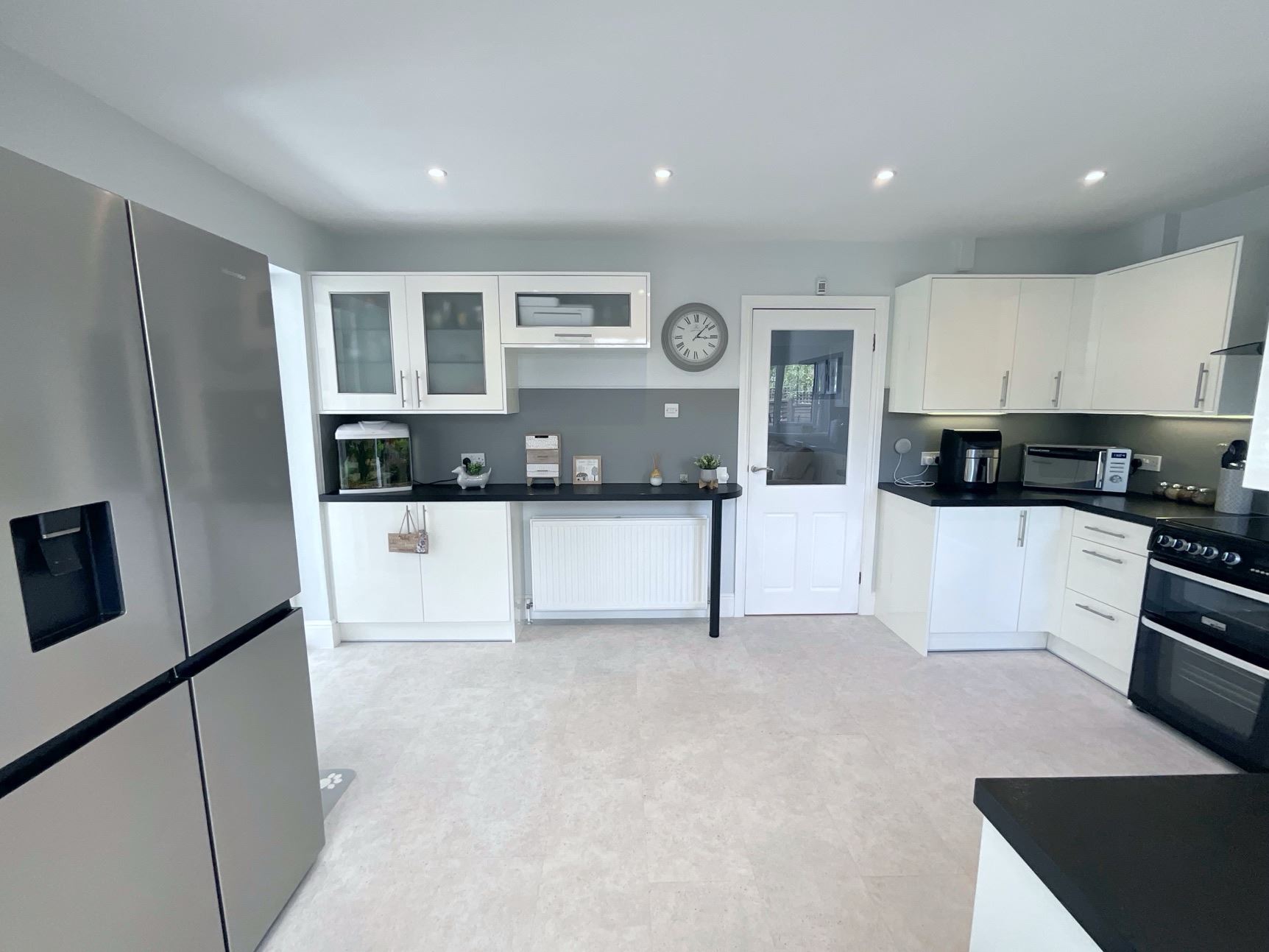 Upstairs, you'll find three well-proportioned bedrooms and a modern family bathroom, tastefully fitted with a crisp white suite including a vanity unit, bath, and uPVC splashbacks for easy maintenance. Need more storage? The boarded loft with pull-down ladder offers loads of potential.