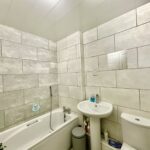 Three piece suite comprising panelled bath, low flush WC, pedestal wash basin, radiator and full tiling to the walls.