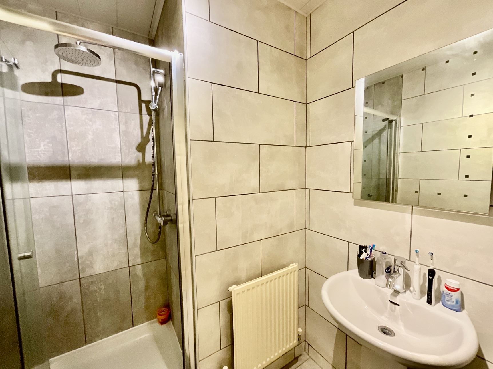 Luxury tiled en-suite, shower enclosure with rainfall shower, pedestal hand wash basin, central heating radiator, and tiled flooring.