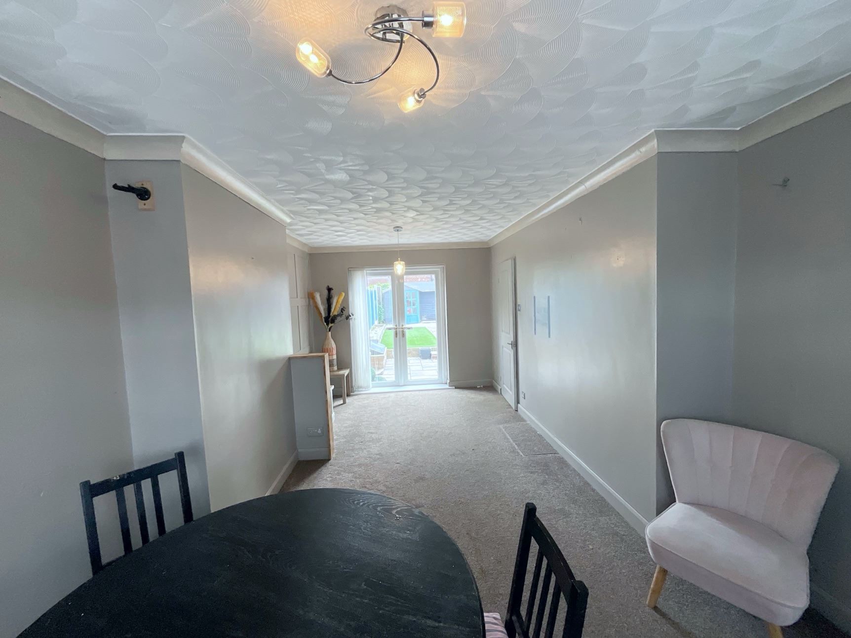 The ground floor accommodation comprises a welcoming entrance hallway, a spacious open-plan lounge/dining room with French doors opening onto the rear garden, and a separate fitted kitchen. Stairs rise to the first floor, where there are two well-proportioned double bedrooms and a family bathroom.