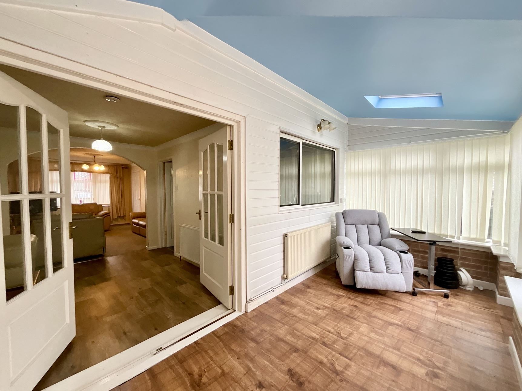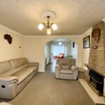 To the front of the property, a porch leads into a welcoming hallway with stairs rising to the first floor. Spacious lounge open plan to the dining room. The kitchen benefits from a useful inbuilt storage cupboard and a side door giving access to a larger-than-average garage, perfect for storage, hobbies, or workshop use.