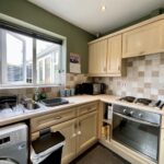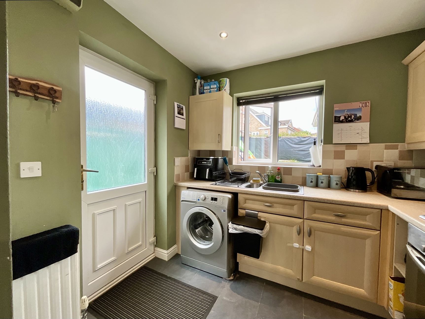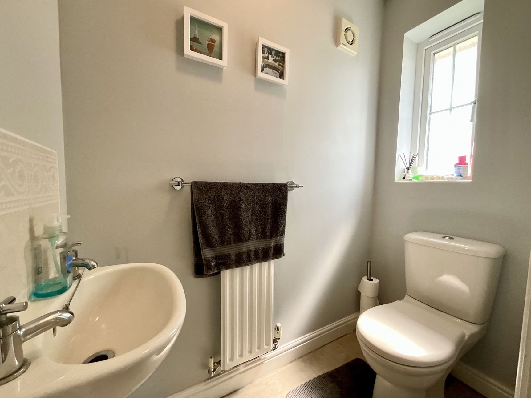 The kitchen is fitted with a range of wall and base units and includes a convenient side door to the exterior. A downstairs WC adds further practicality to the ground floor.