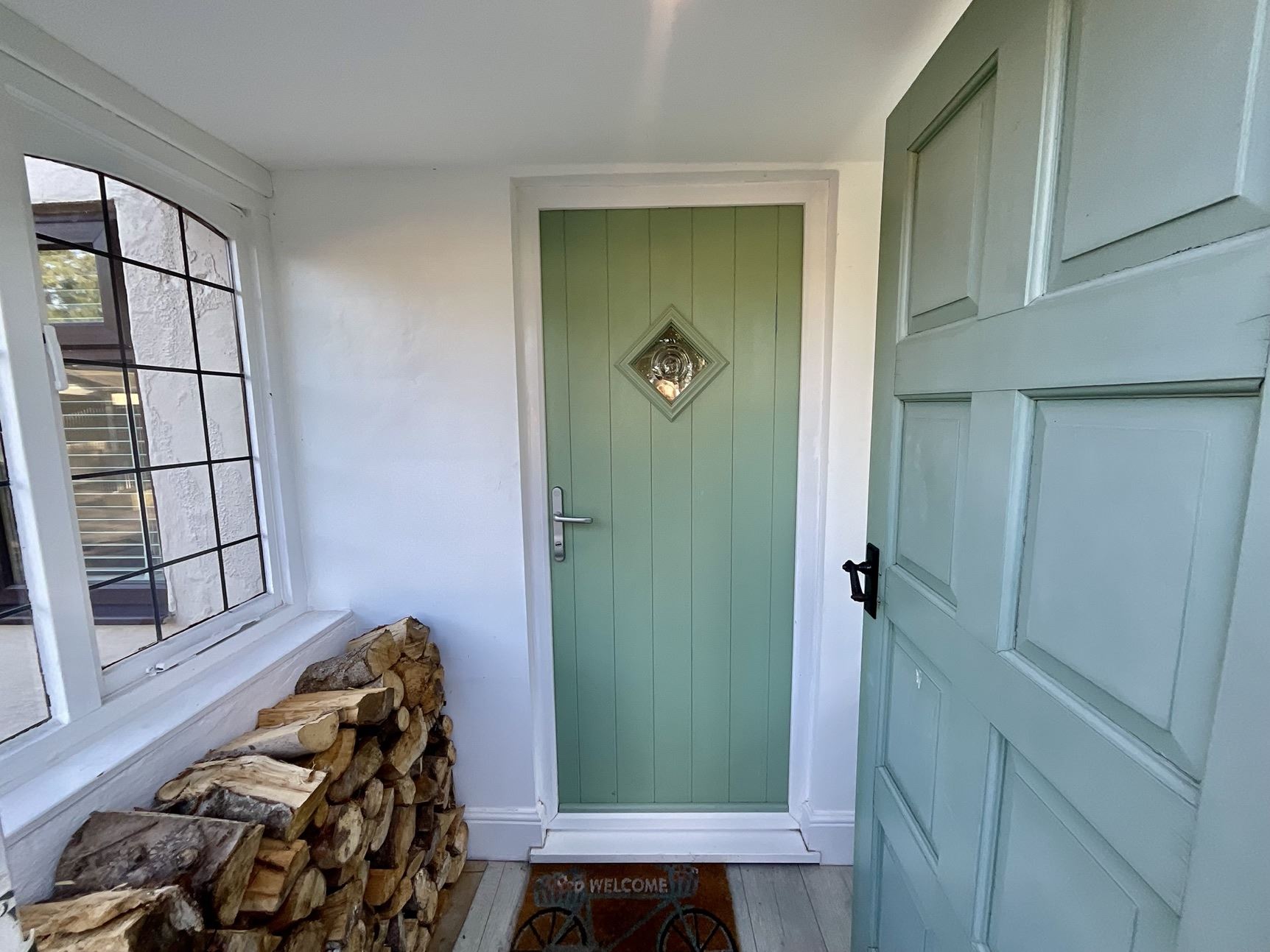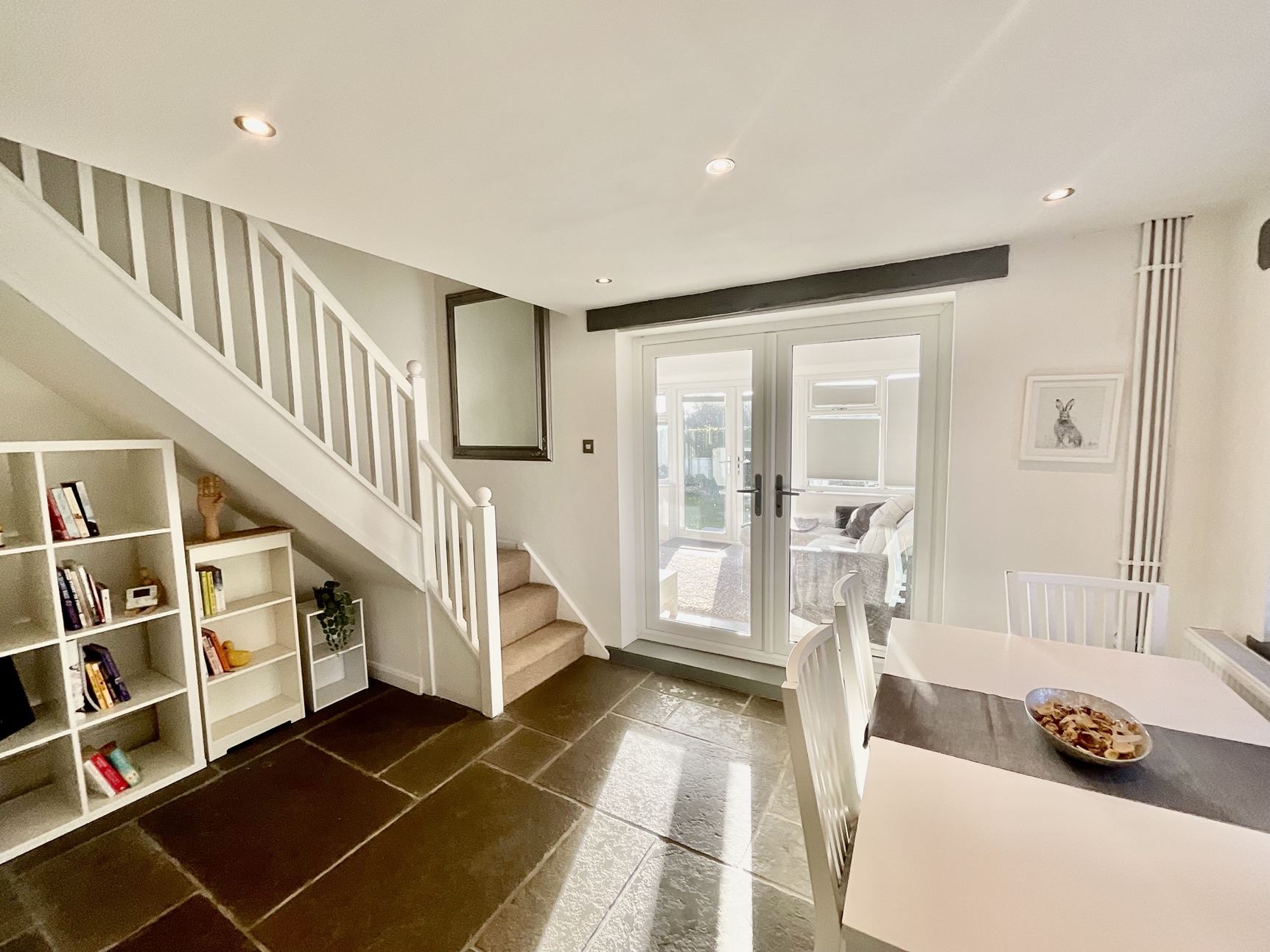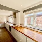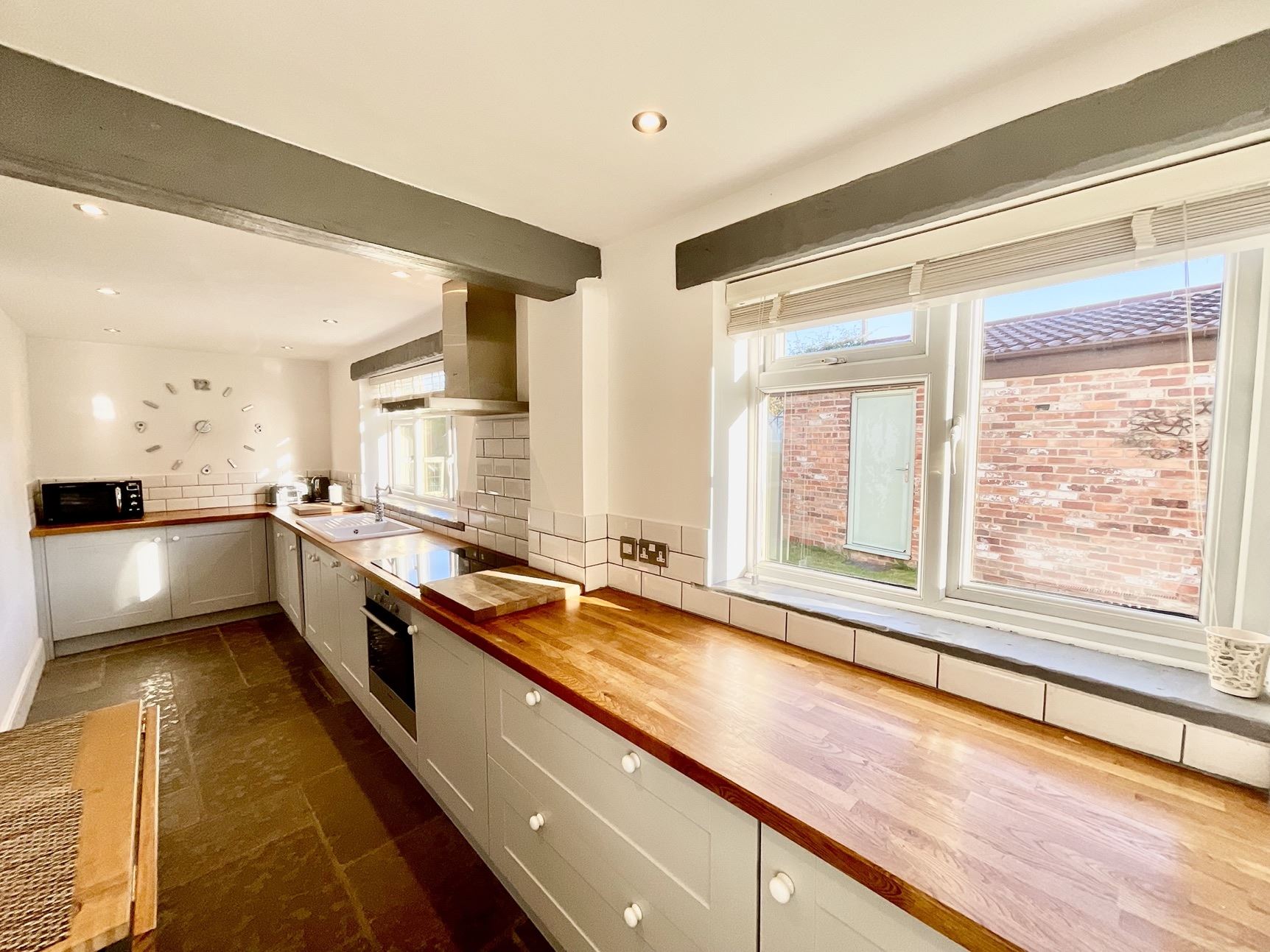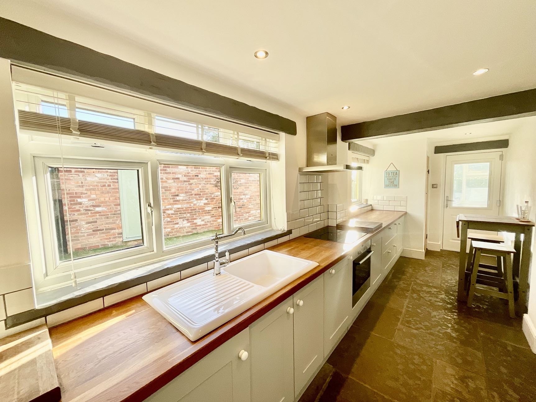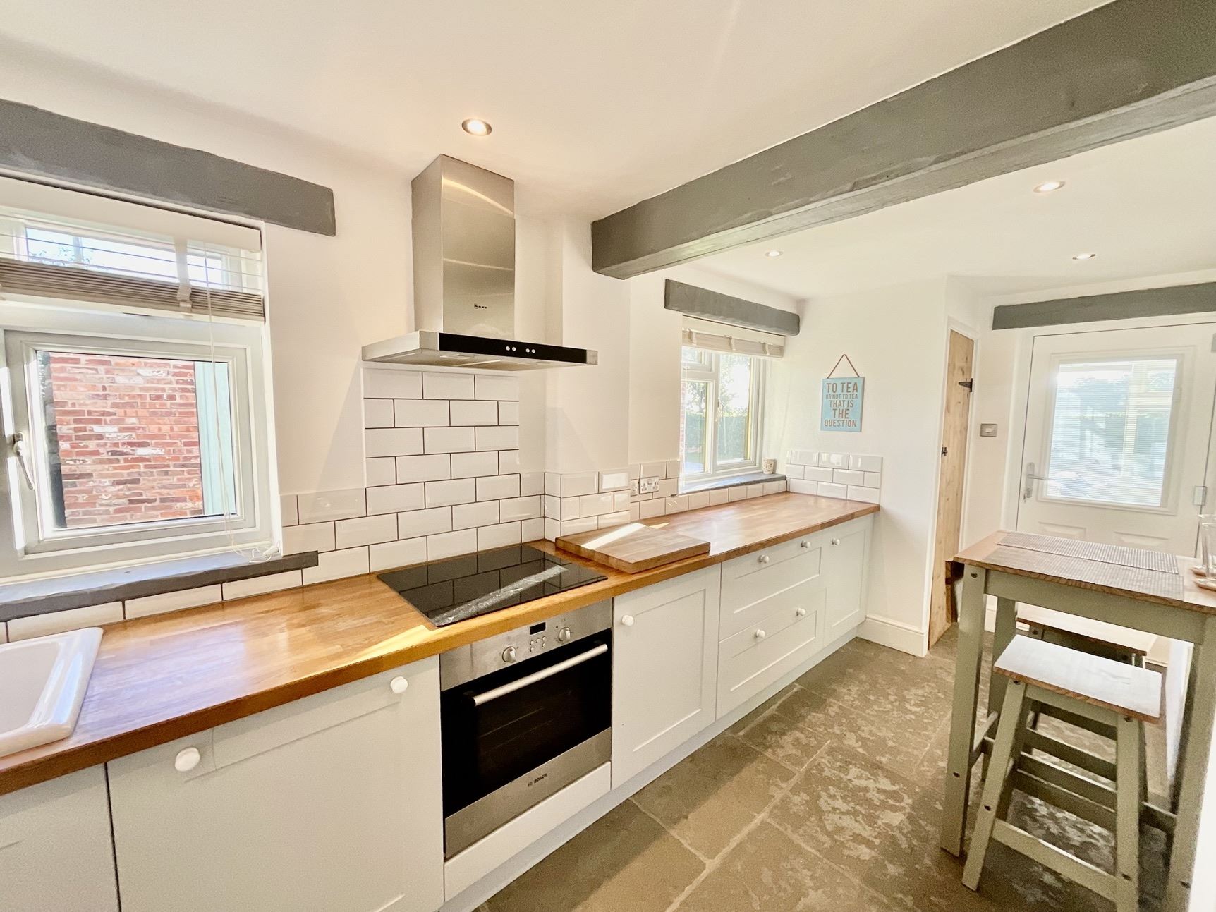 The property is accessed via a delightful porch with 2 Chartwell green doors, the lounge is inviting and light-filled, with a beautiful stone floor and characterful log burner for cosy winter nights. Separate dining room is the perfect place for family meals and entertaining, with stairs leading to the first floor. Just off the dining room is a sunny conservatory overlooking the mature garden, perfect for relaxing and enjoying the rural views. The kitchen features a range of fitted units, wood countertops, and integrated appliances, creating a bright, functional space for cooking.