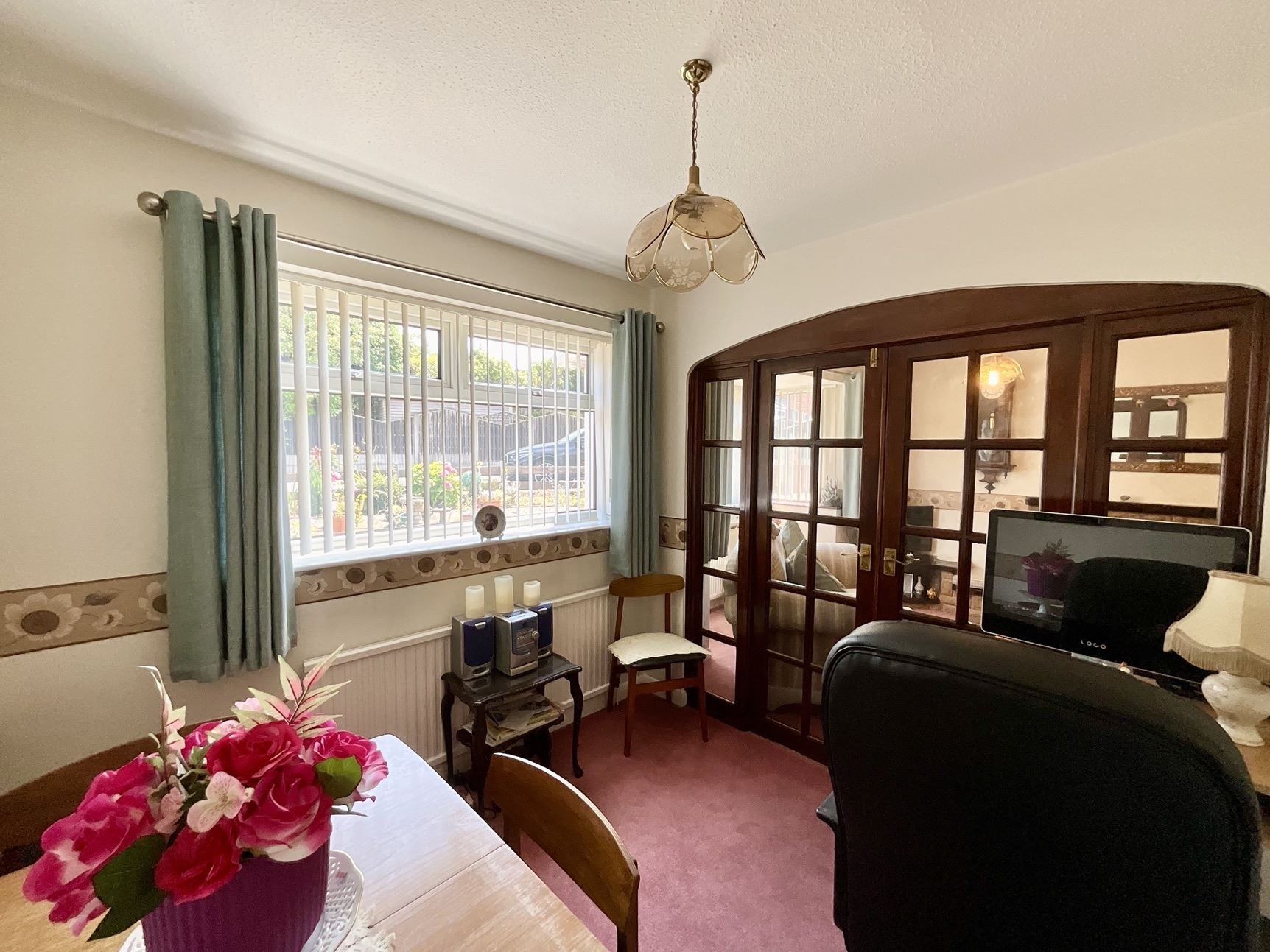 Side door opening into the hallway. Spacious lounge with front facing aspect and ample space for seating, internal French doors open into the dining room with front facing window and space for dining table and chairs. Good sized kitchen with a range of wall and base cabinets, contrasting work surfaces incorporating a four point hob with inbuilt oven. Three bedrooms, and family bathroom. To the front of the property is a low maintenance garden, adjacent is a driveway and carport leading to the single garage. Good sized rear garden laid with artificial lawn.