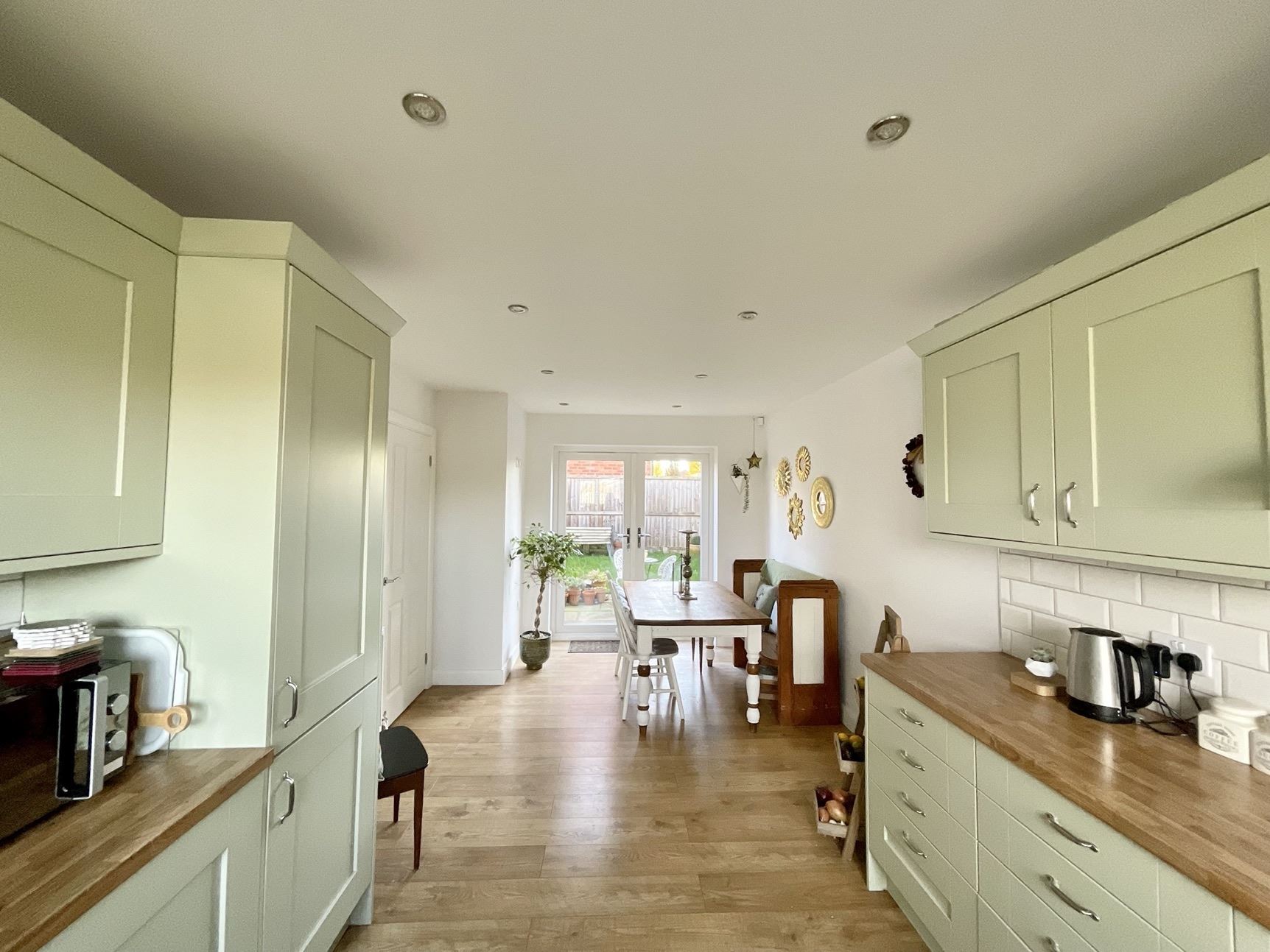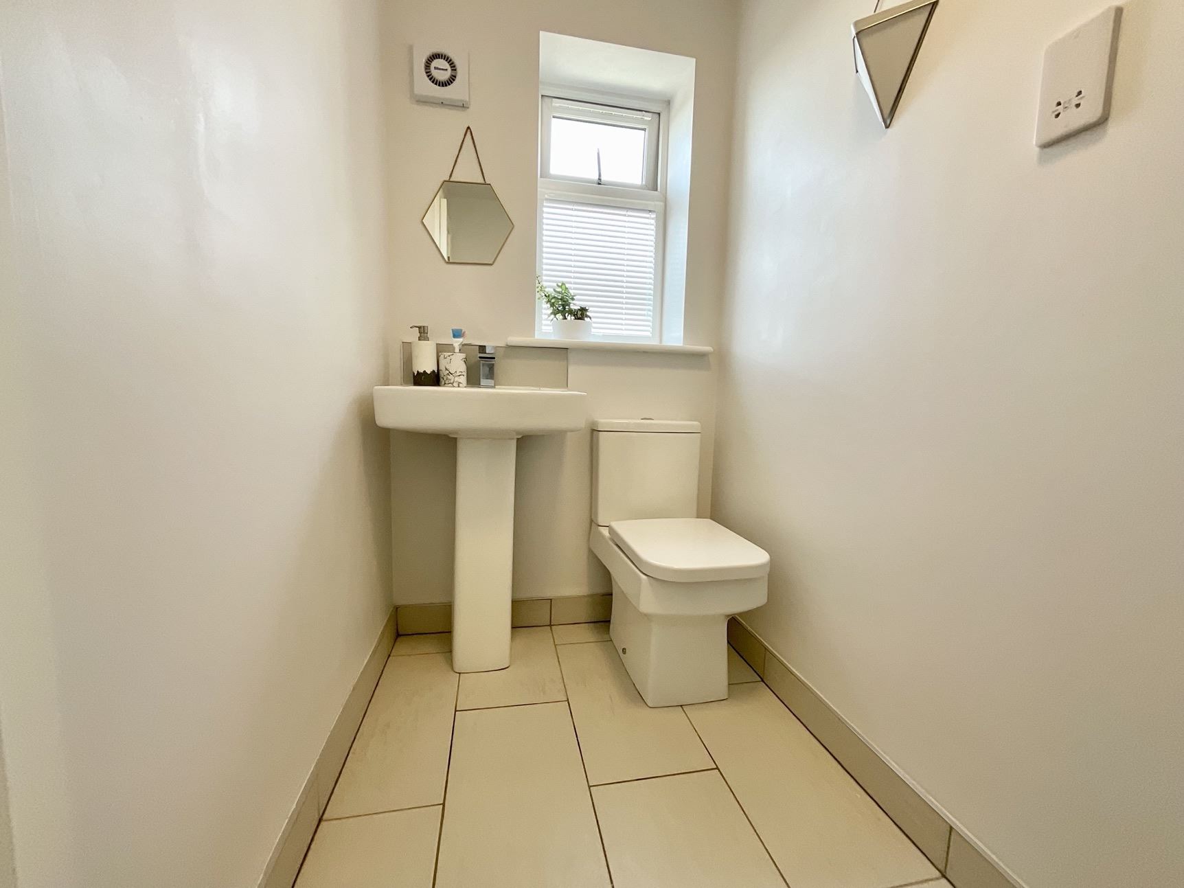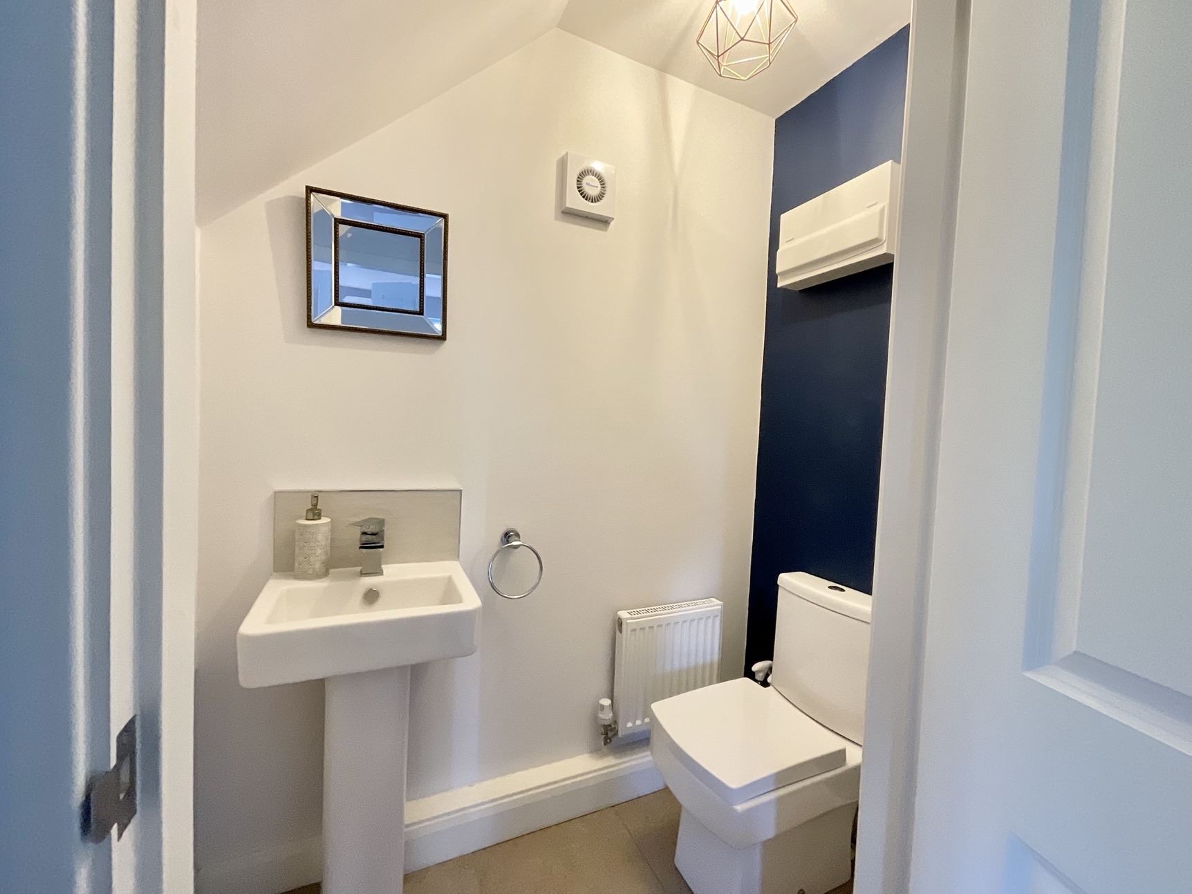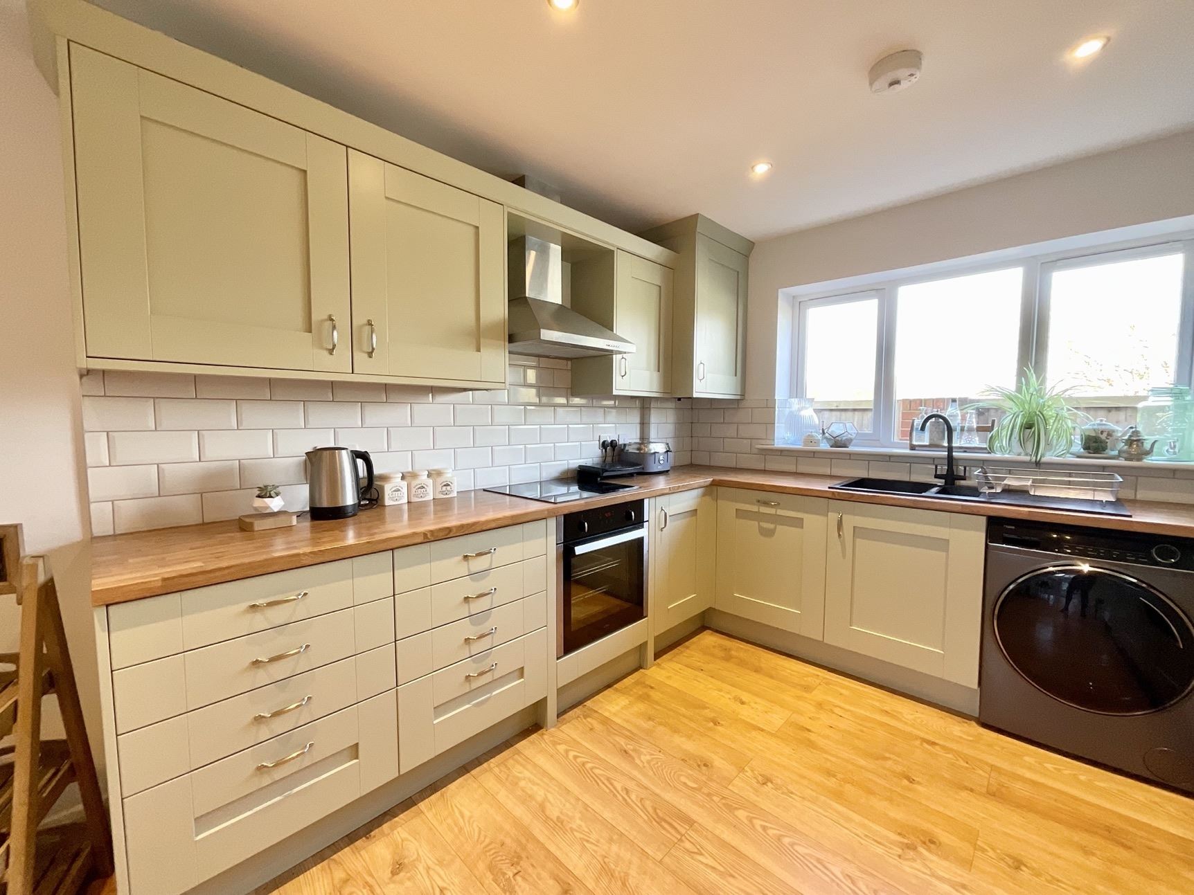 A welcoming reception hallway has stairs rising to the first floor landing; there is useful understairs storage space. A beautifully appointed well proportioned lounge with double aspect windows. The stunningly presented kitchen/diner has a range of wall and base cabinets, complementing work surfaces benefitting from a variety of integrated appliances including hob, oven, dishwasher and fridge freezer; French doors open onto the rear garden and there is space for dining table and chairs. Downstairs cloakroom with wash hand basin and WC. The first floor landing gives access to the three bedrooms and bathroom. The master bedroom comprises an en-suite shower room with enclosed cubicle, wash hand basin and WC. Additional family bathroom having a white suite comprising bath, separate enclosed shower cubicle, wash hand basin and WC. To the front of the property is a block paved driveway with off road parking for two cars; there is an enclosed level rear garden, laid to lawn; enclosed with fencing.