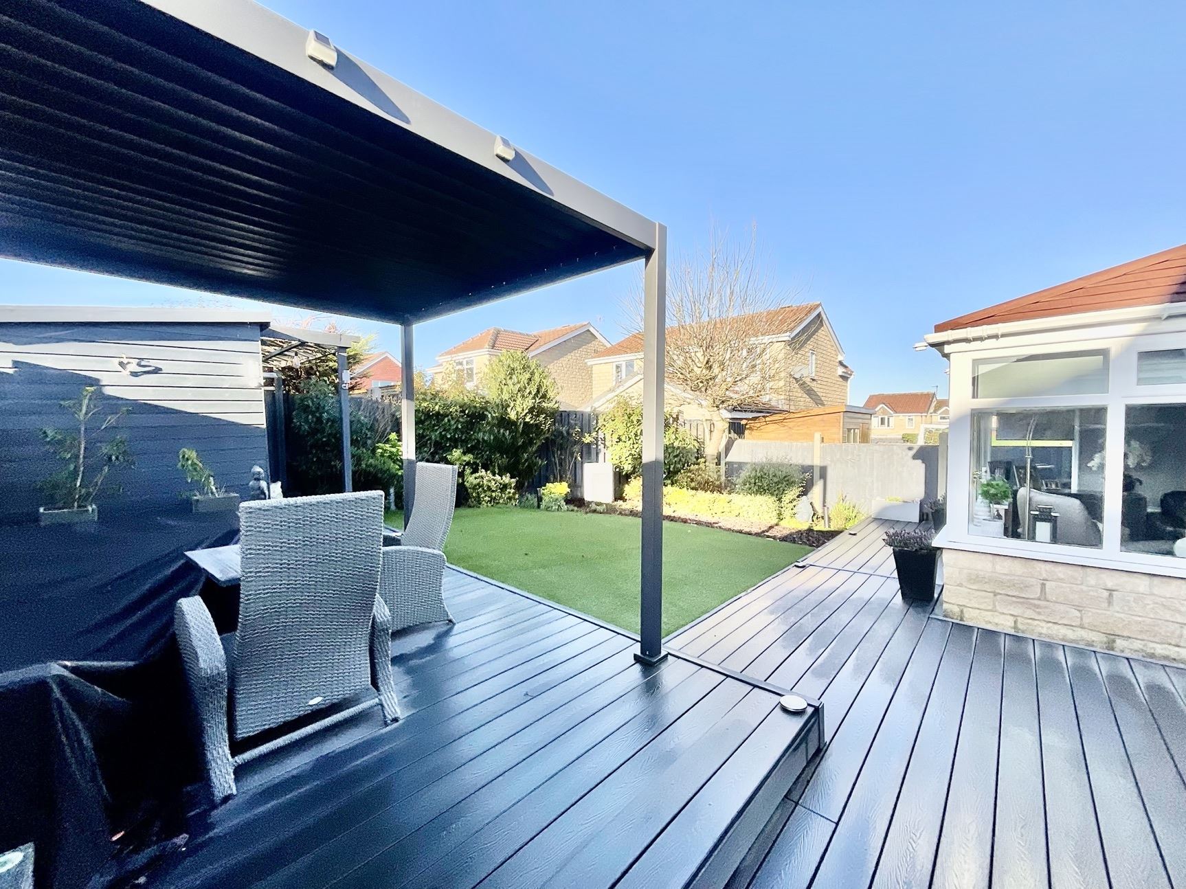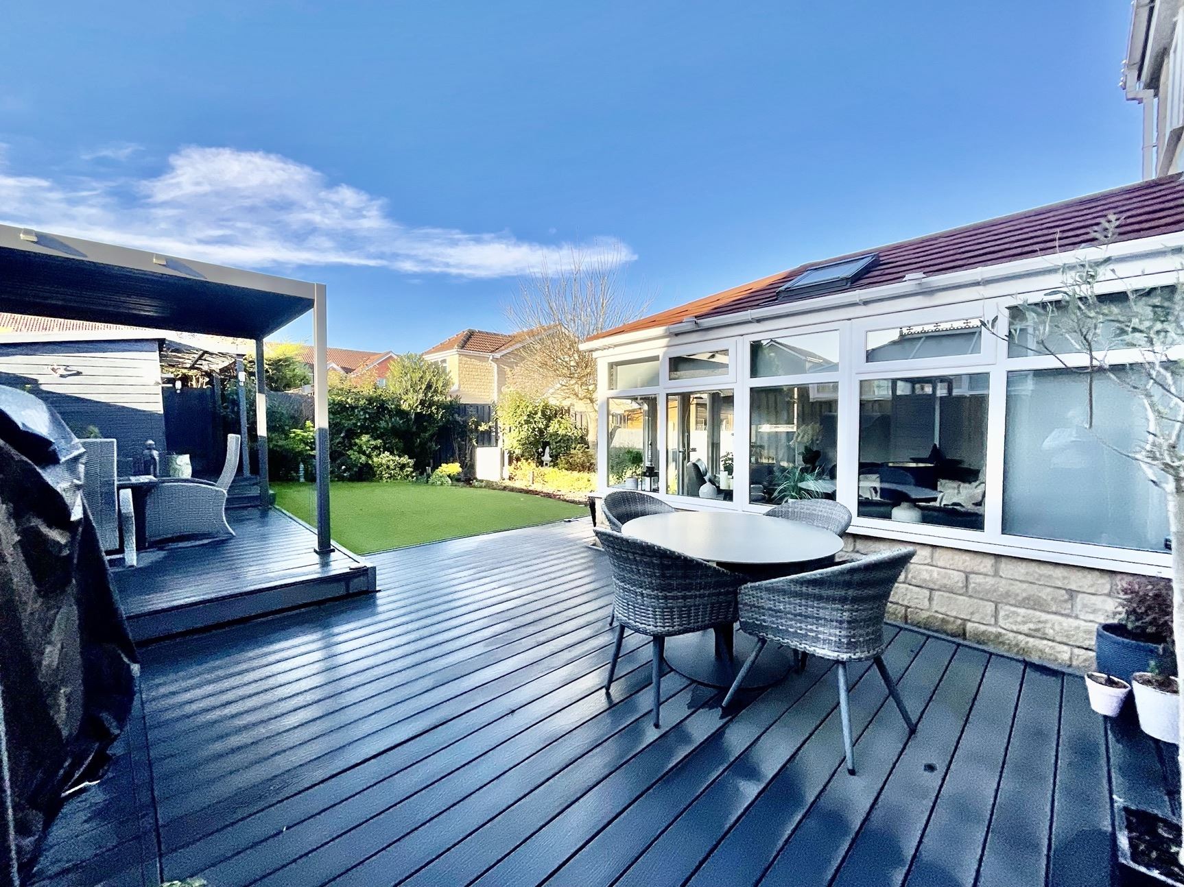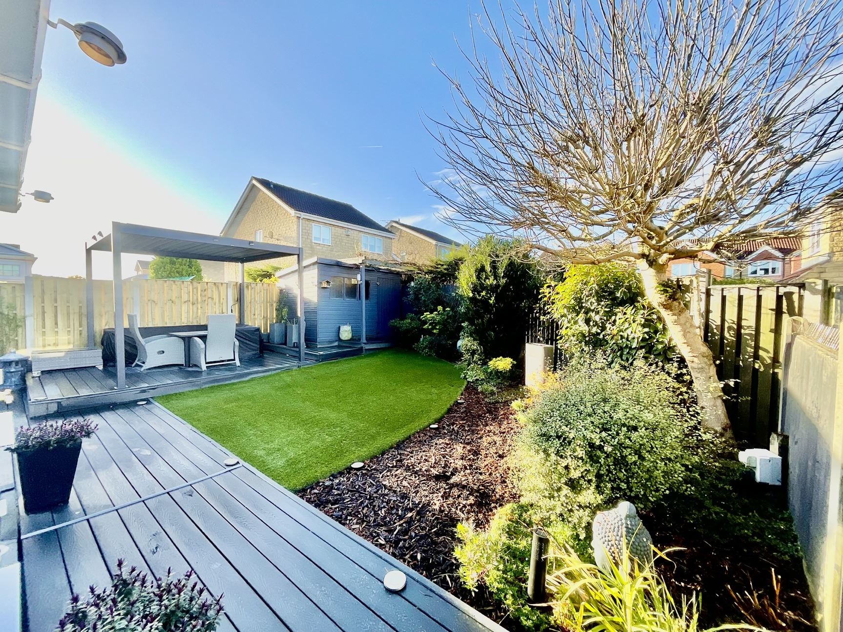The property is situated on a large plot with a generous sized lawn to the front, a driveway and garage. Path to the good sized enclosed rear garden which has an artificial lawn, composite decking, pergola and timber shed