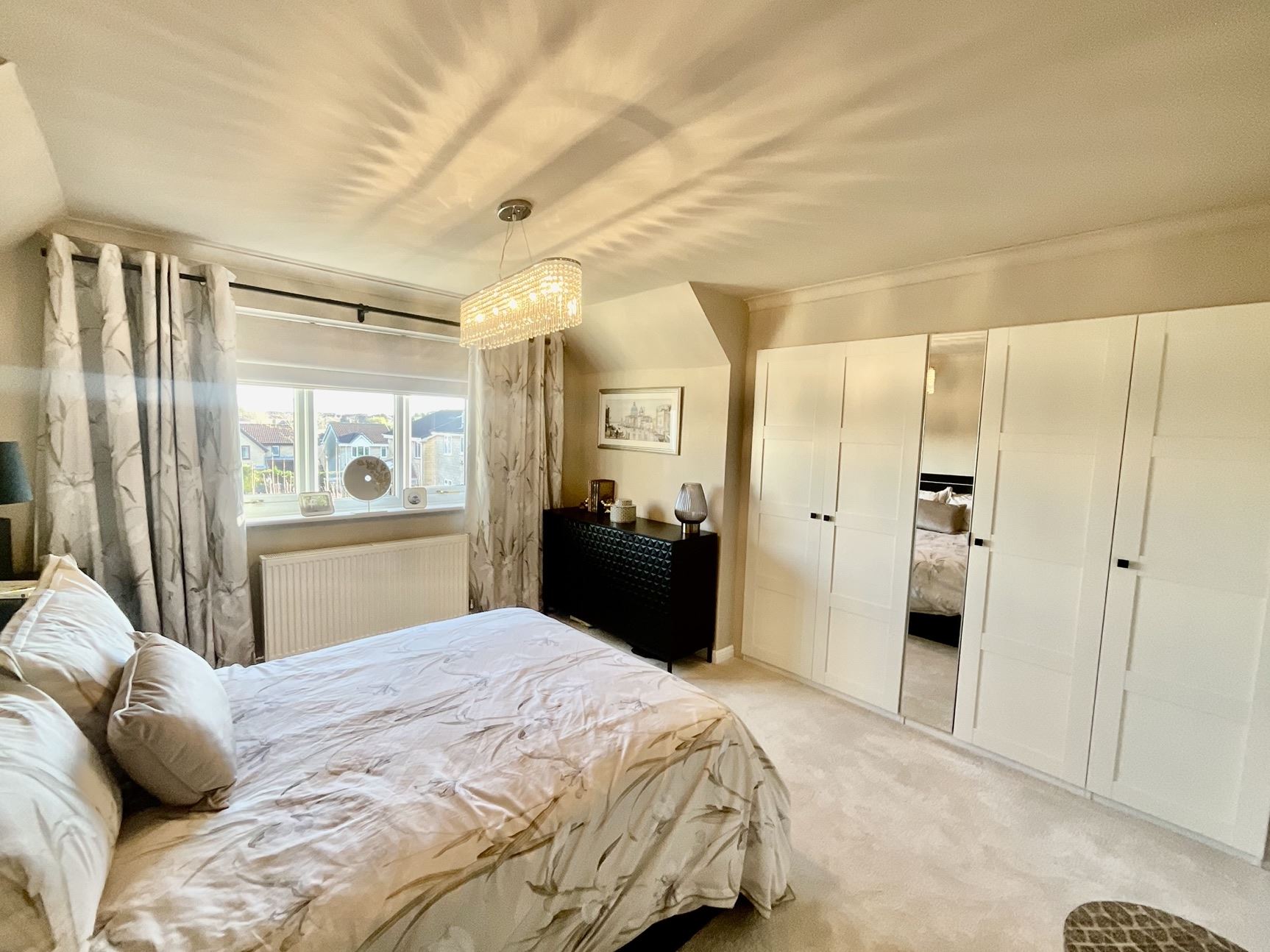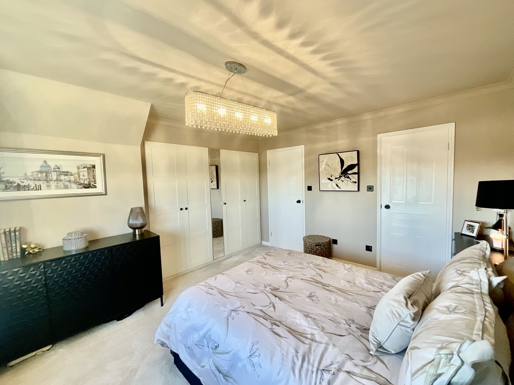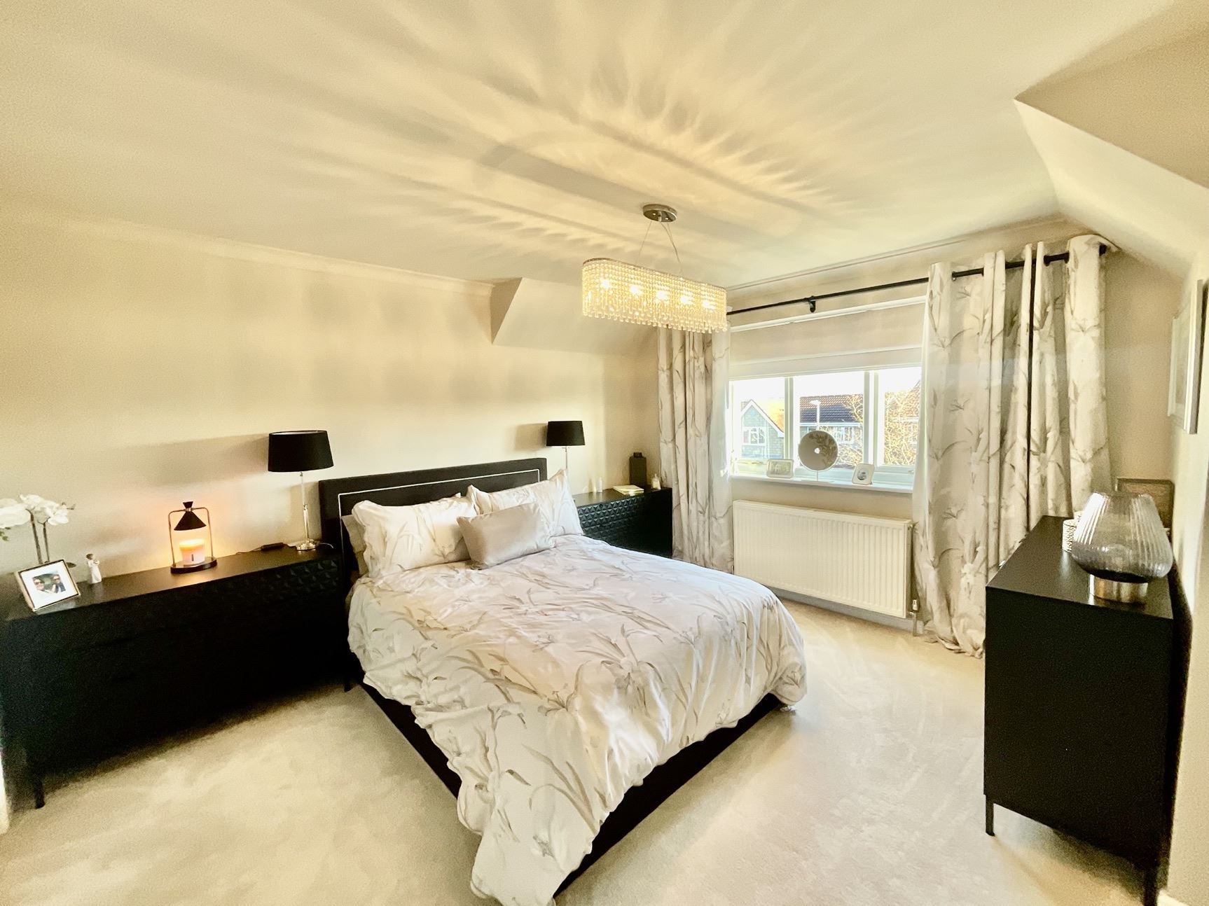 The first floor comprises a master bedroom with fitted wardrobes and an ensuite, three further bedrooms, and a family bathroom. The rear rooms enjoy lovely views of the countryside and playing fields.