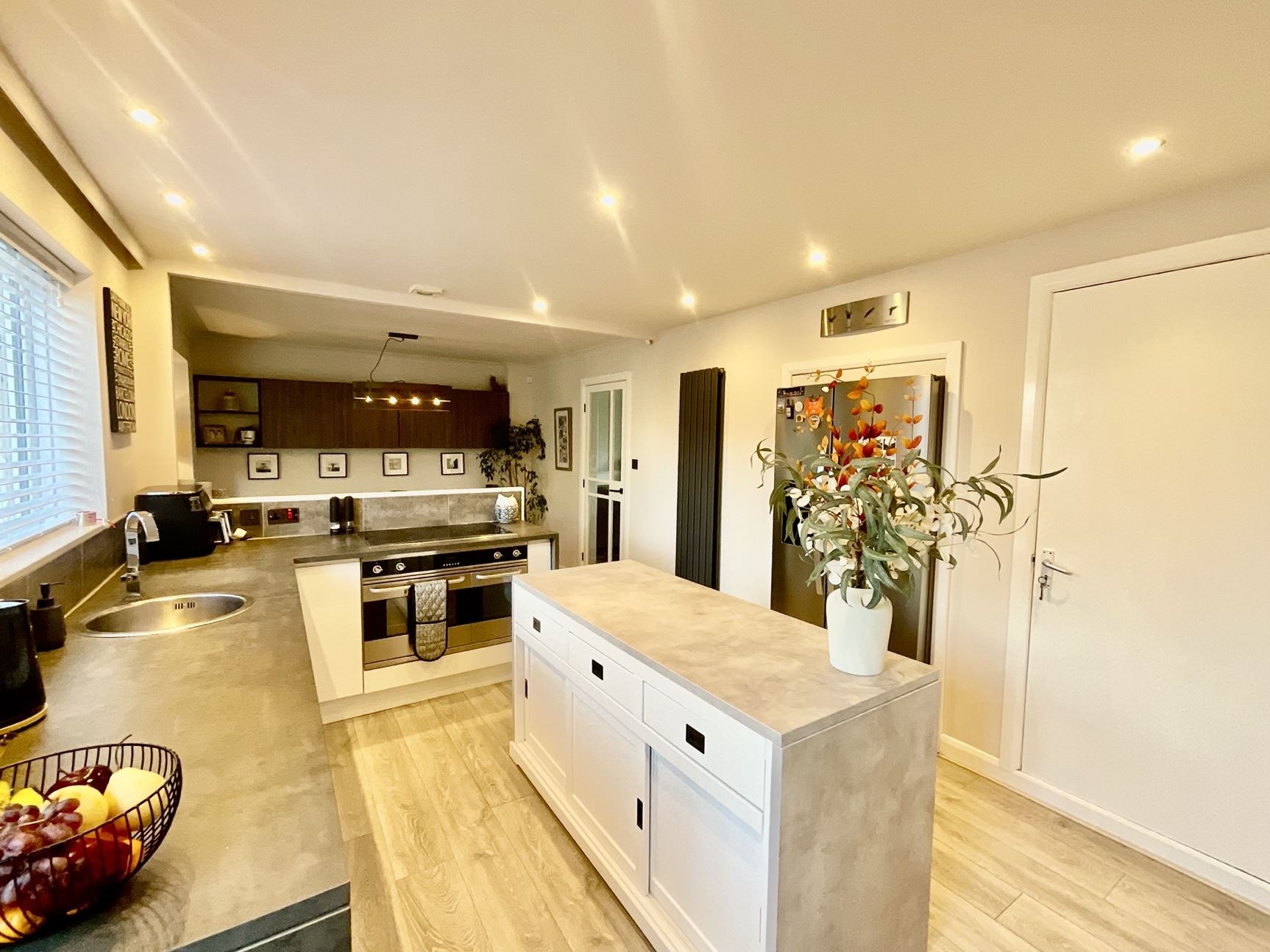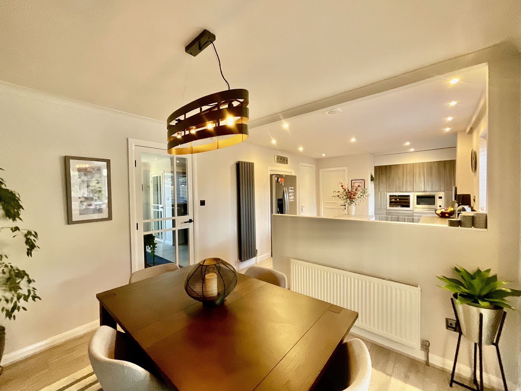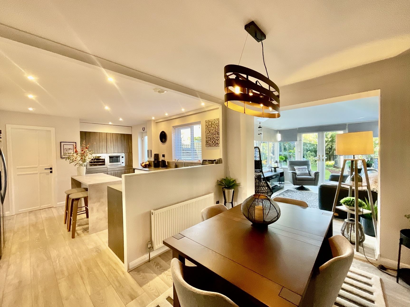 The hallway has the stairs rising to the first floor and a door to the modern lounge. The open plan kitchen diner leads into the conservatory. The kitchen has an abundance of base and wall units and integrated appliances. From the kitchen, there is also a door to the garage and downstairs WC