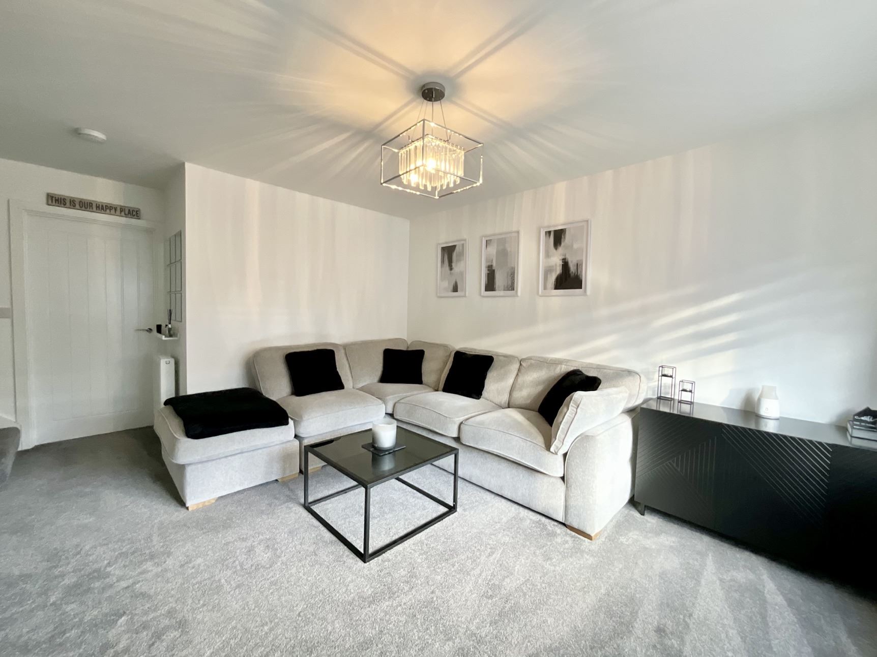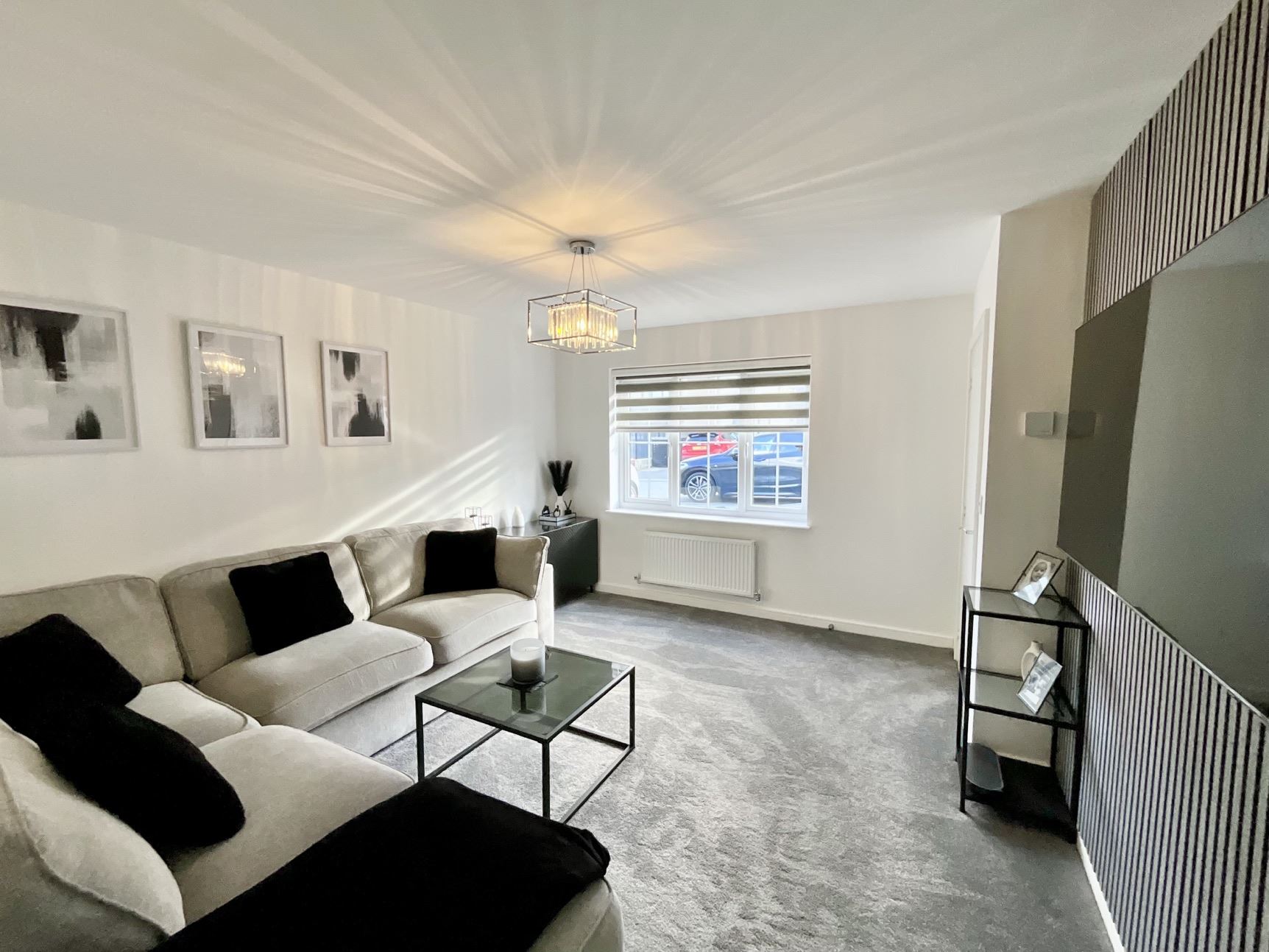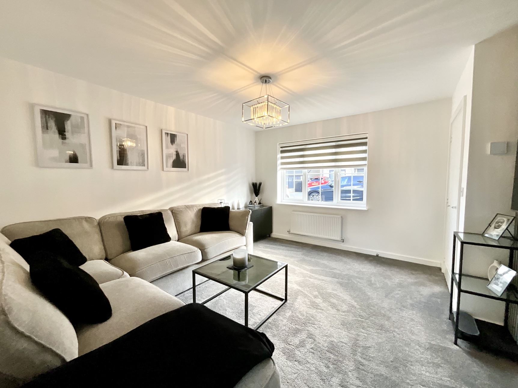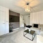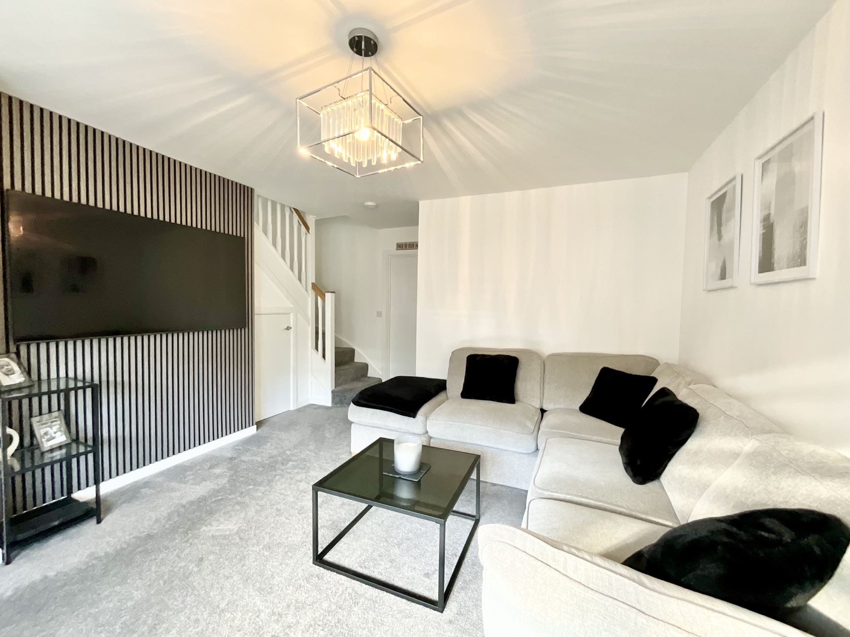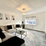 A composite door opens into a welcoming hallway, leading to a beautiful lounge featuring a contemporary feature wall and neutral décor, creating a warm and inviting space. The stunning kitchen/diner is fitted with a substantial range of wall, drawer, and base cabinets, complemented by contrasting work surfaces and integrated appliances, including a four-point hob and built-in oven. A convenient downstairs WC completes the ground floor.