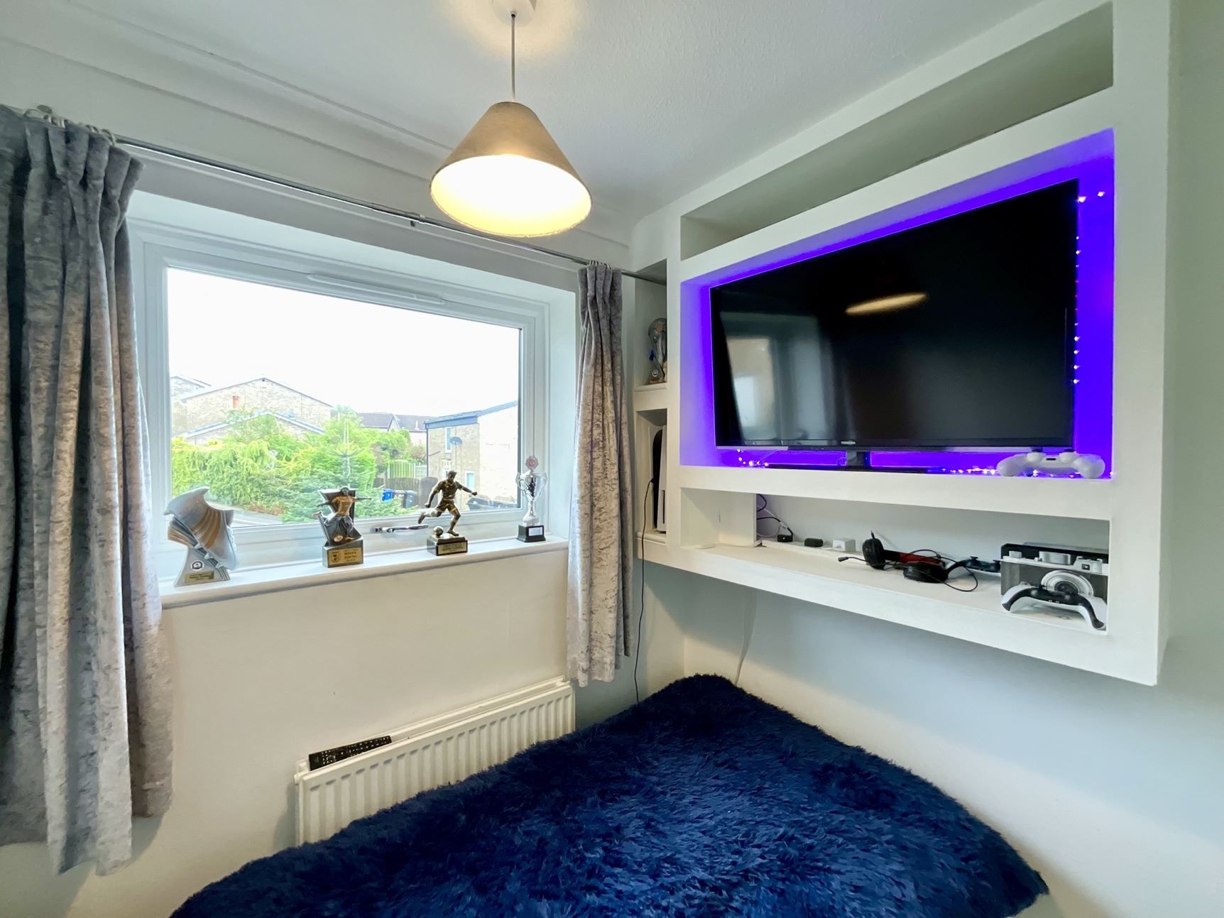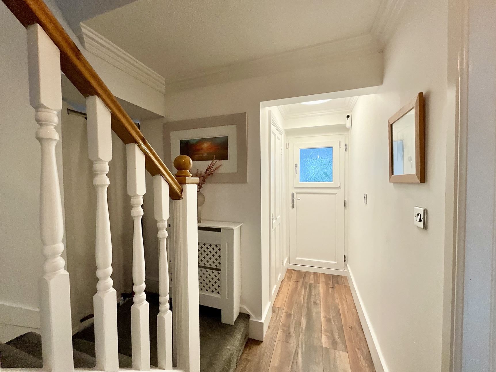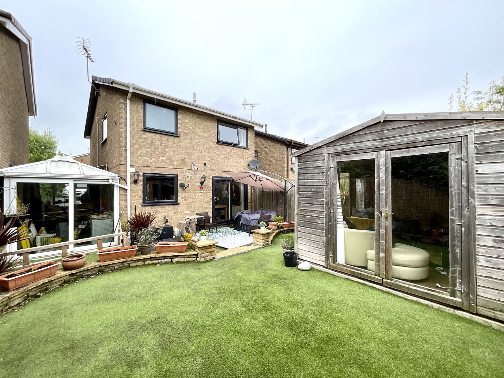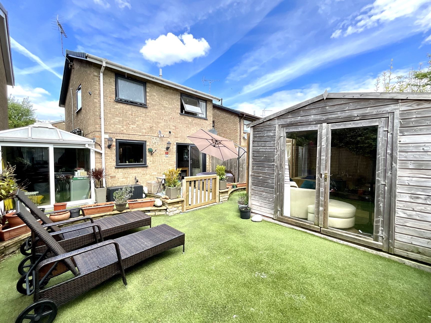 The welcoming front porch leading into a hallway with staircase rising to the first floor landing. The lounge/dining room is a standout feature, boasting contemporary décor and a media wall, double aspect, complemented by patio doors opening onto the rear garden. The kitchen with a range of wall and base cabinets together with contrasting work surfaces. The inclusion of a playroom and downstairs WC adds convenience and versatility to the living space. Upstairs, three bedrooms and a family bathroom offer comfortable accommodation. Outside, the property impresses with a driveway, front garden with mature trees for privacy, and an enclosed rear garden featuring a summerhouse and artificial lawn. Overall, this property promises both style and practicality, making it an attractive prospect for potential buyers.