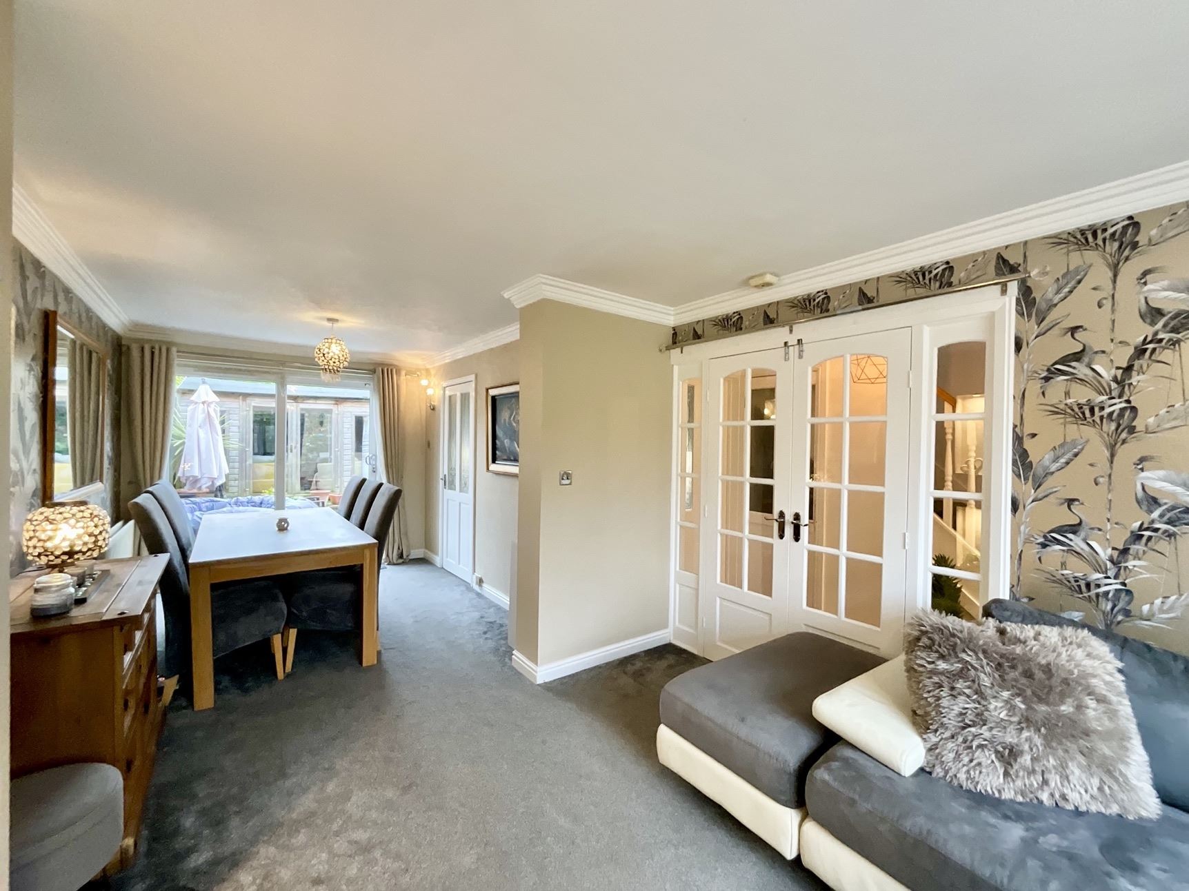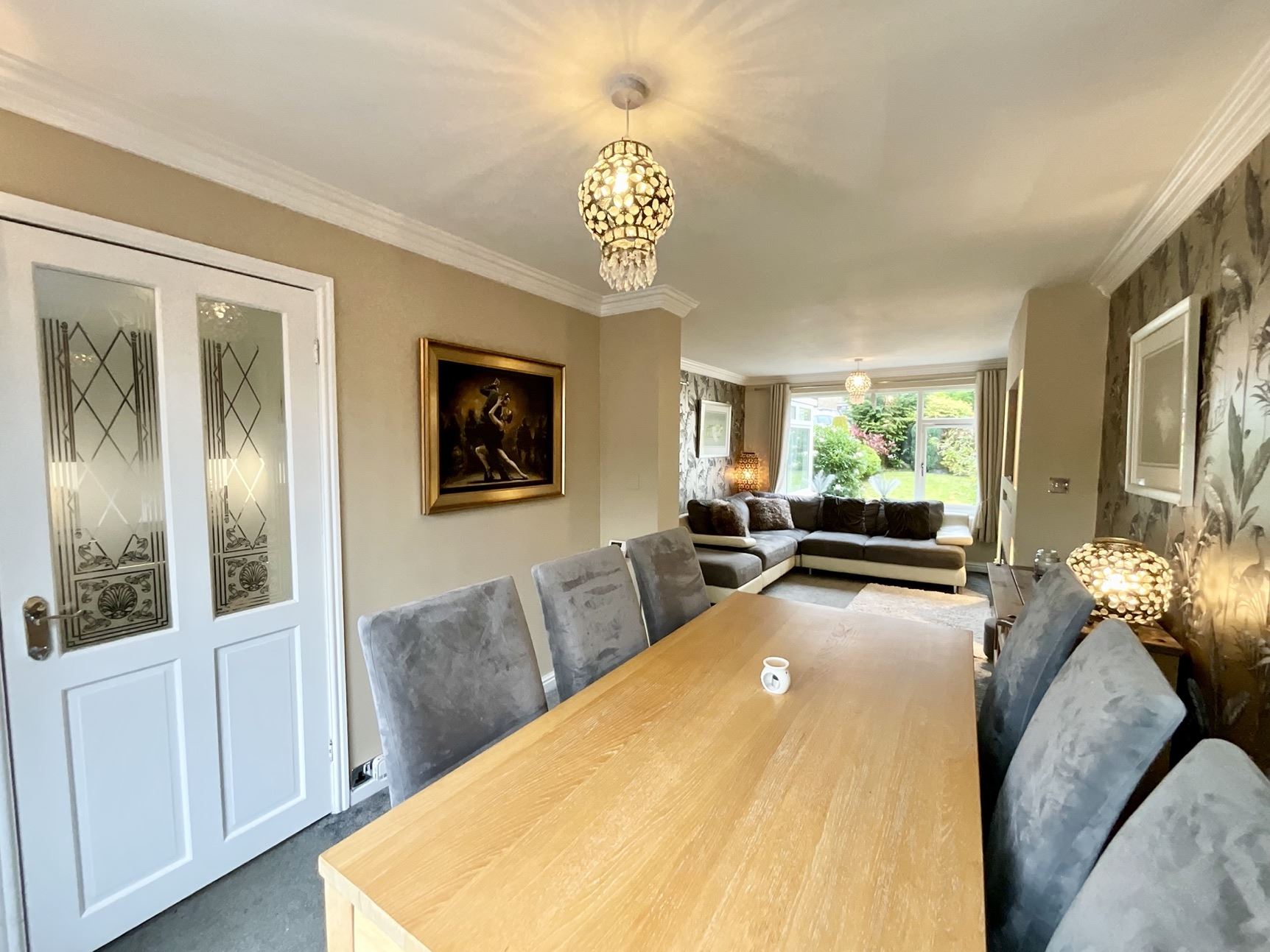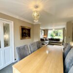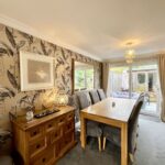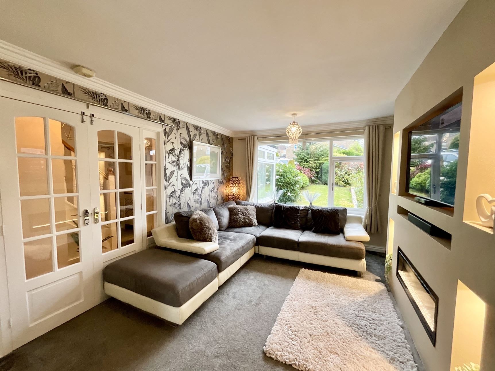 The welcoming front porch leading into a hallway with staircase rising to the first floor landing. The lounge/dining room is a standout feature, boasting contemporary décor and a media wall, double aspect, complemented by patio doors opening onto the rear garden. The kitchen with a range of wall and base cabinets together with contrasting work surfaces. The inclusion of a playroom and downstairs WC adds convenience and versatility to the living space. Upstairs, three bedrooms and a family bathroom offer comfortable accommodation. Outside, the property impresses with a driveway, front garden with mature trees for privacy, and an enclosed rear garden featuring a summerhouse and artificial lawn. Overall, this property promises both style and practicality, making it an attractive prospect for potential buyers.