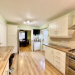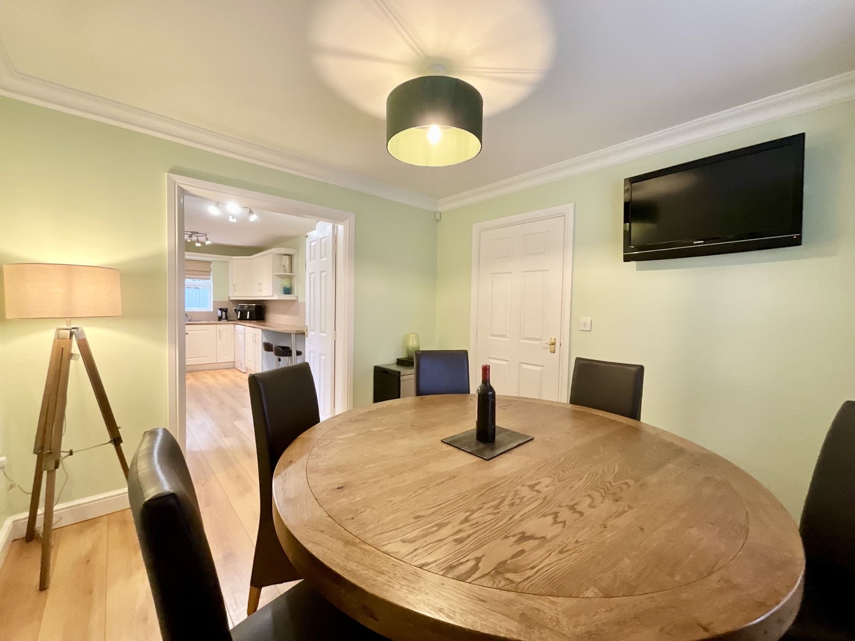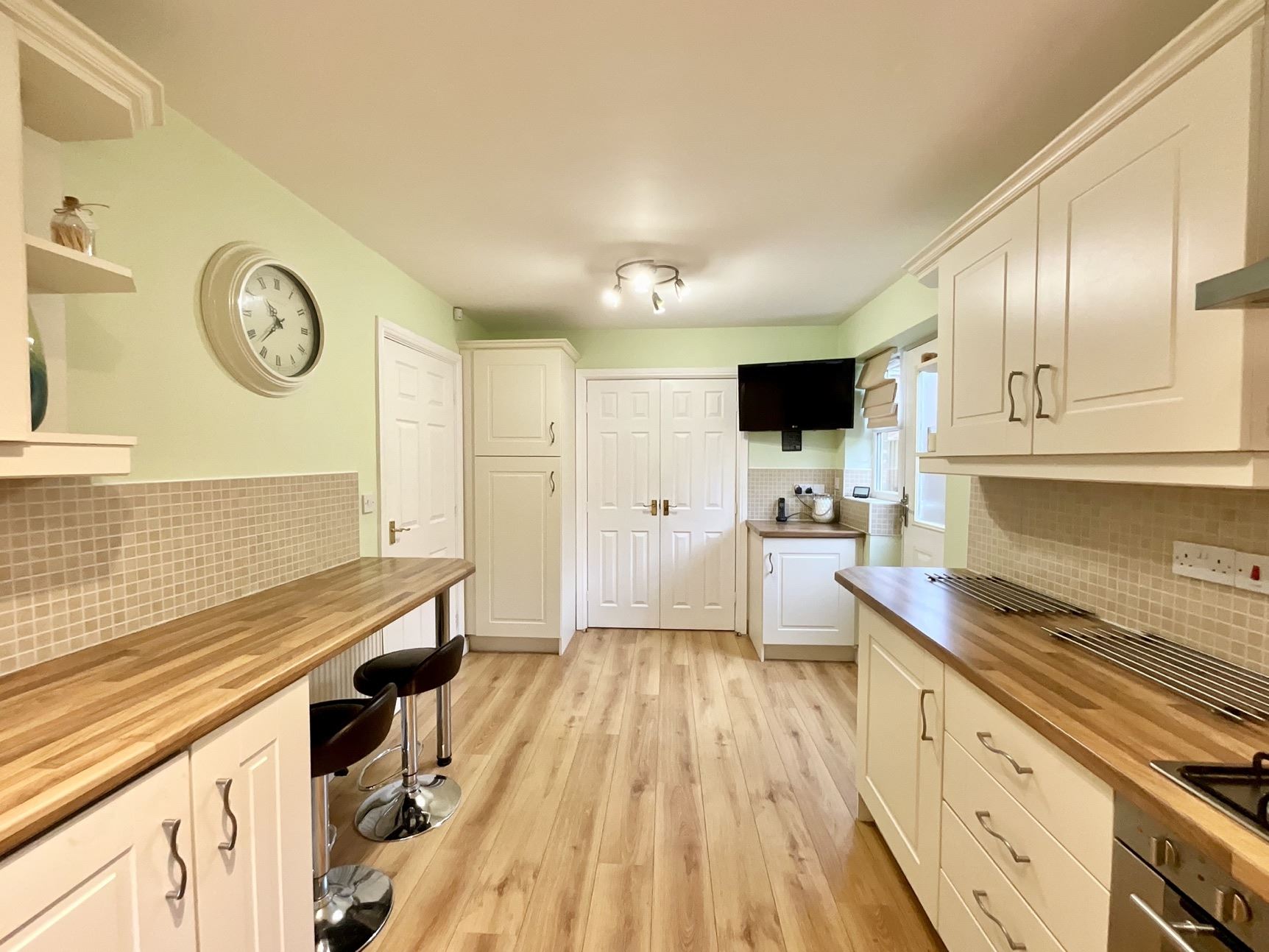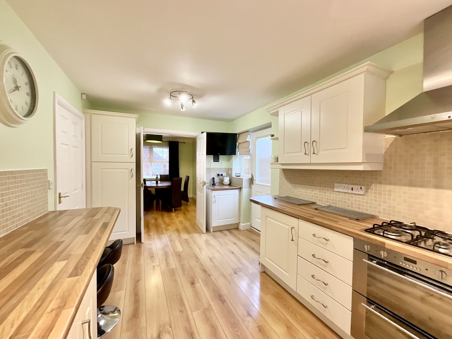 The breakfast kitchen is well-appointed, boasting a range of wall and base cabinets, contrasting work surfaces, and integrated appliances, including a hob with a double oven beneath. The countertops extend to a breakfast bar with stool space, while a side door provides external access. Internal French doors open into the dining room, perfect for hosting family meals or gatherings.