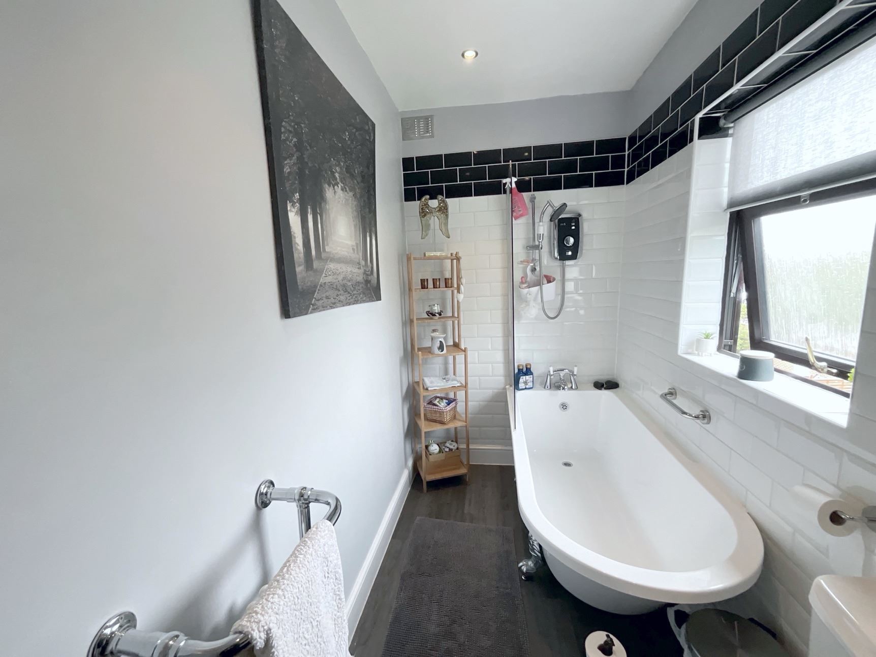 Upstairs, the first floor boasts two generous double bedrooms, BEDROOM ONE WITH SHOWER ROOM a charming third bedroom or ideal home office, and a luxurious bathroom with a freestanding bath and overhead shower – perfect for relaxing at the end of the day.