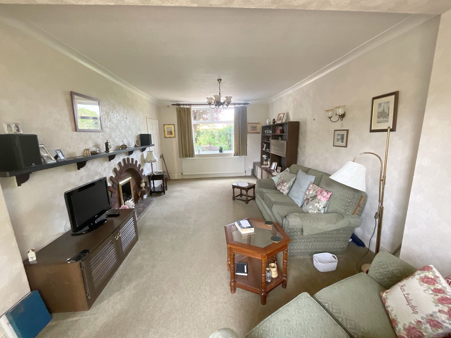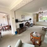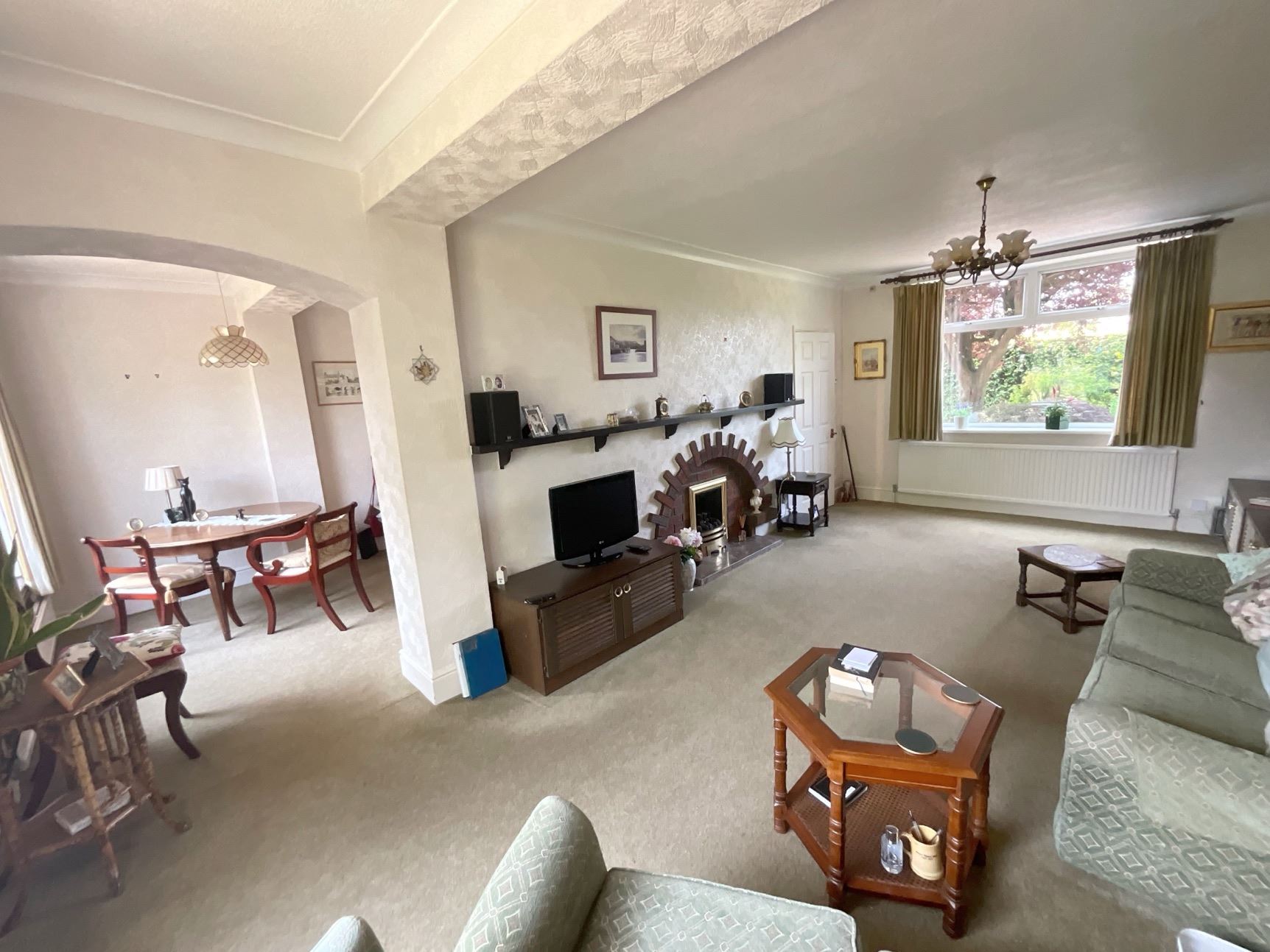 A large living room with an abundance of natural light, flowing into a dining room that enjoys lovely views over the picturesque rear garden