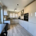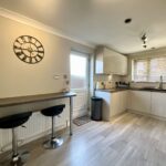The contemporary kitchen is fitted with sleek high-gloss wall, base, and drawer units, complemented by contrasting worktops. A four-point hob and eye-level oven are integrated, and a stylish breakfast bar provides casual dining space. A side door gives access to the exterior, while a convenient downstairs WC and courtesy door into the garage complete the ground floor.