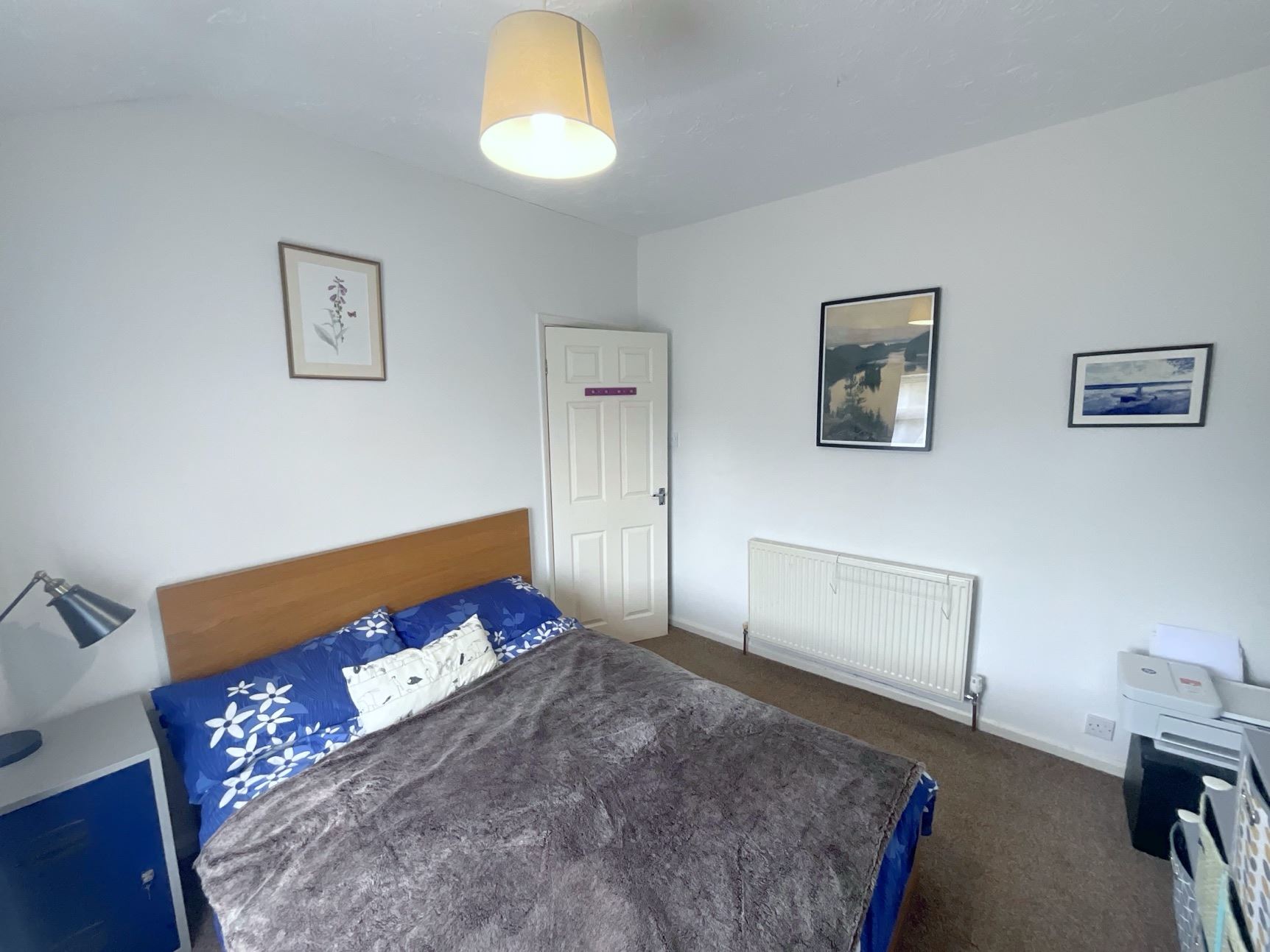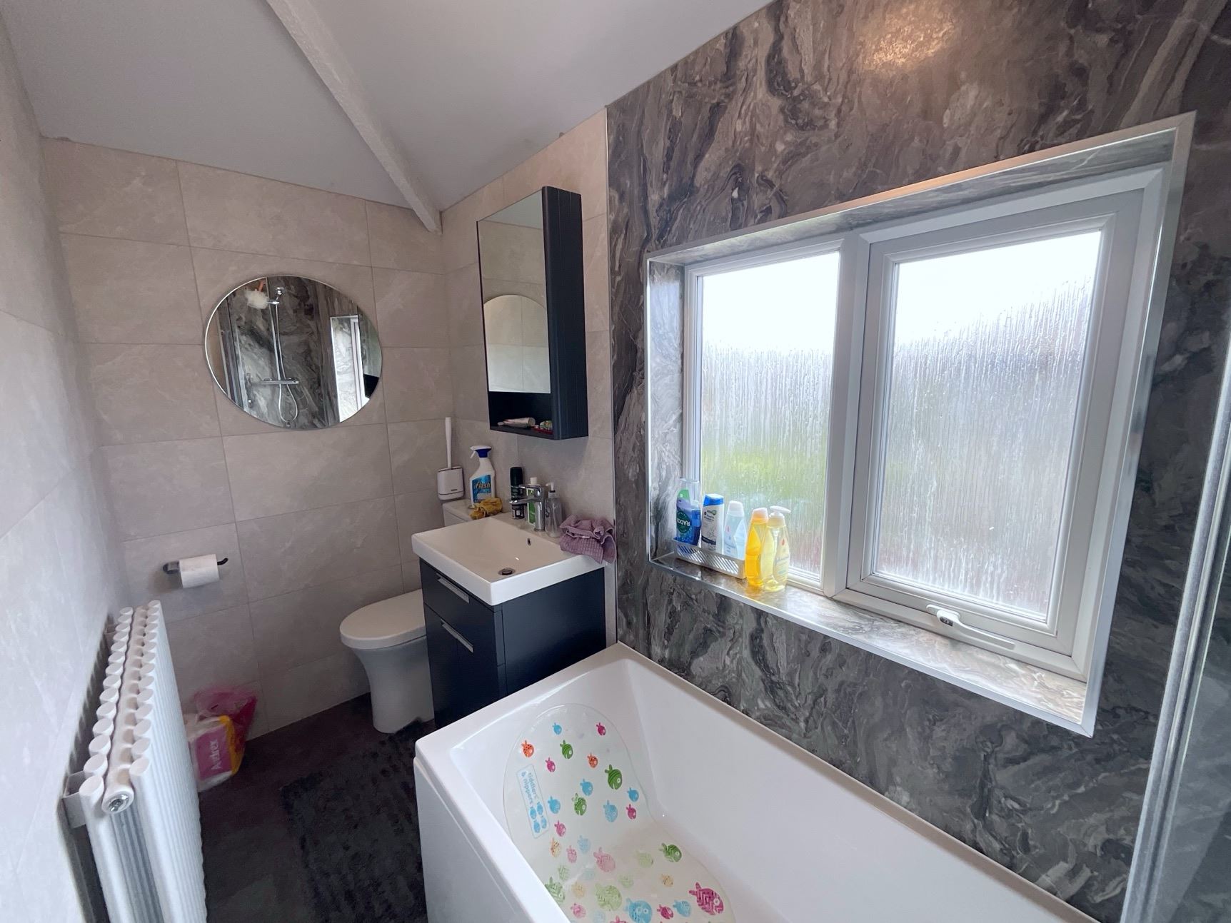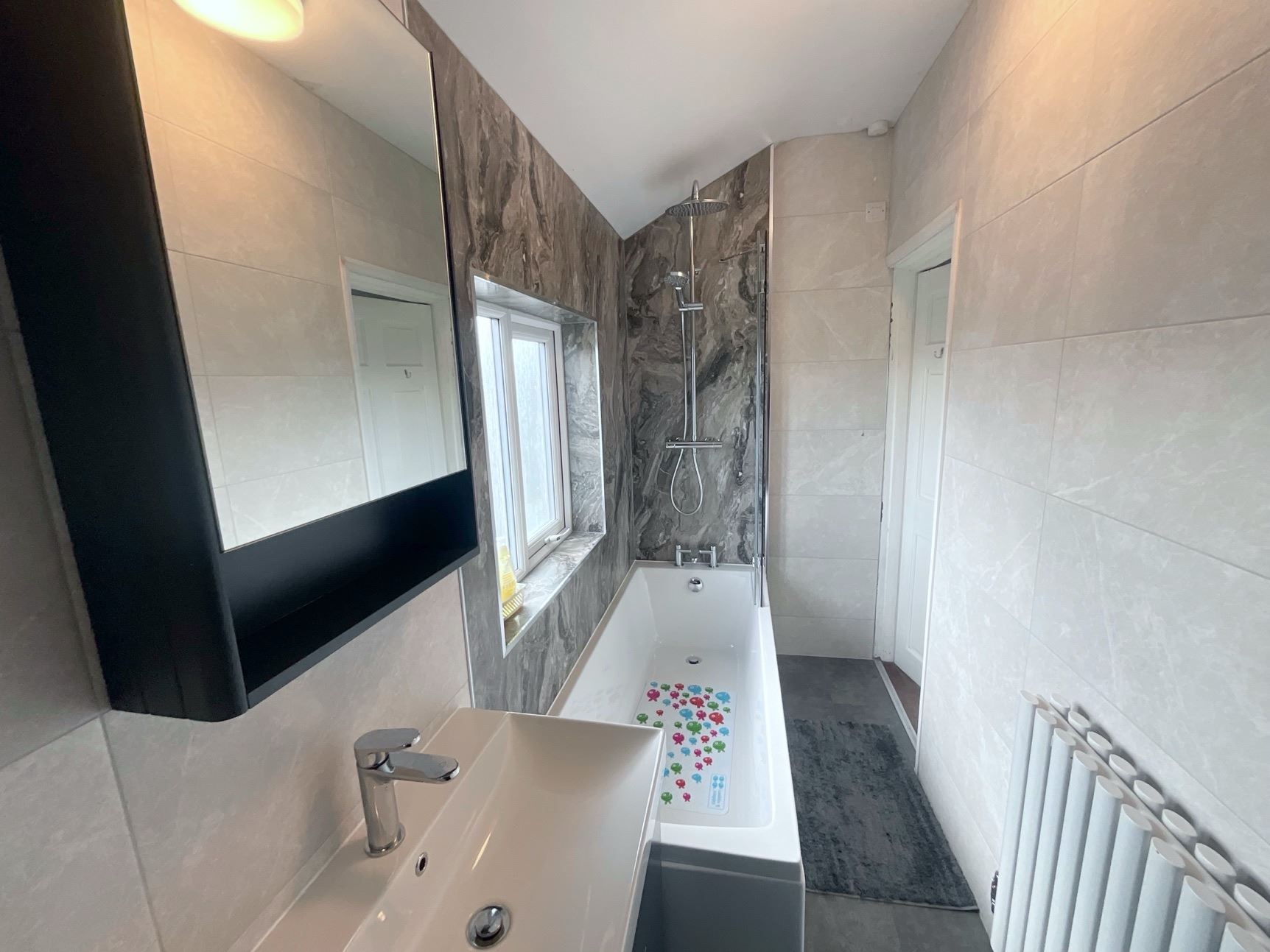 Upstairs, you'll find three generously sized bedrooms and a contemporary bathroom, fully tiled and featuring a white suite including a bath with shower over, a freestanding vanity unit with wash hand basin, and a low flush WC.