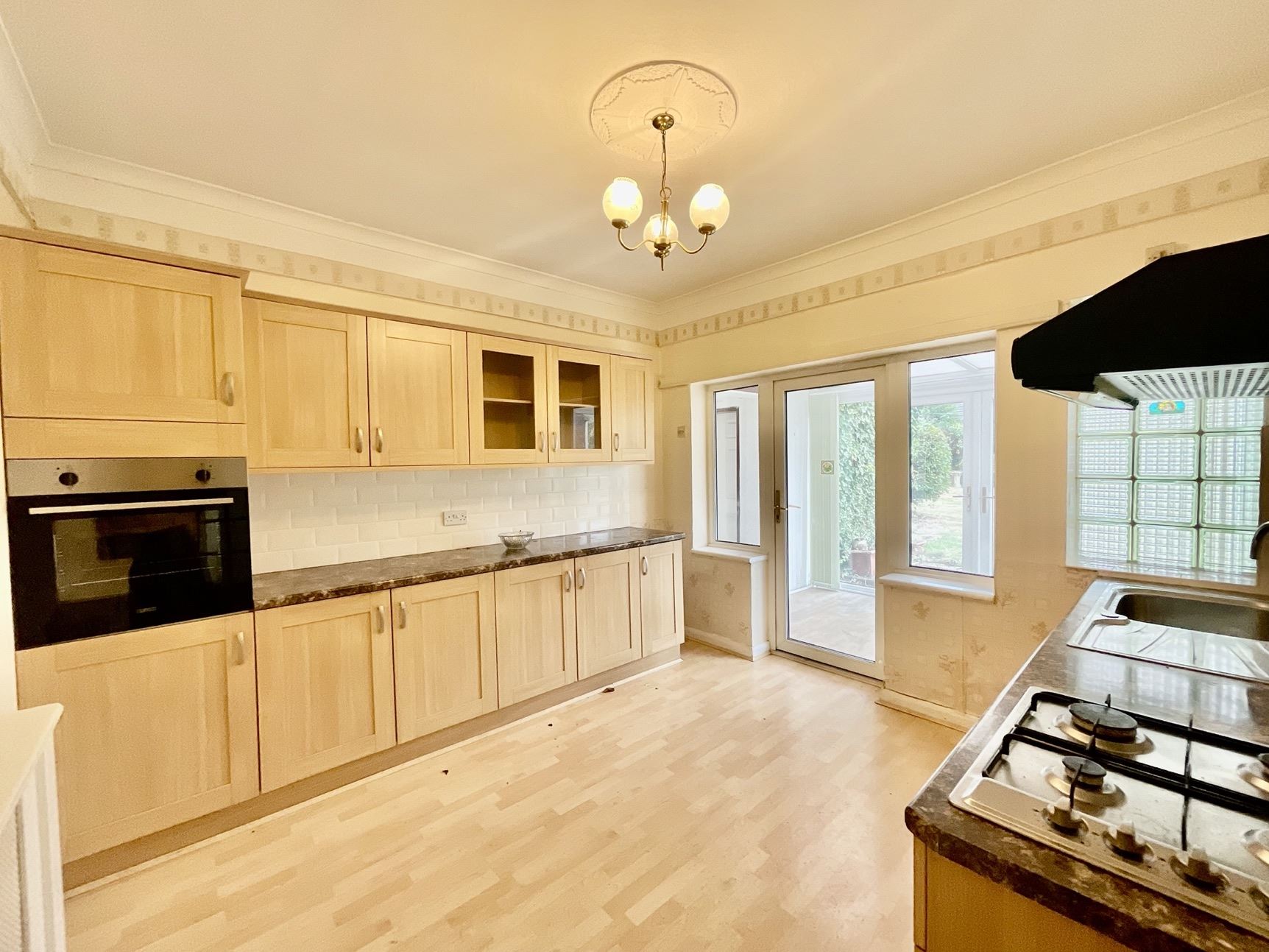 Kitchen with a range of wall and base units, leading through to a second conservatory