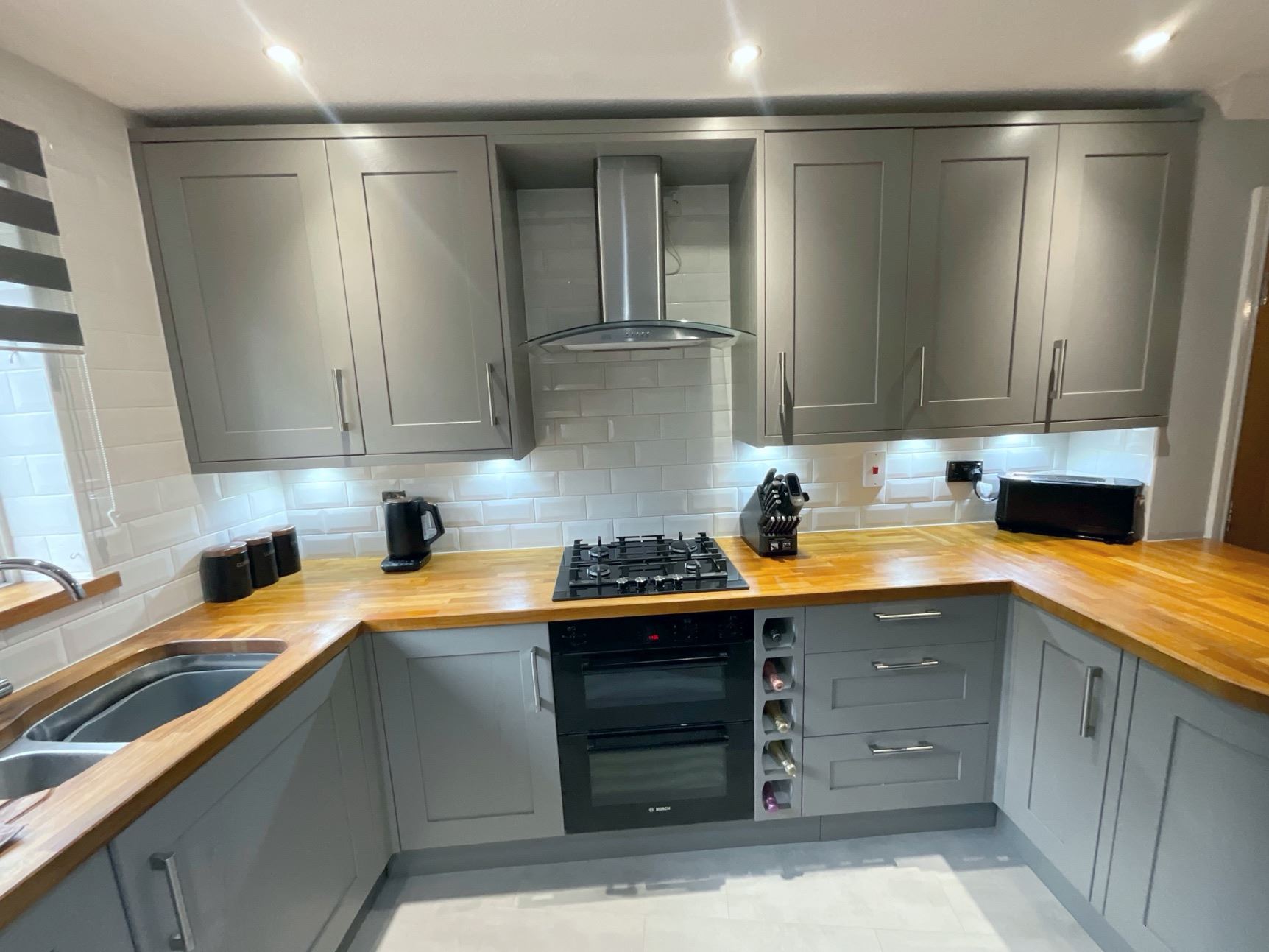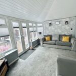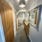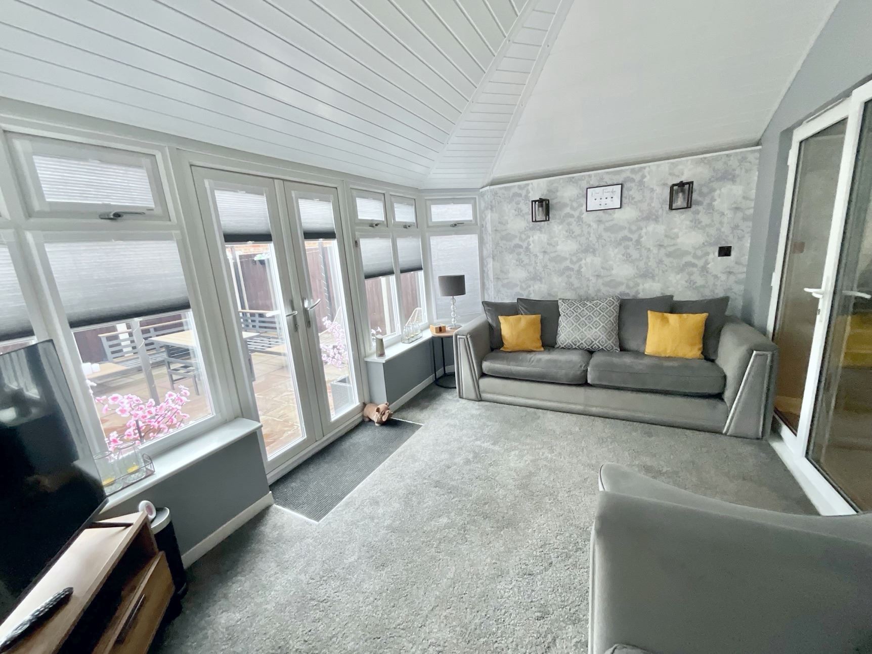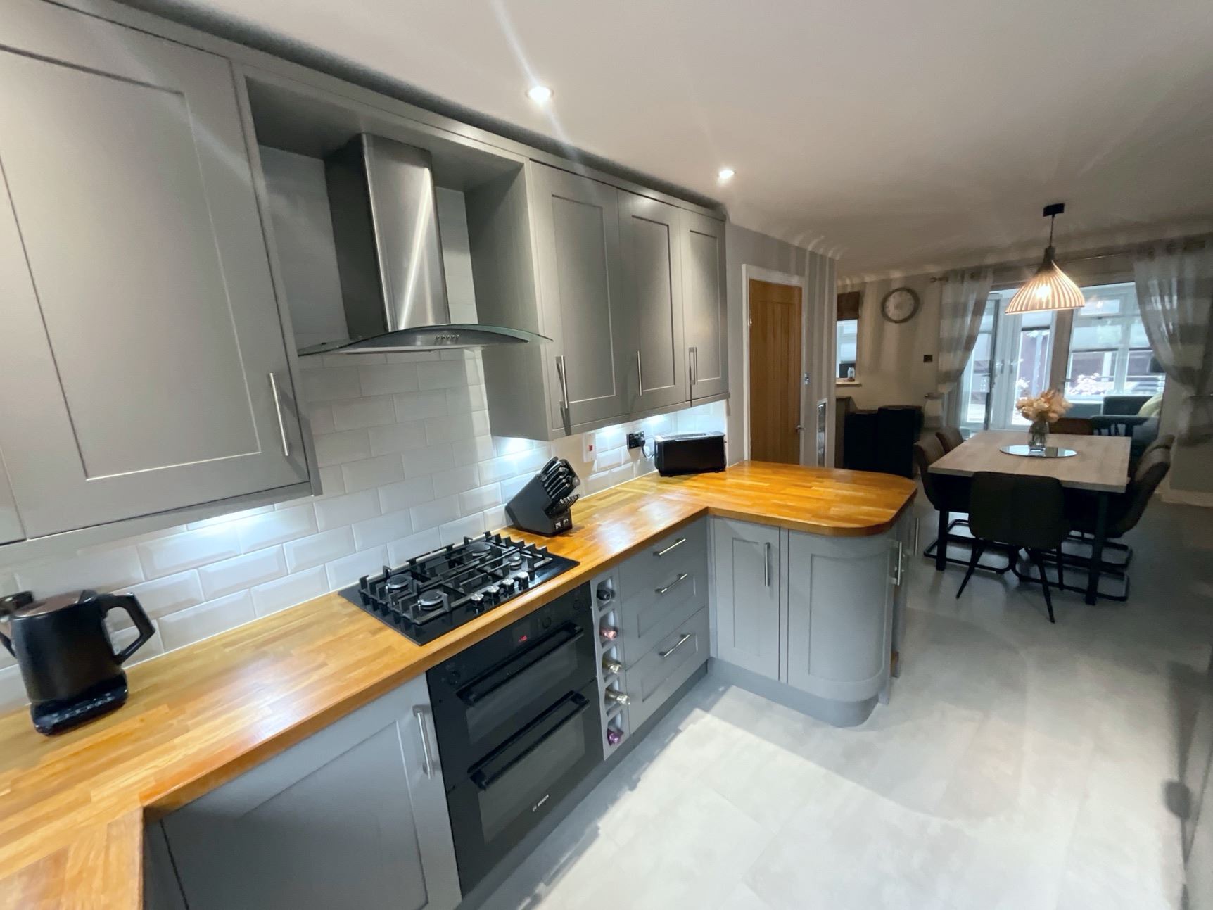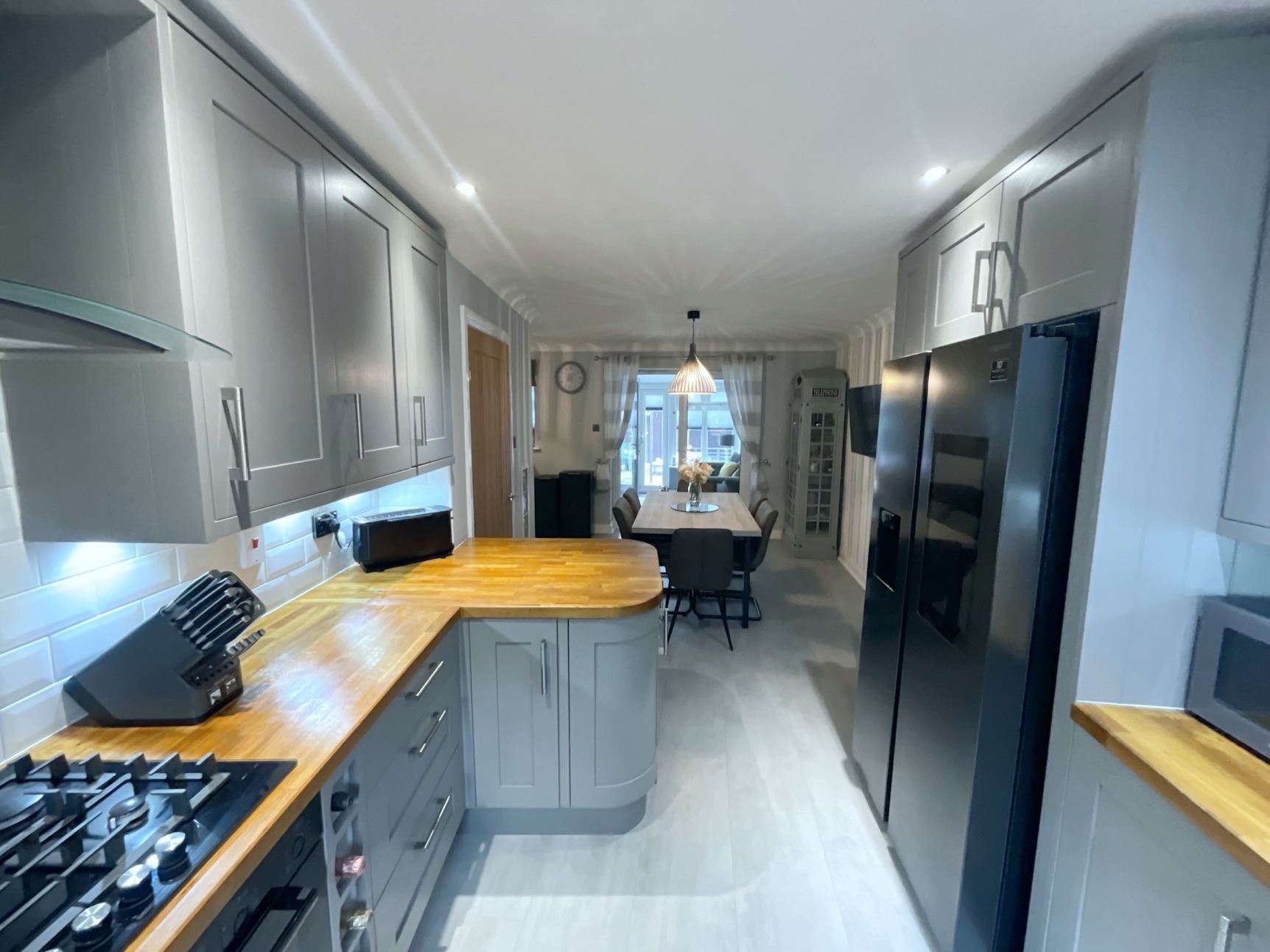 Step inside to a welcoming reception hall that leads to the heart of the home — a spectacular open-plan kitchen, dining and living area, ideal for entertaining and everyday life. The kitchen boasts solid oak cabinetry, sleek worktops, a charming Belfast sink, integrated appliances including oven, hob, dishwasher and washing machine — all seamlessly designed for a clean, modern look. The space flows effortlessly into a bright conservatory, where French doors open onto the beautifully landscaped rear garden, perfect for enjoying summer evenings or al fresco dining.
