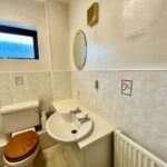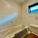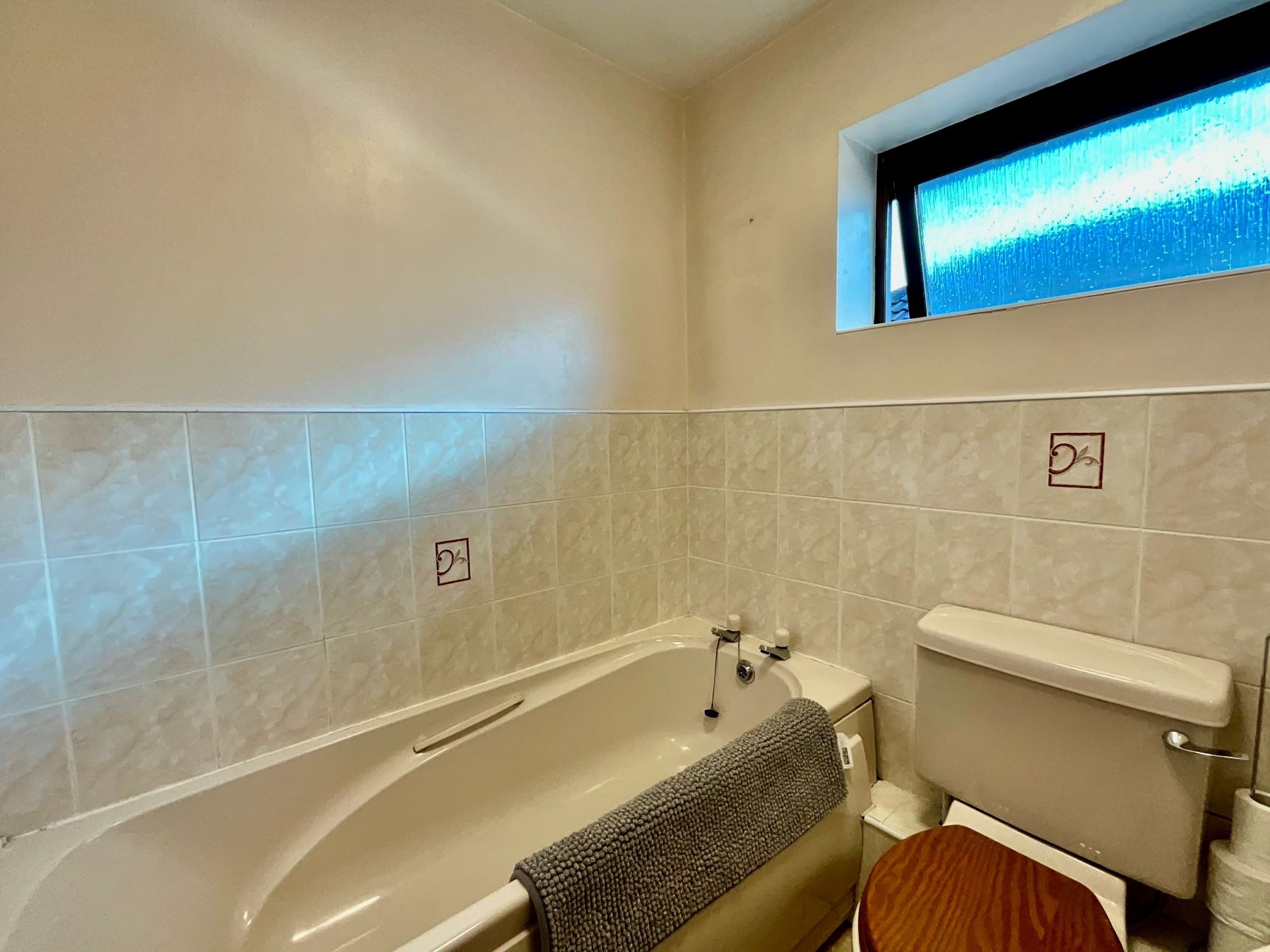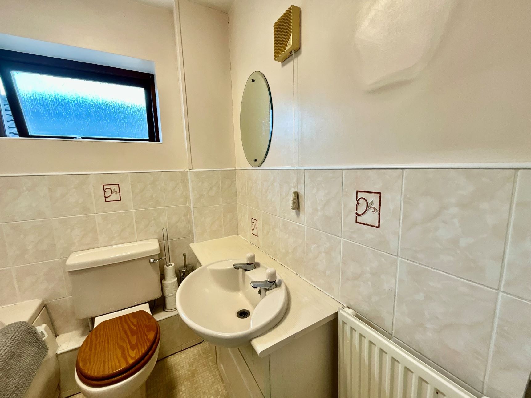 The family bathroom is fitted with a modern three-piece suite, featuring a wash hand basin and low flush WC and work in shower.