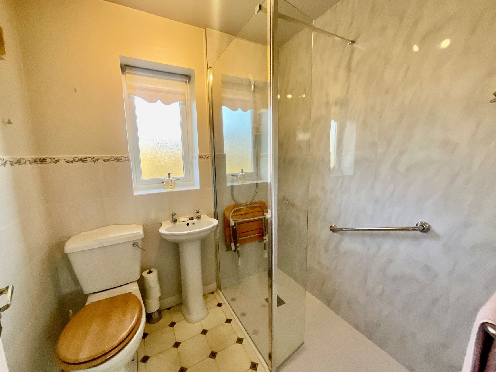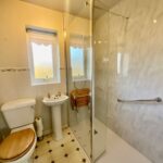 The family bathroom is fitted with a modern three-piece suite in white, featuring a wash hand basin and low flush WC and work in shower.