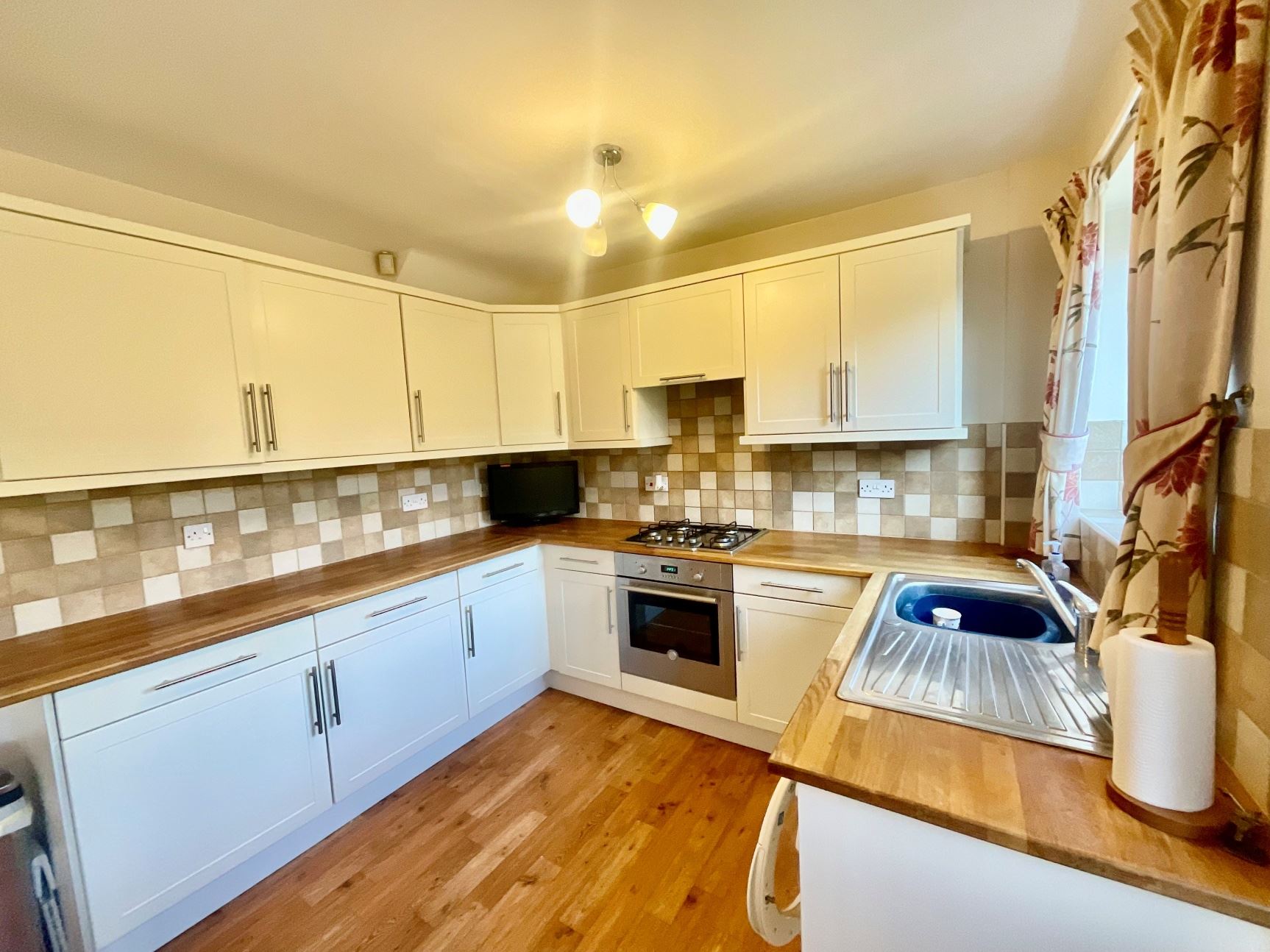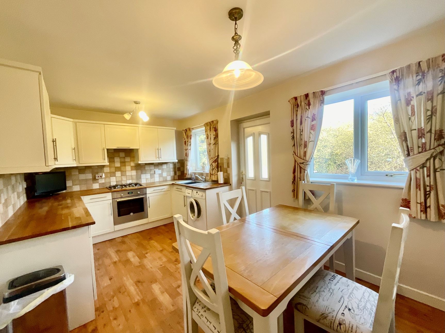 The accommodation comprises a welcoming entrance hallway leading into a front-facing lounge, featuring a feature fire and useful under-stair storage. The kitchen is fitted with a range of wall and base units with contrasting worktop. Rear door opens out to the rear garden, allowing natural light to flood the space and offering a seamless connection to the outdoors.