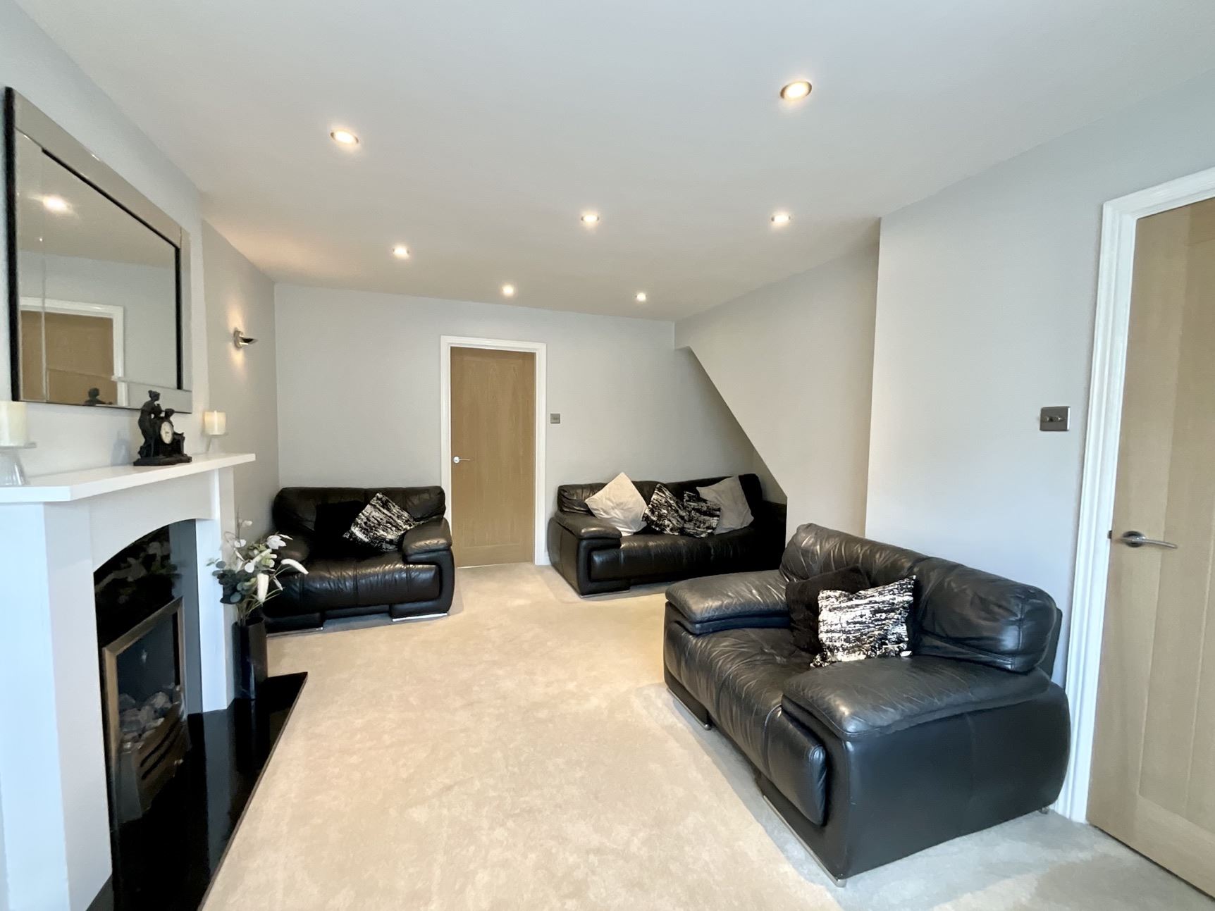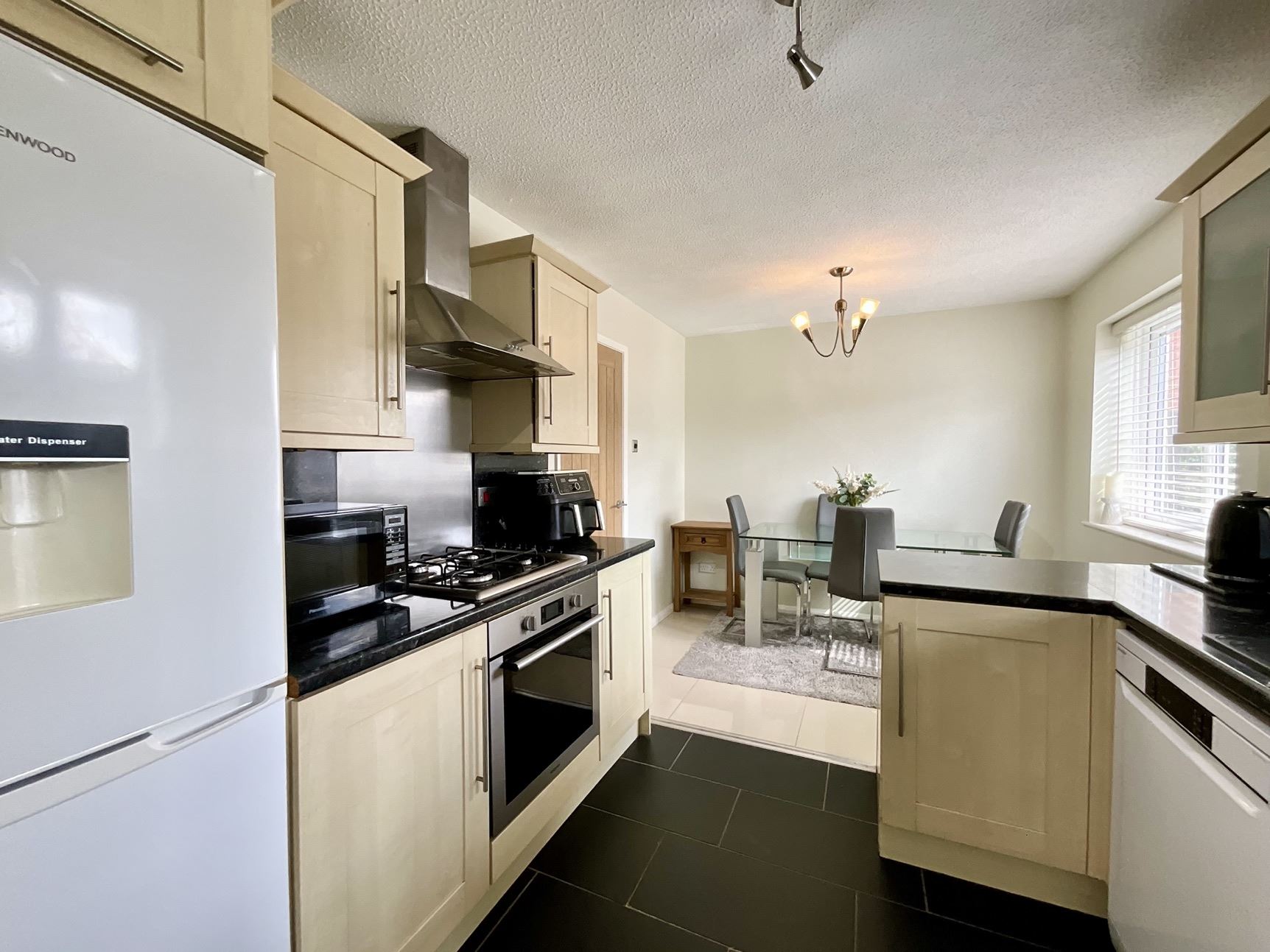 A composite door opens into the welcoming hallway with stairs rising to the first floor landing. The lounge is a standout feature, with a bay window allowing natural light to fill the room and a feature fireplace adding warmth and character. The kitchen/dining room is fitted with a range of wall and base cabinets, complemented by contrasting work surfaces. There is ample space for a dining table and chairs, making it an ideal area for family meals and entertaining. The utility room offers additional storage and convenience, with a continuation of the kitchen's cabinetry. A door from the utility room opens directly onto the rear garden, enhancing practicality. A useful downstairs WC adds to the convenience of the home.