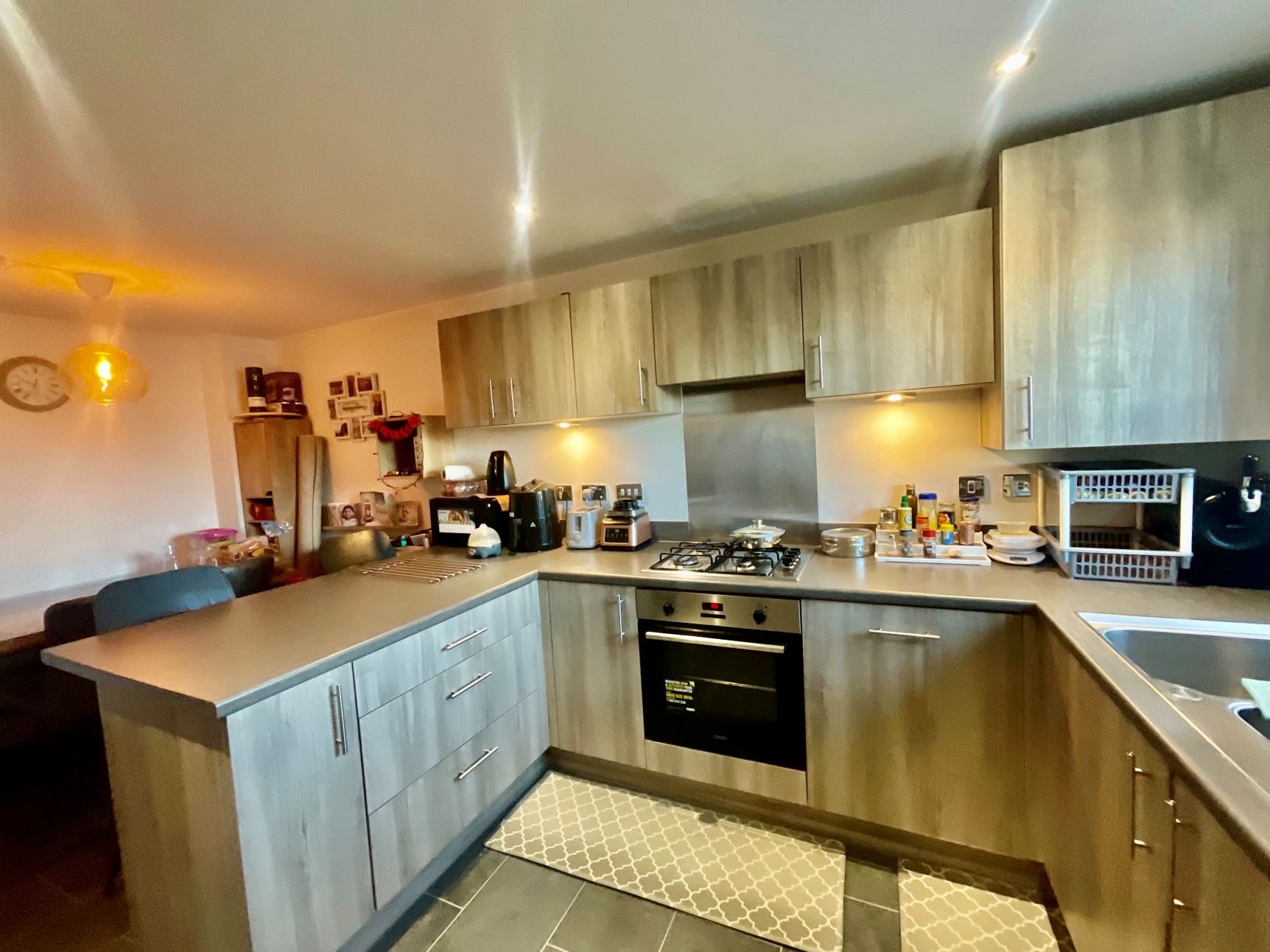 On the ground floor, you'll find a bright and spacious lounge/dining area flooded with natural light, featuring patio doors opening onto the private landscaped garden — perfect for entertaining or relaxing on summer evenings. The stylish high-gloss kitchen is fitted with quality integrated appliances and sleek finishes, while a convenient cloakroom/WC completes the floor.