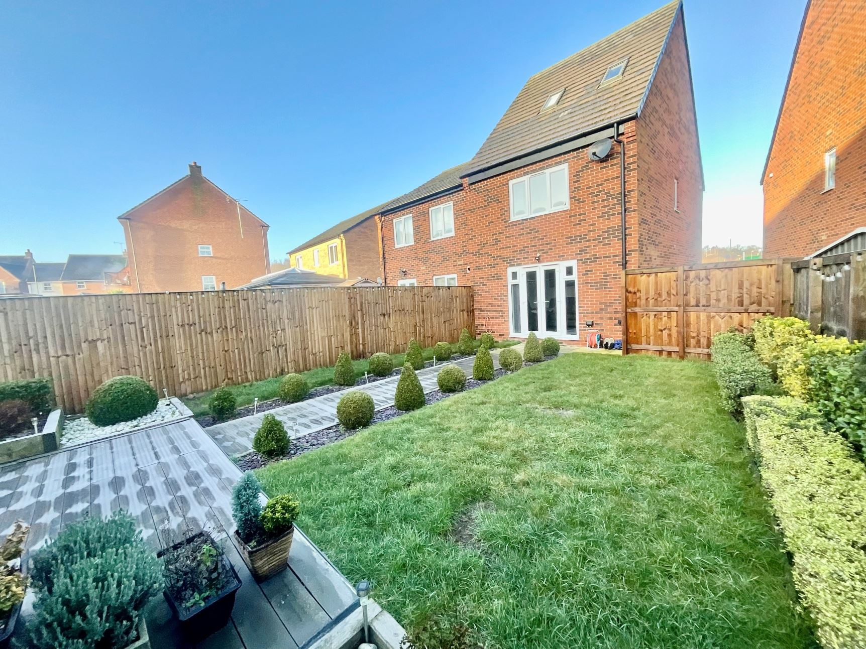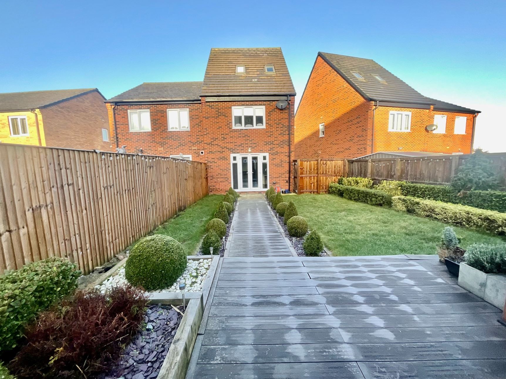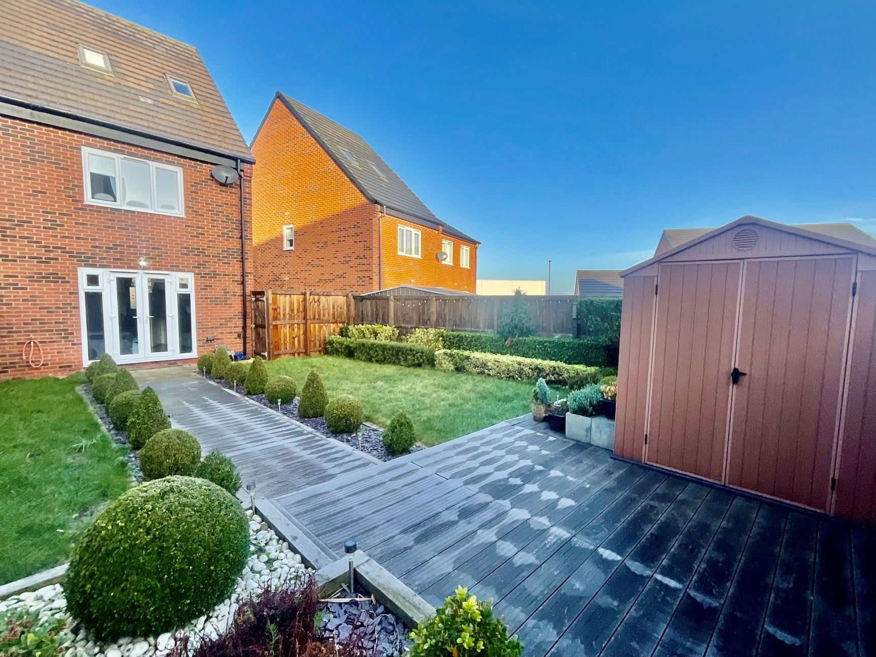 Outside, the property continues to impress with a beautifully landscaped rear garden, featuring a lawn and raised decking area, ideal for outdoor dining and family time. A double driveway provides ample off-road parking.